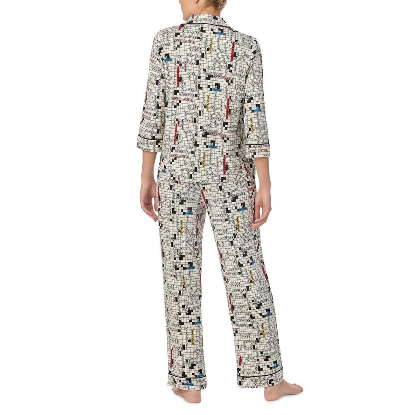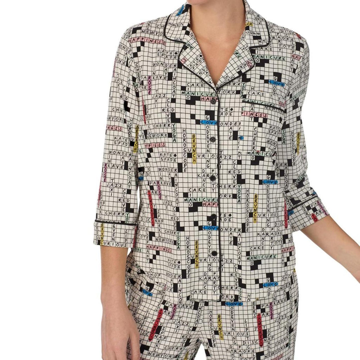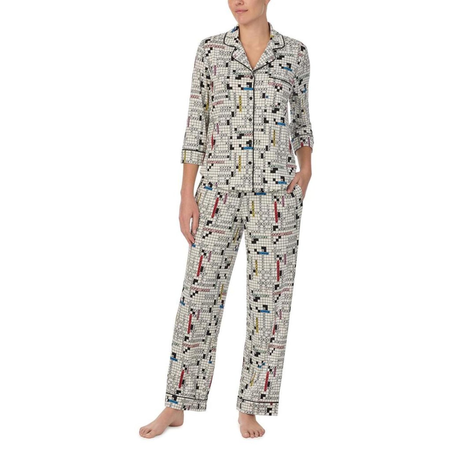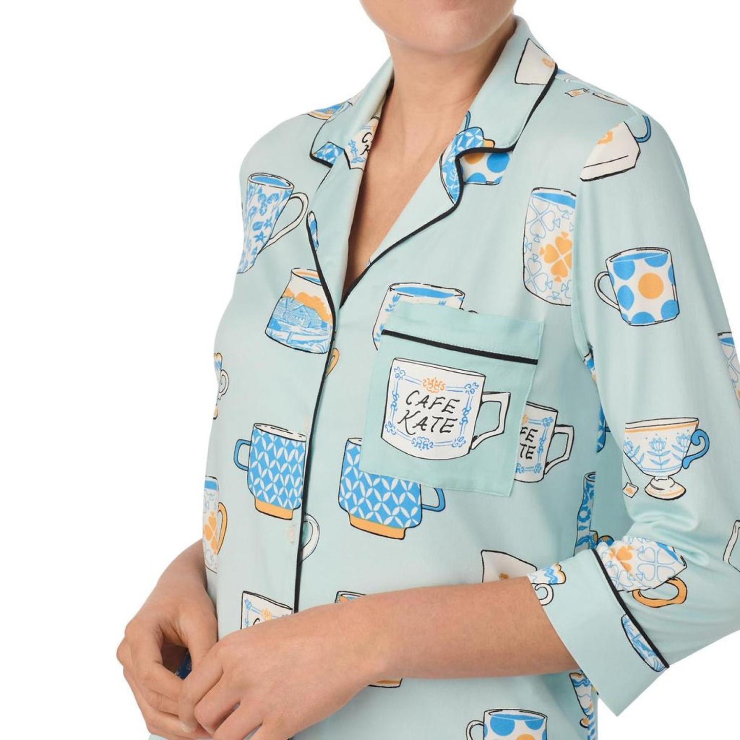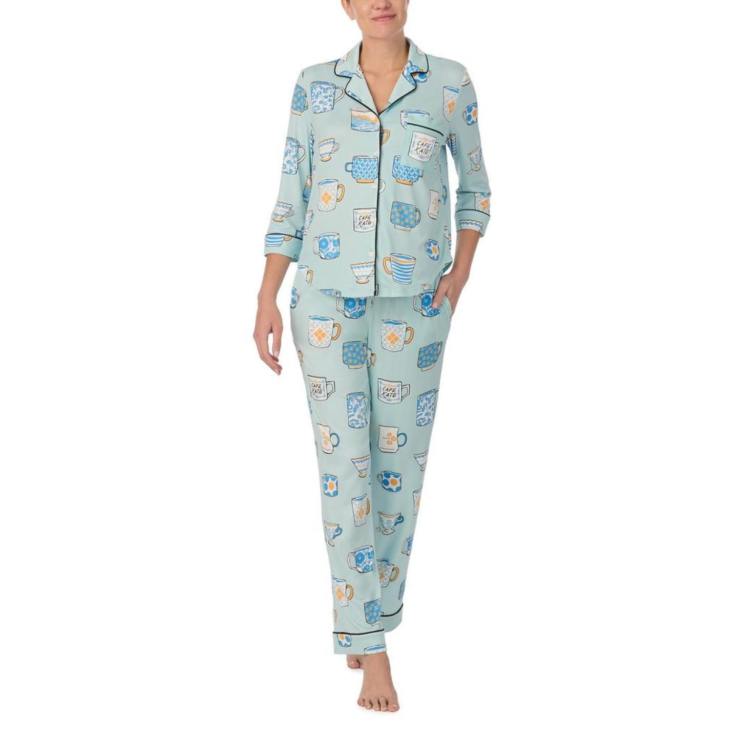 • Enjoy a sweet slumber in the cozy Kate Spade New York® Long 3/4 Sleeve PJ Set. The top features a notch collar with a front button-closure, three-quarter sleeves, chest pocket, contrast piping on the neckline and cuffs, shirttail hem, and allover print. The pull-on style bottoms offer an elastic waistband with side hand pockets, contrast piping at the cuffs and allover print.