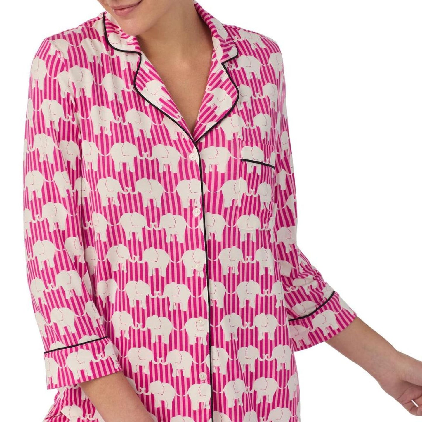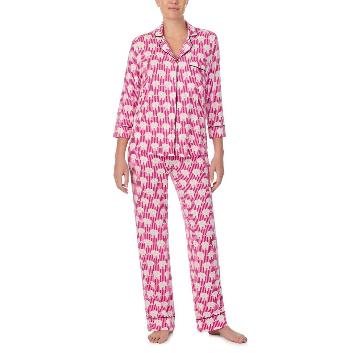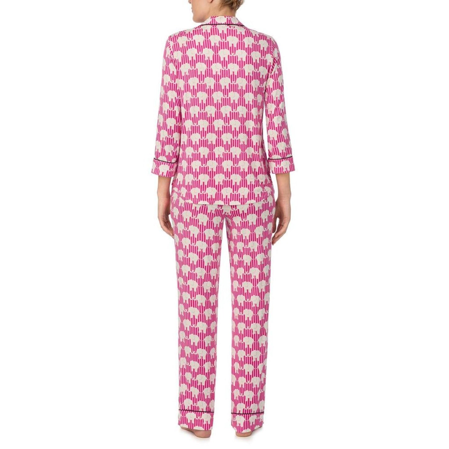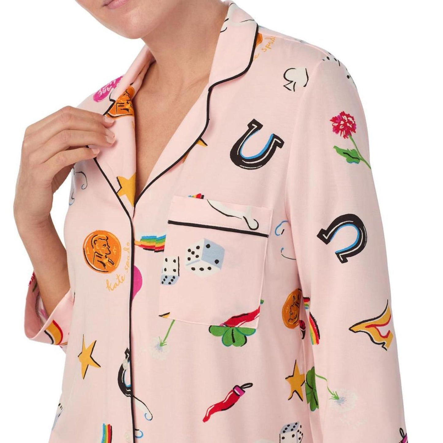 Flaunt a cute look as your dress up for a luxurious nighttime routine wearing the Kate Spade New York® Long 3/4 Sleeve PJ Set. The shirt features a notch collar, full-button closure, one patch pocket on the left chest, and long three-fourth sleeves. The matching pajamas feature an elasticated waistband and a full-length silhouette. The allover quirky print on the shirt and pajamas along with contrasting piping adds style to the look.