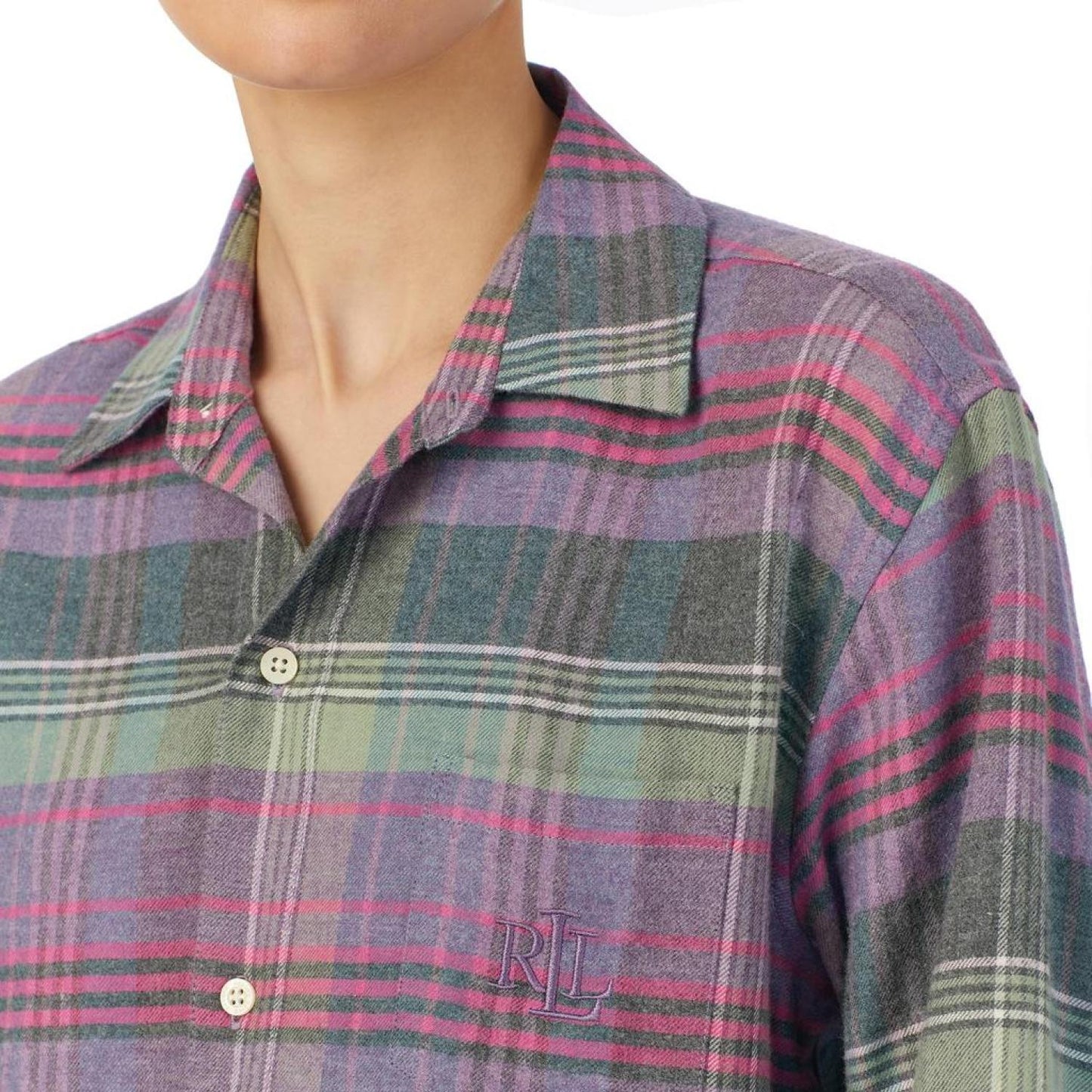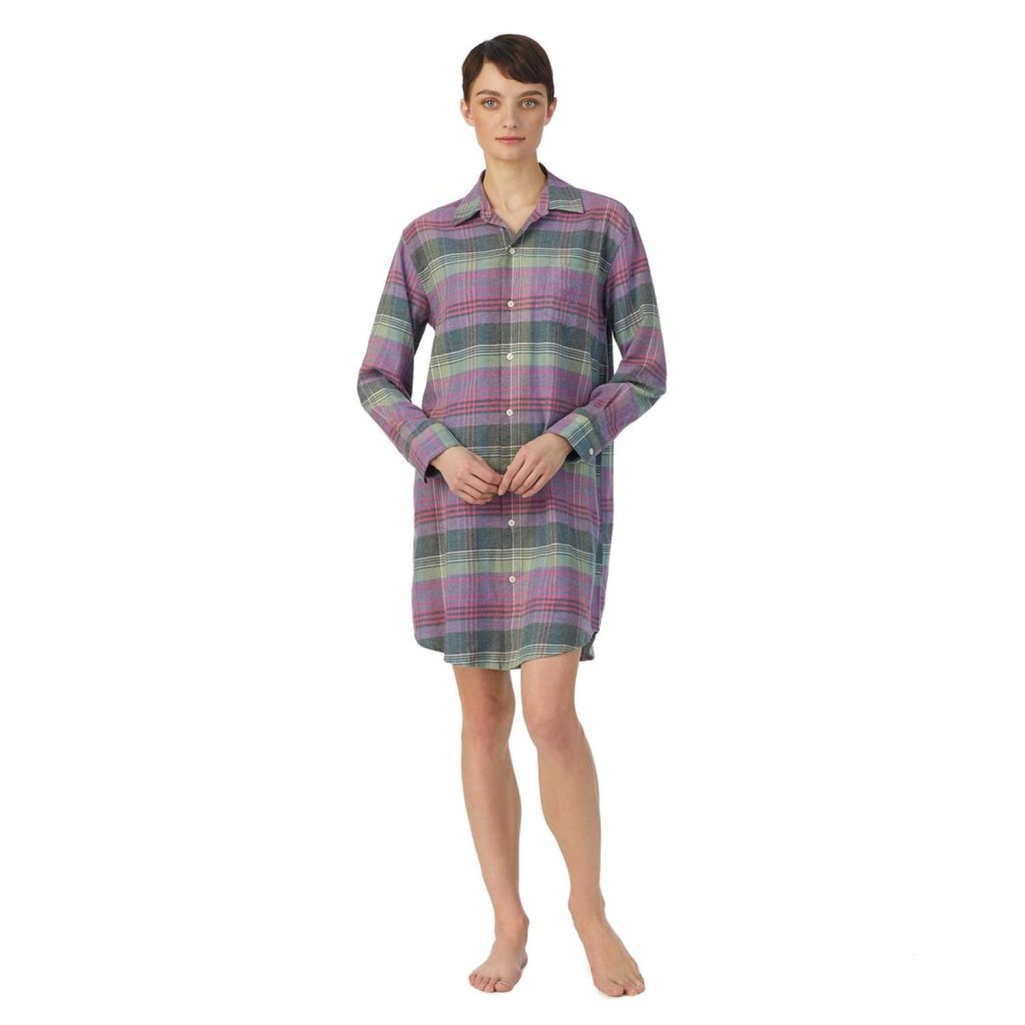 Enjoy restful sleep all night in the ultra-comfy plaid pattern LAUREN Ralph Lauren® Long Sleeve His Shirt Sleepshirt. This above-the-knee long shirt features a collared neckline and long sleeves with dropped shoulders and buttoned cuffs. Also features a functional patch pocket with embroidered brand logo on the left chest and buttoned front closure. Shirttail hemline. 55% cotton, 45% viscose Machine wash, tumble dry. Imported.