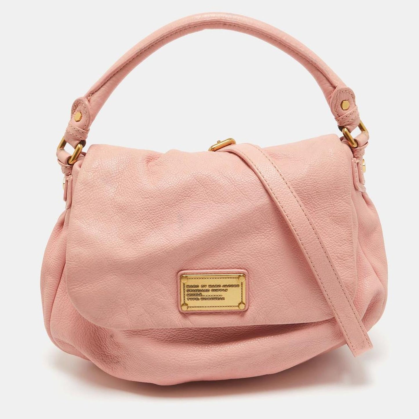 • This classic Q Lil Ukita bag from Marc by Marc Jacobs is a fashion ally. It is crafted from pink leather featuring a single rolled handle and a removable shoulder strap. The bag is accented with a gold tone logo plaque on the front flap. The fabric interior features a zip pocket.