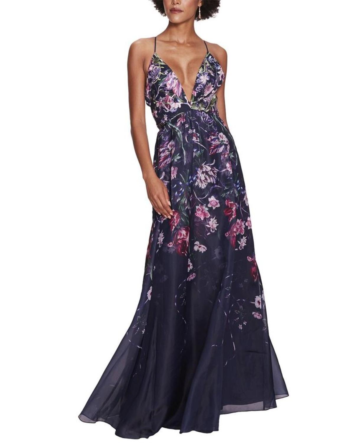 Elevate your evening attire with the Marchesa Notte Printed Dress. This stunning gown is perfect for gowns and cocktails for that special night. Featuring a navy multicolor print, this dress measures approximately 64 inches from shoulder to hem. It is designed with a center back zipper for easy wear. Crafted from 100% polyester, this dress must be dry cleaned only. Imported from the luxury brand Marchesa Notte, this dress is a must-have for your next formal event.