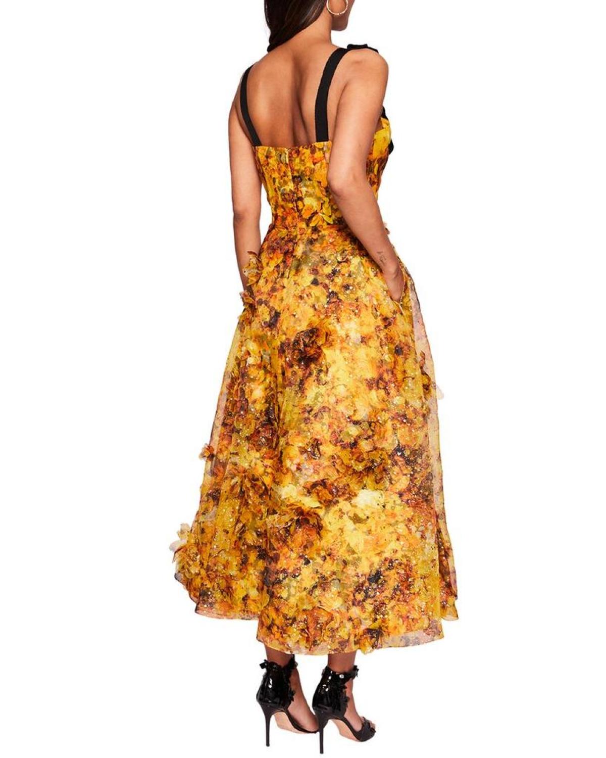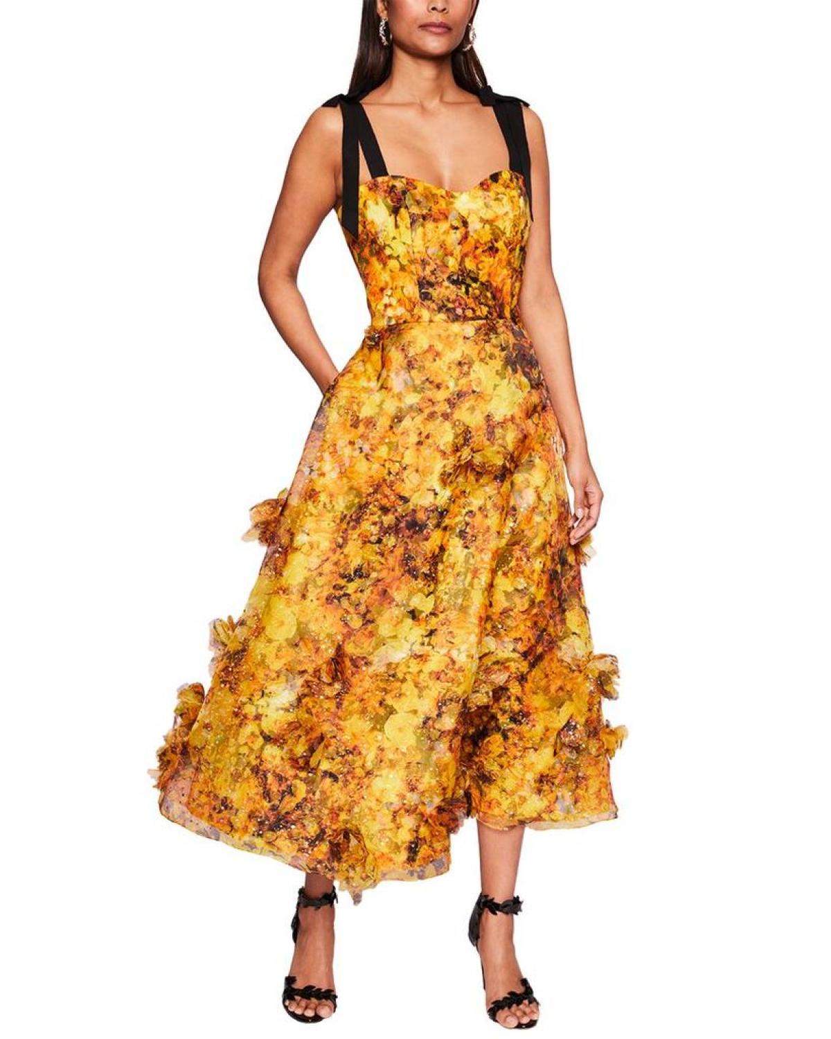 Introducing the Marchesa Notte Printed Dress, a stunning piece from the renowned brand known for its exquisite gowns and cocktail dresses perfect for any special occasion. This eye-catching dress features a vibrant yellow and gold print, making it a standout choice for any event. With a length of approximately 50 inches from shoulder to hem, this dress is designed to flatter your figure. The center back zipper ensures a seamless fit, while the 100% polyester material offers comfort and durability. For best care, dry clean only. Made in a high-quality design, this imported dress is sure to turn heads wherever you go. Elevate your wardrobe with the Marchesa Notte Printed Dress and be the best-dressed guest at any event.