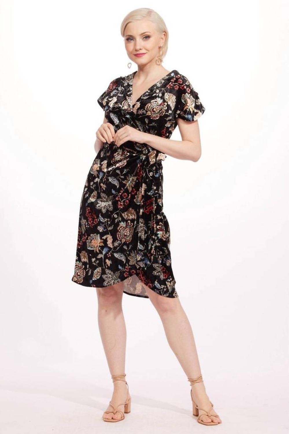 A short and breezy dress for those warmer days.Look velvet-ly gorgeous in this Marika Dress! With its faux wrap sleeve and side ties, it'll be sure to keep you in style no matter the occasion. Stand out from the crowd and show off these pretty flowers with this knee-length velvet dress.