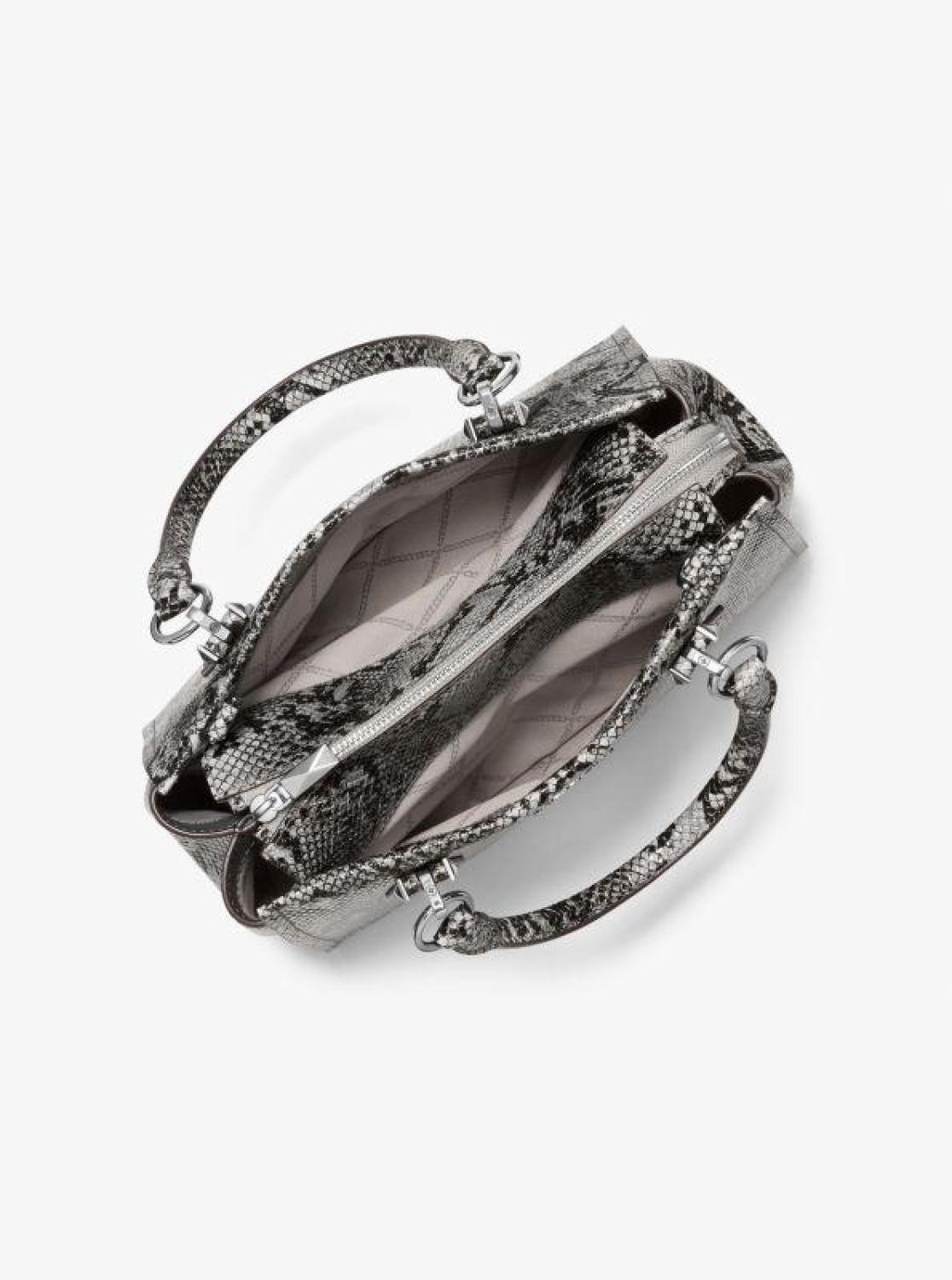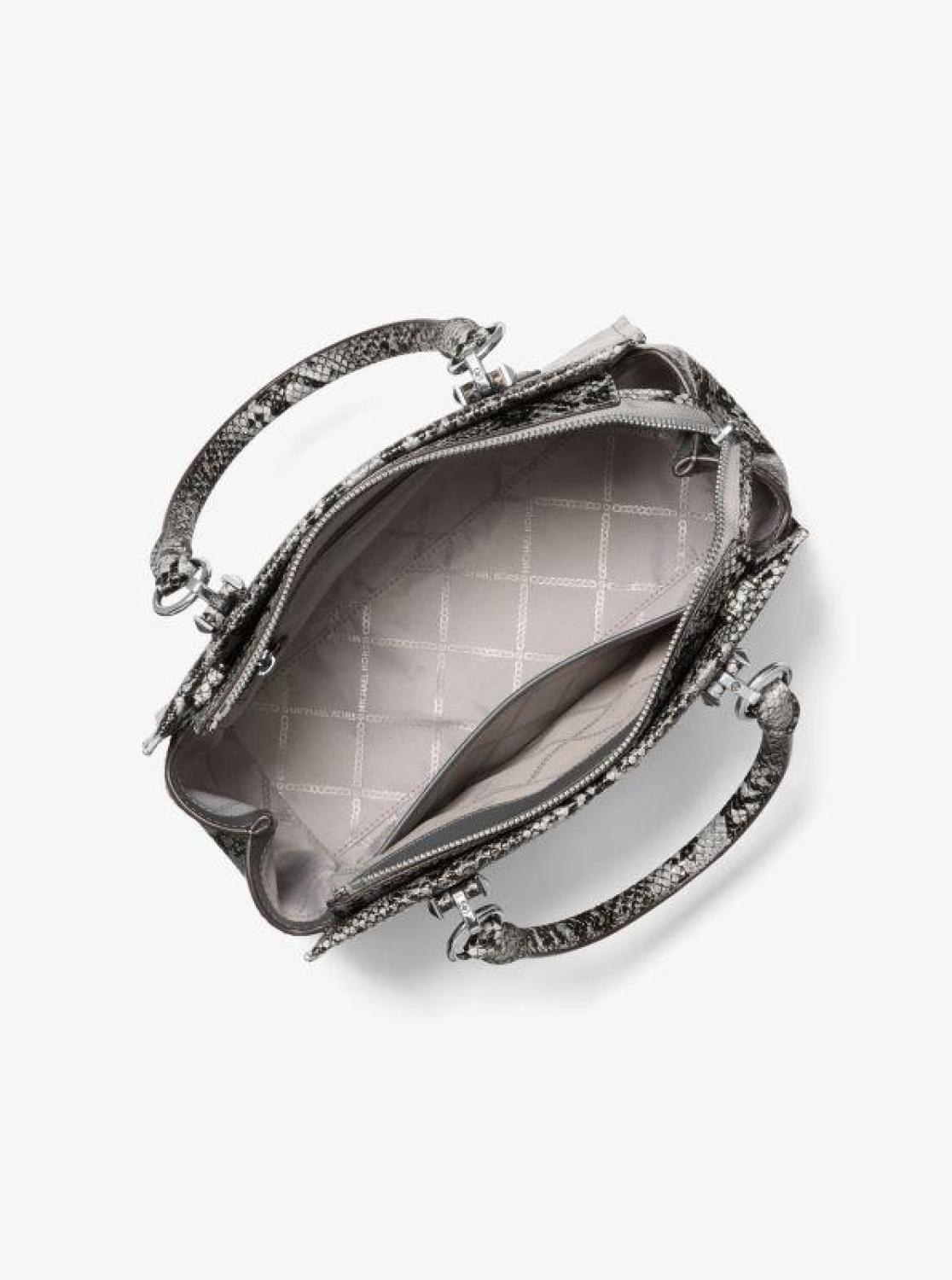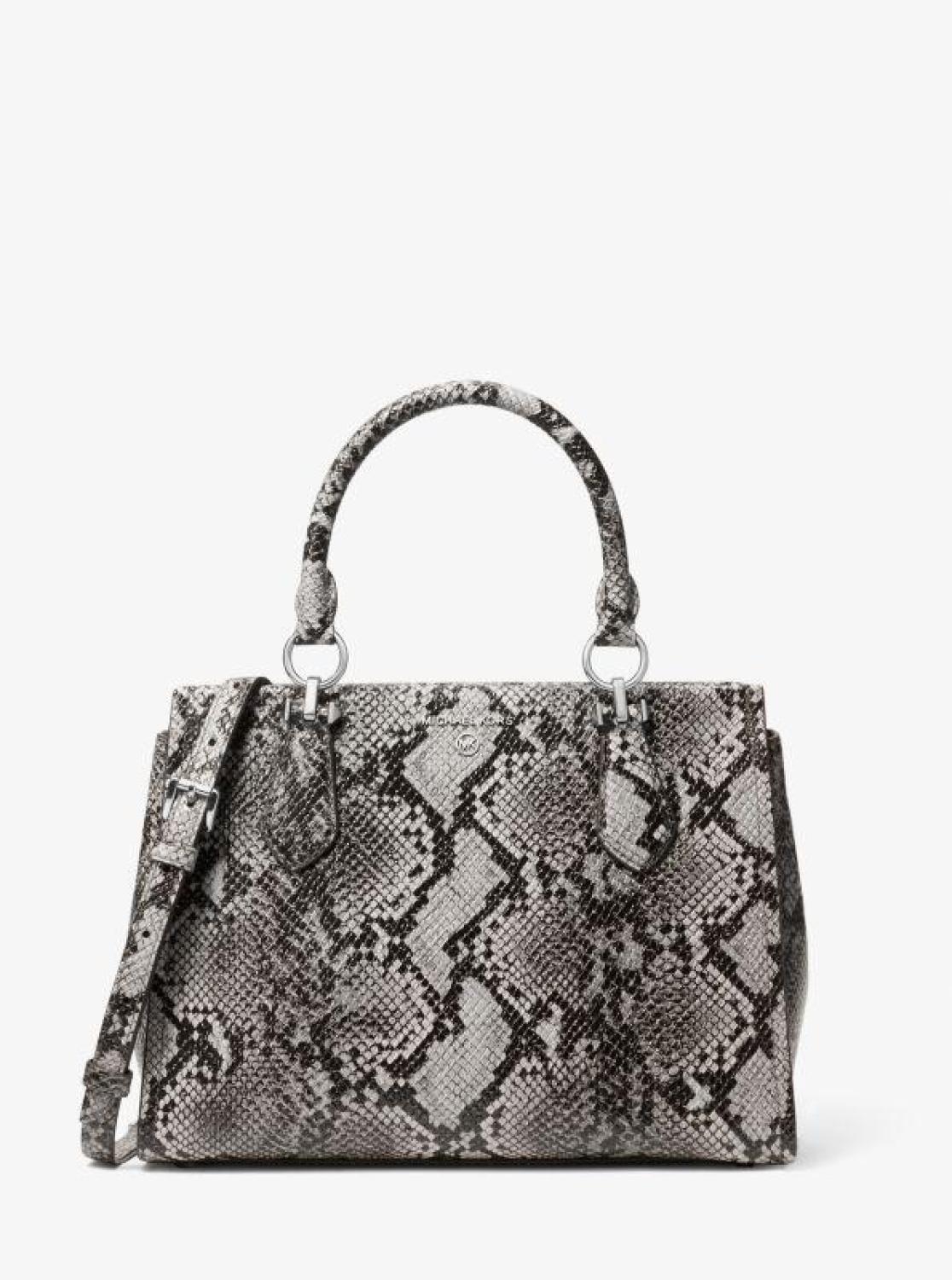 • A compact carryall that can still hold all the essentials, our leather Marilyn satchel is the epitome of polished ease. Defined by a snake-embossed finish, it opens to a lined interior with dedicated pockets for your phone, wallet and other small items. Attach the adjustable shoulder strap to wear it crossbody.