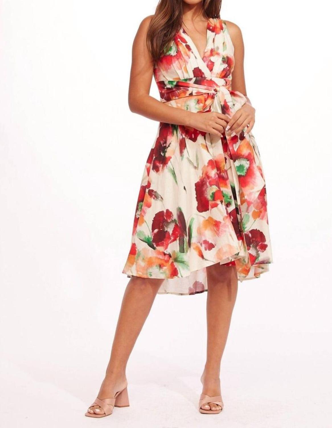 • A midi dress so versatile, your options for wearing it are endless.Fun and flirty fit and flare dress with printed floral details. Pleated V neck. Empire waist. Self tie waist belt. Side zip. Self tie at back neck. Circle cut out back. Cotton; Polyester lining. Hand wash.