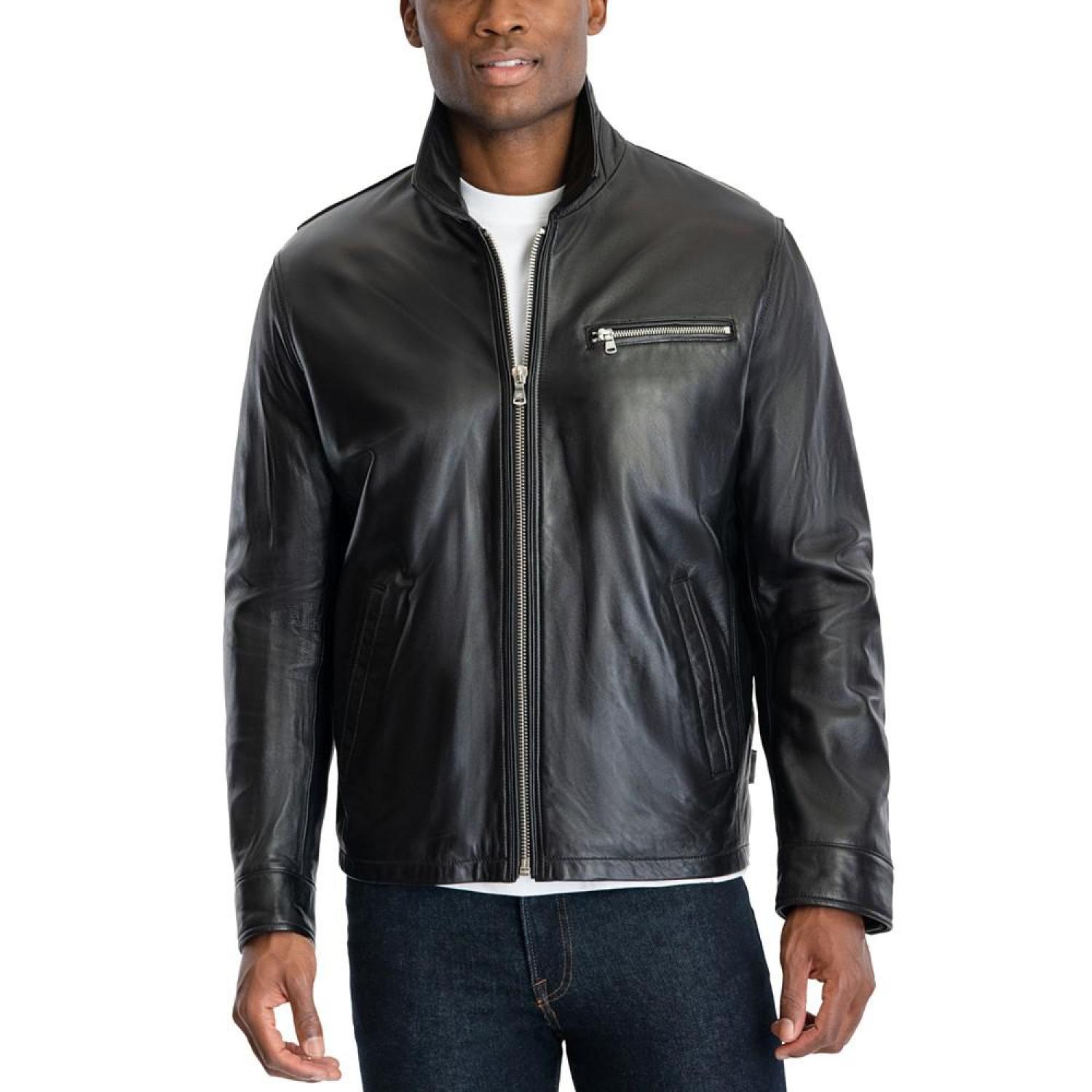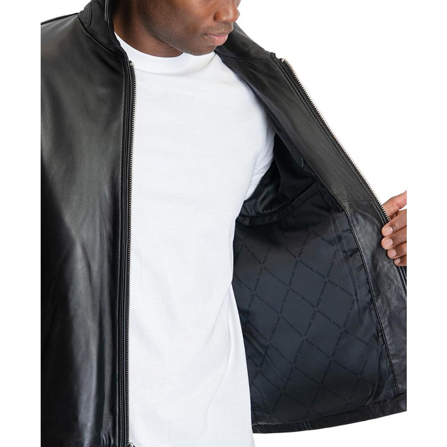 Go for time-tested style with this leather jacket from MICHAEL Michael Kors, in rich leather with a quilted lining for added comfort. Point collar Zipper closure at front Long sleeves with adjustable snap cuffs Zip pocket at chest; welt pockets at front Lightly quilted insulated lining Shell: leather; body, sleeves lining and insulation: polyester Dry clean Imported