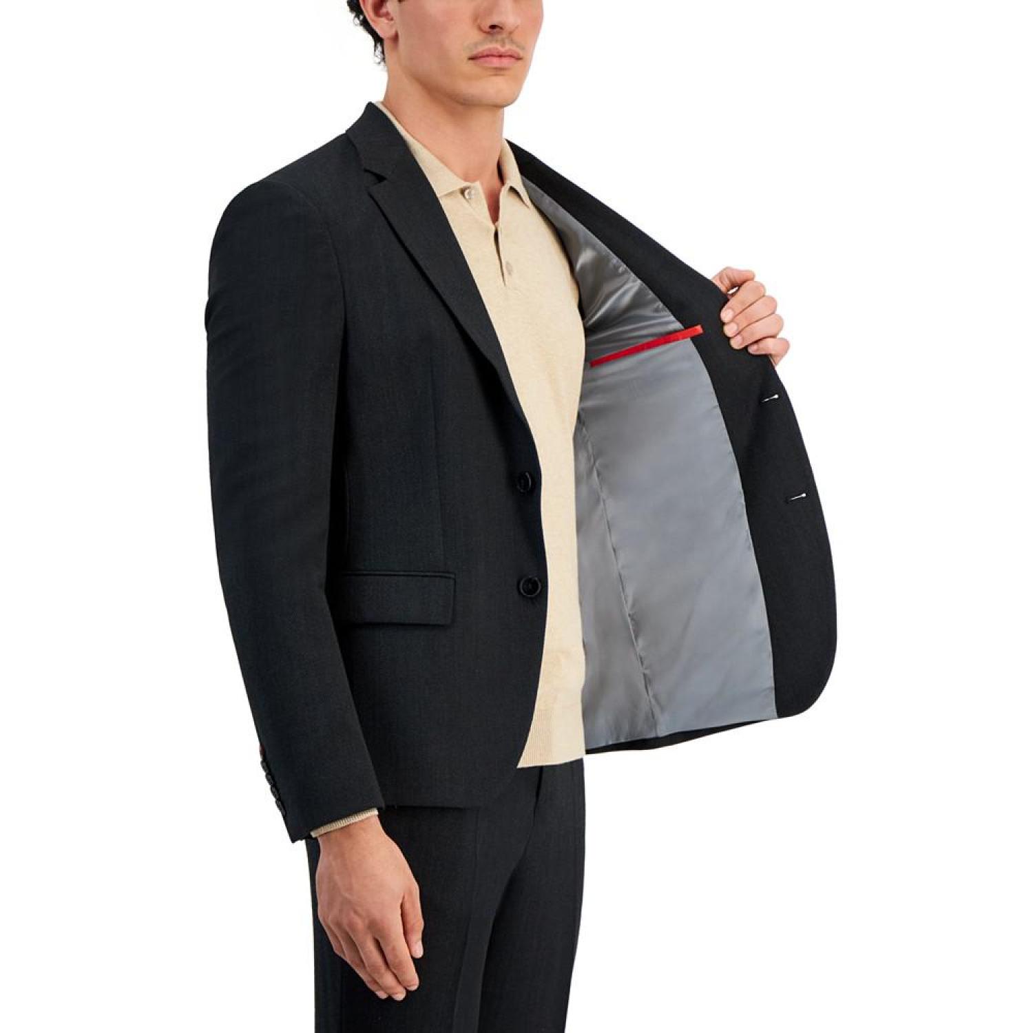 An elegant herringbone pattern joins forces with modern-fit design to bring you this charcoal suit jacket from HUGO by Hugo Boss. Pair it with matching trousers for a top-to-bottom ensemble. Modern fit Notched lapels Button closure Two buttons Kissing buttons at the cuff Flap pockets Welt pocket at chest Inside welt pockets Fully lined Shell: polyester, wool, elastane; lining: polyester Dry clean Imported