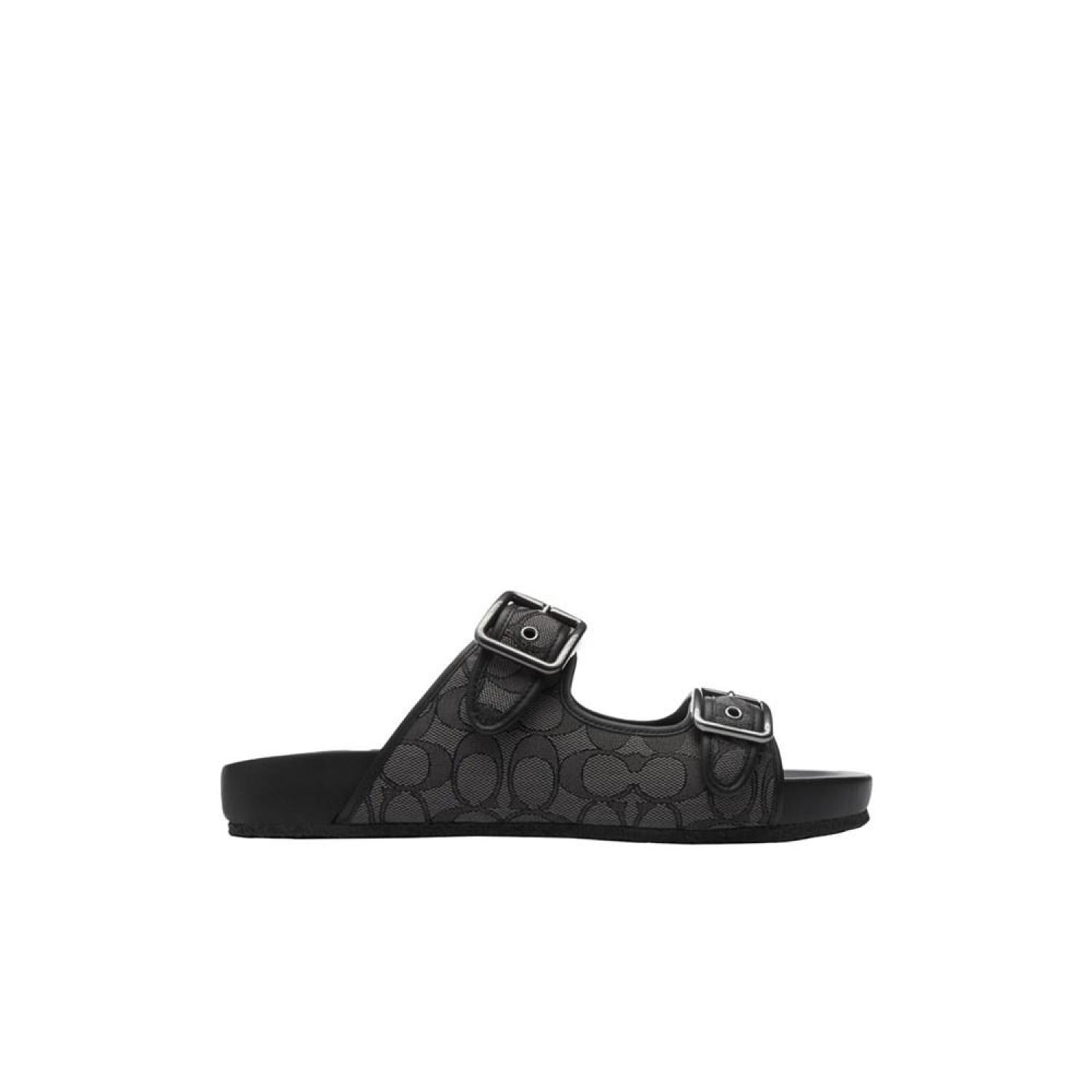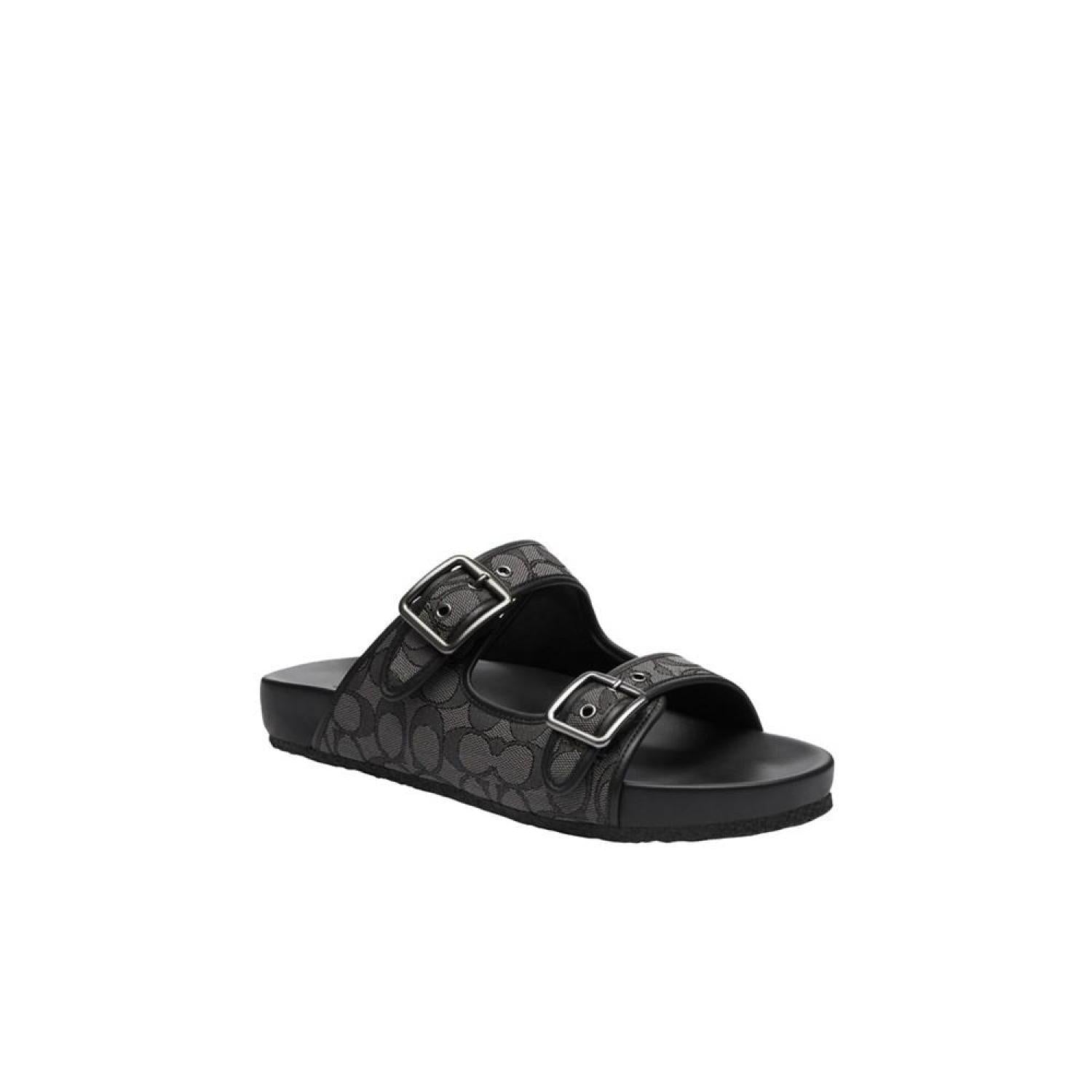 An easy, slip-on design, this double buckle strap sandal is a sporty laidback style. Crafted of Signature jacquard and smooth leather, it's finished with a comfortable molded footbed and a lightweight rubber crepe outsole for added traction.