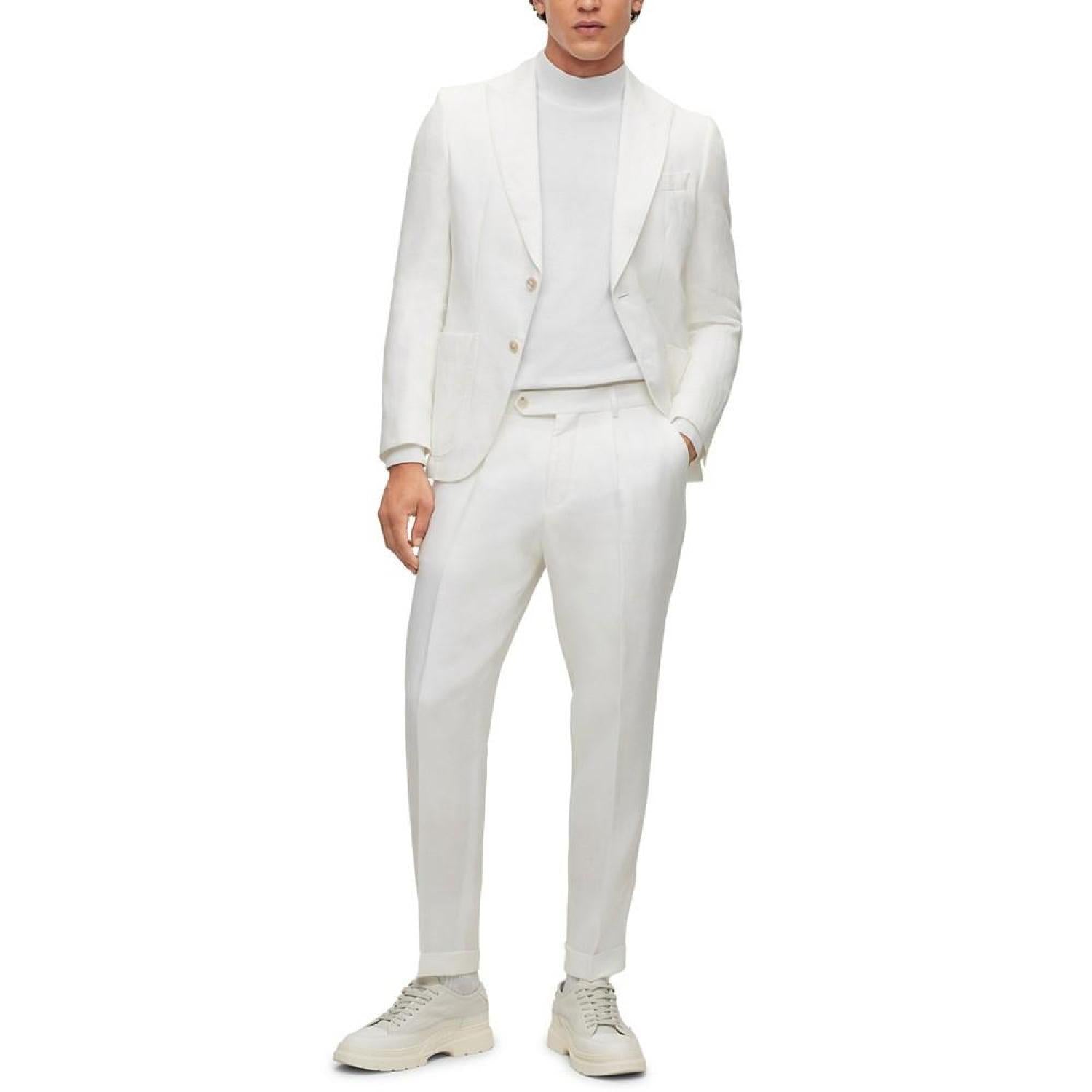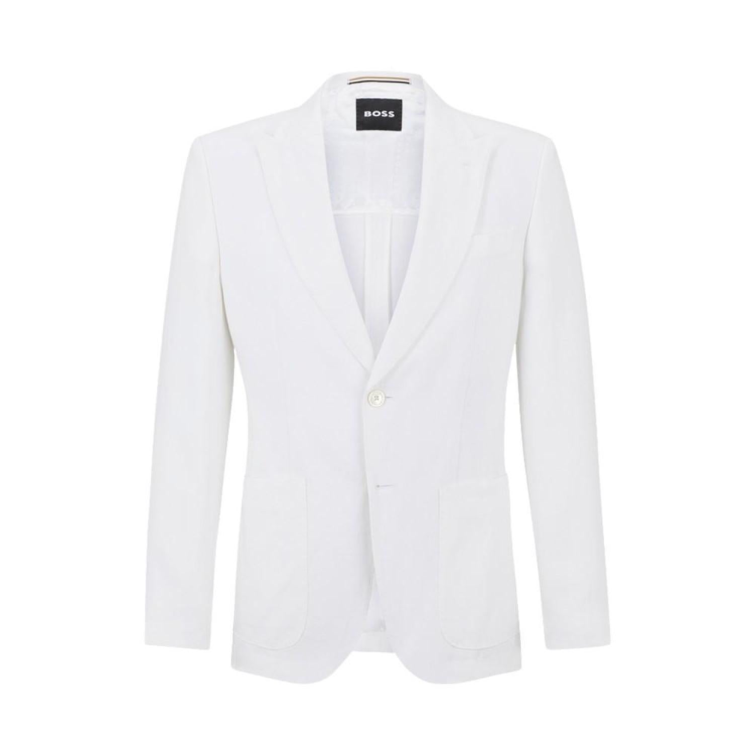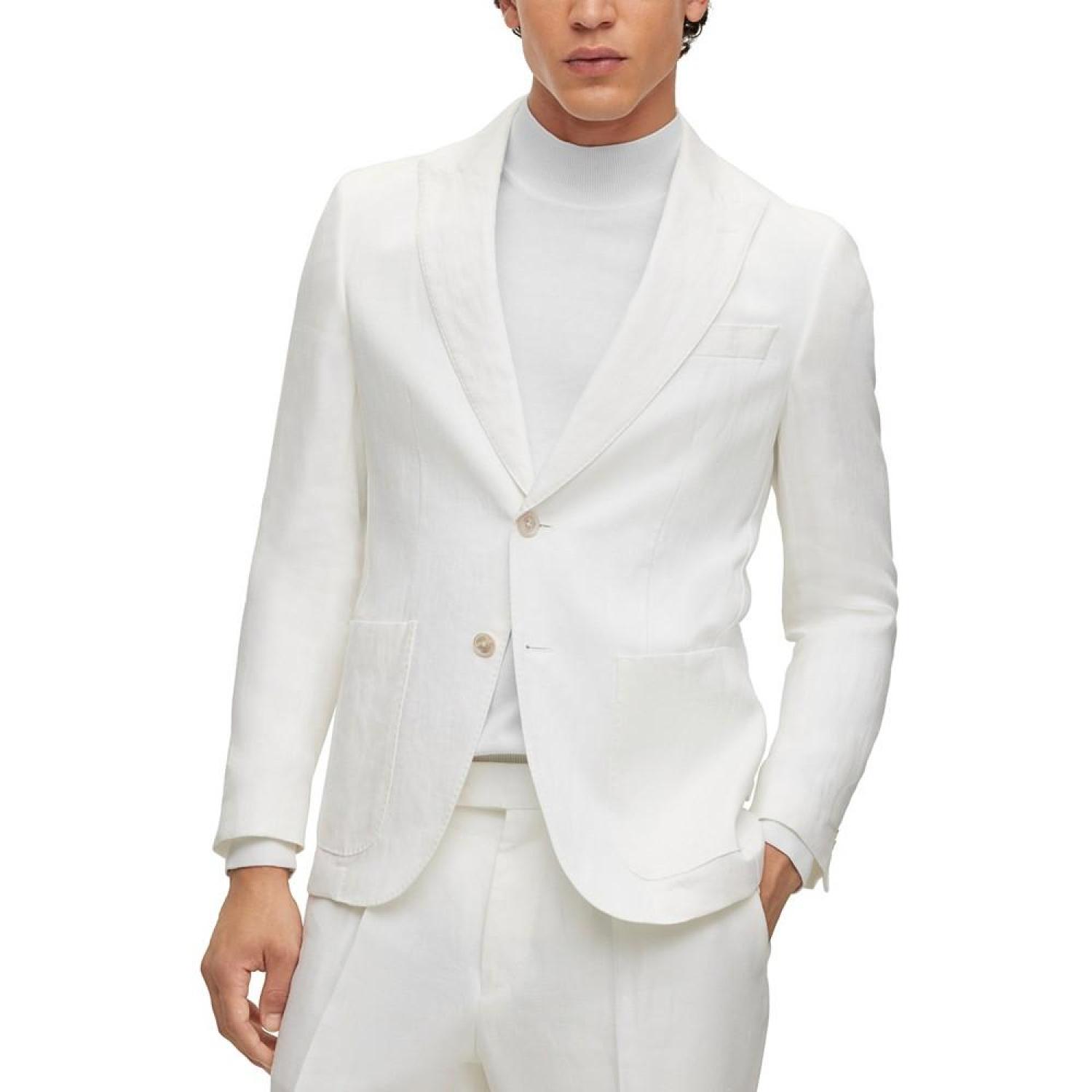 • A summery jacket with a single-breasted closure by BOSS Menswear. Partially lined with signature material, this contemporary jacket is crafted in pure linen for a breathable feel. Peak lapels complement the defined fit of this piece.