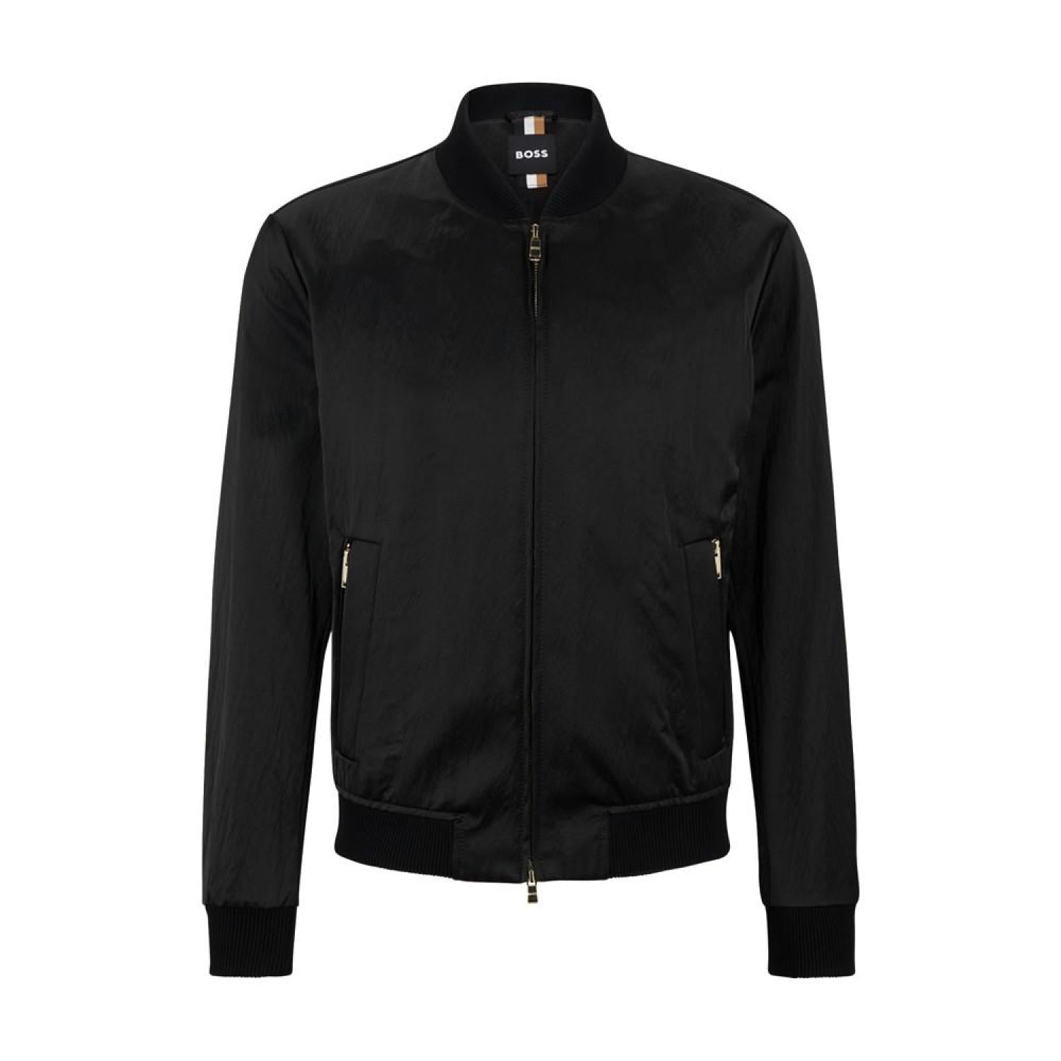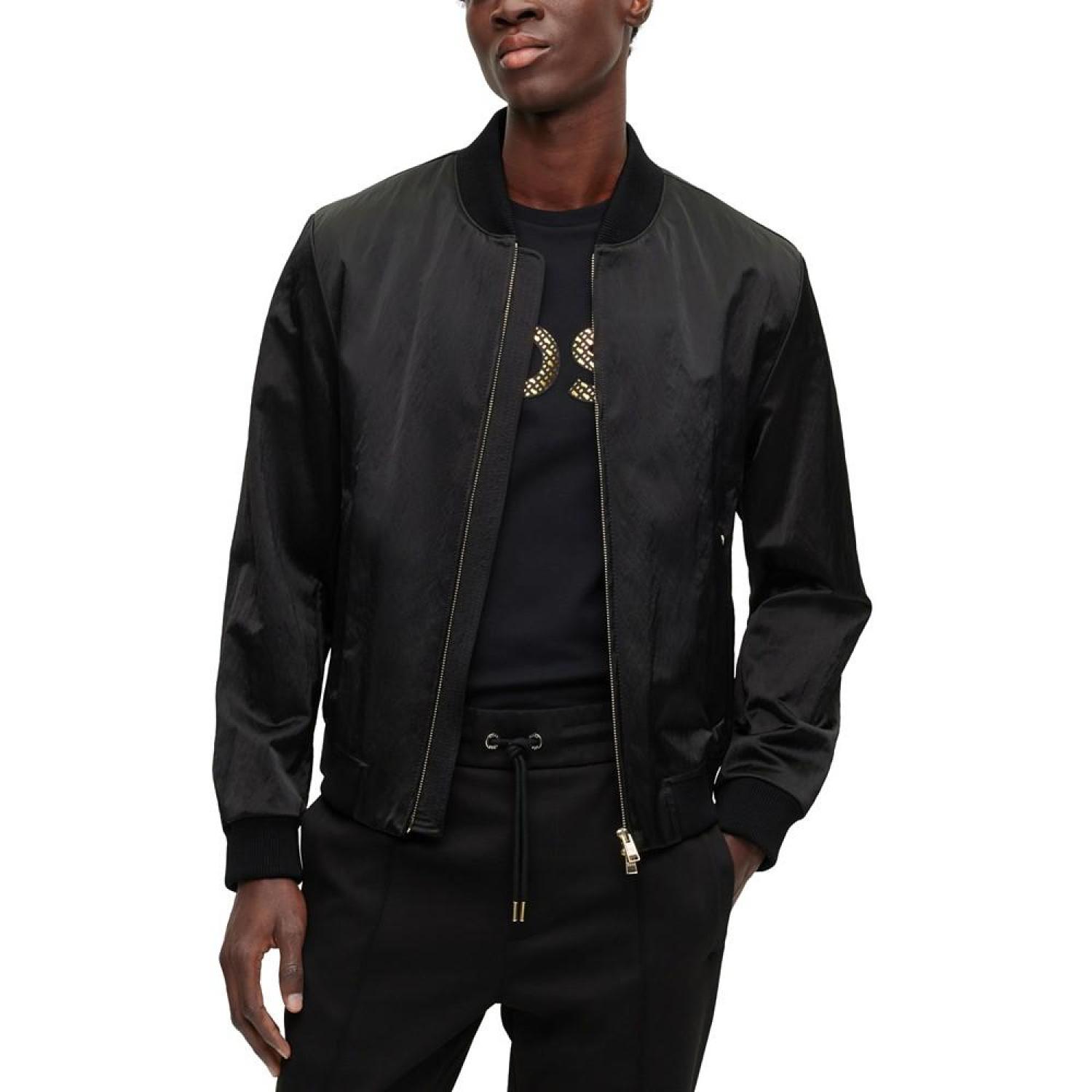 • A versatile jacket by BOSS Menswear. Cut to a streamlined fit for a contemporary silhouette, this zip-up jacket is crafted in soft satin and trimmed with a signature-stripe accent at the interior.