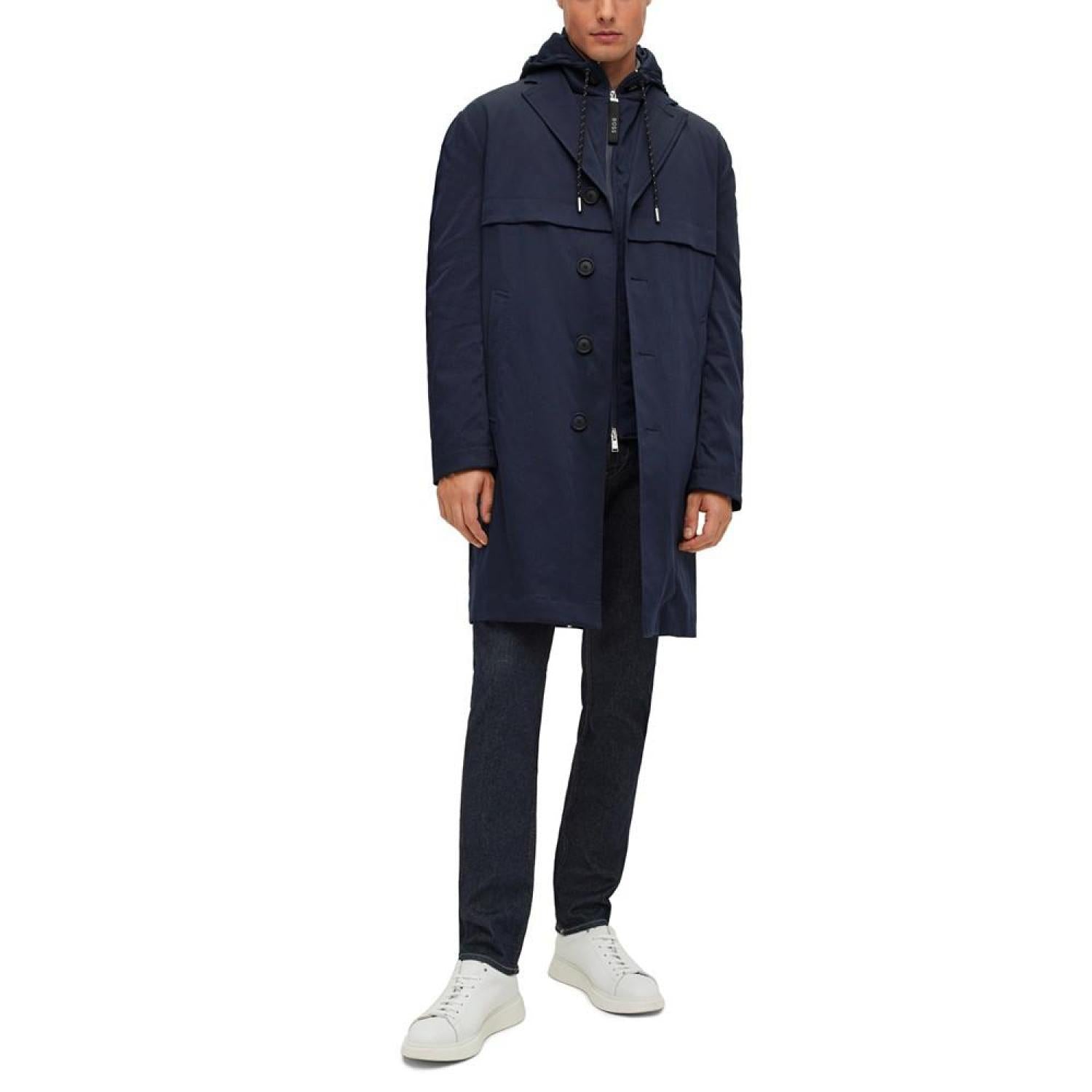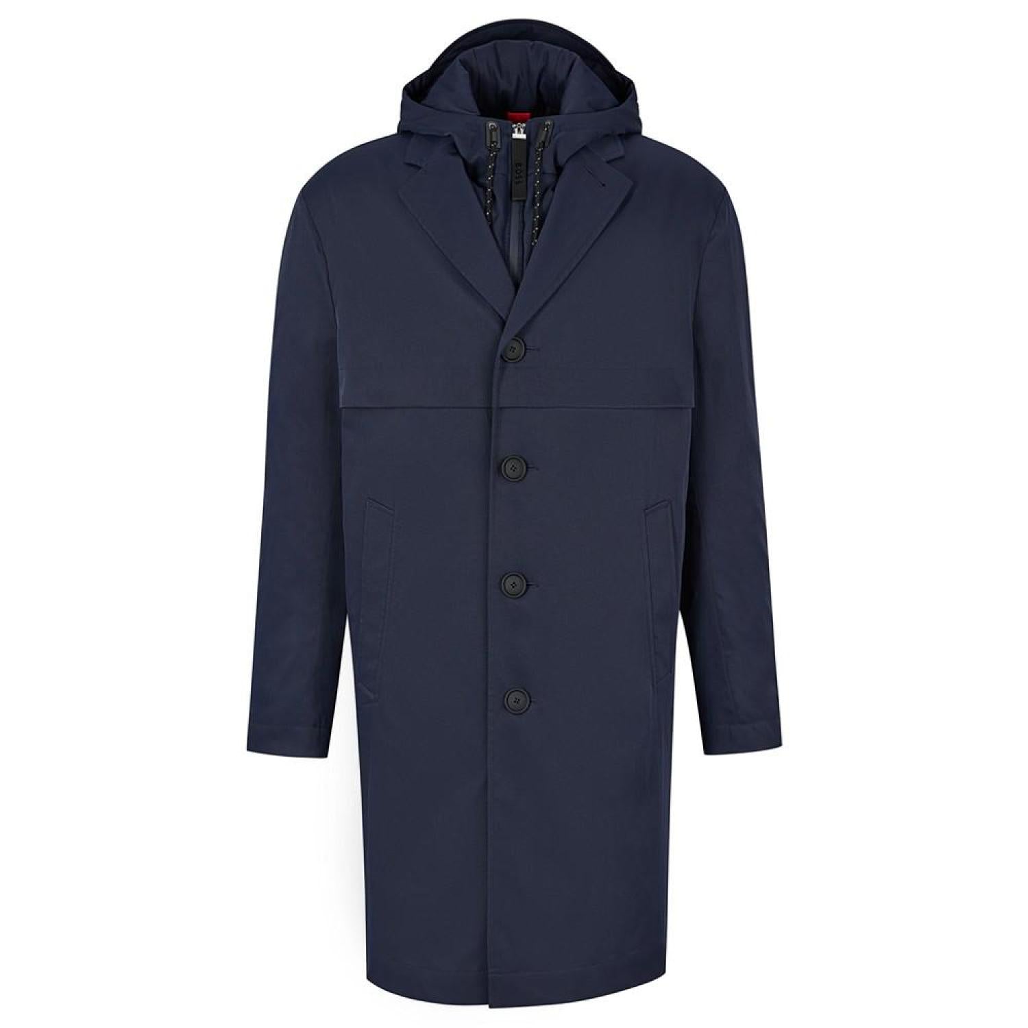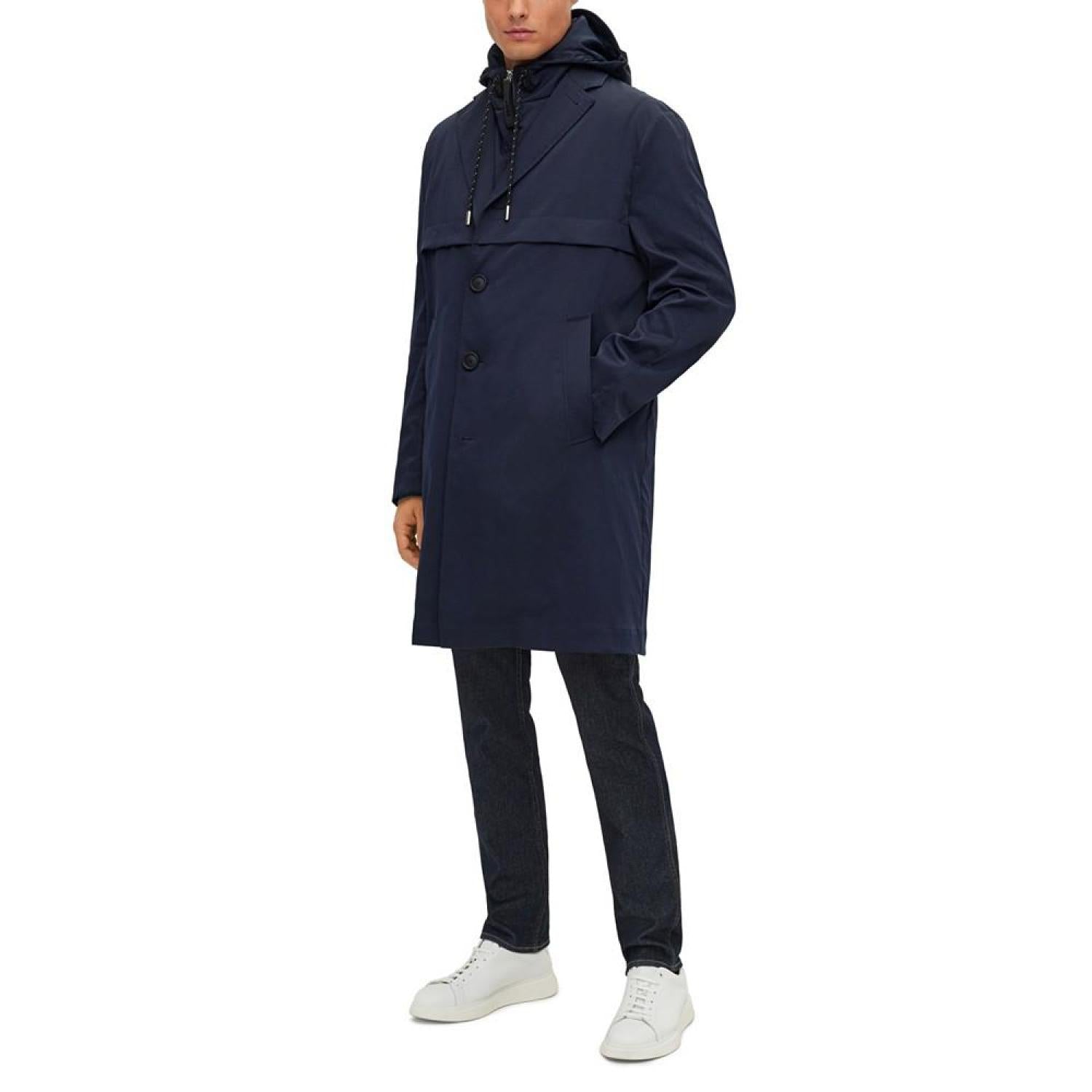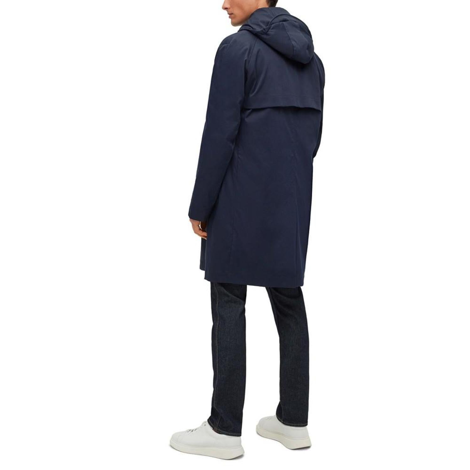 • An advanced coat by BOSS Menswear. Crafted in performance-stretch material for comfort, this coat is cut to a relaxed fit and treated with a water-repellent finish. The zip-up inner features a hood and patterned drawcords.