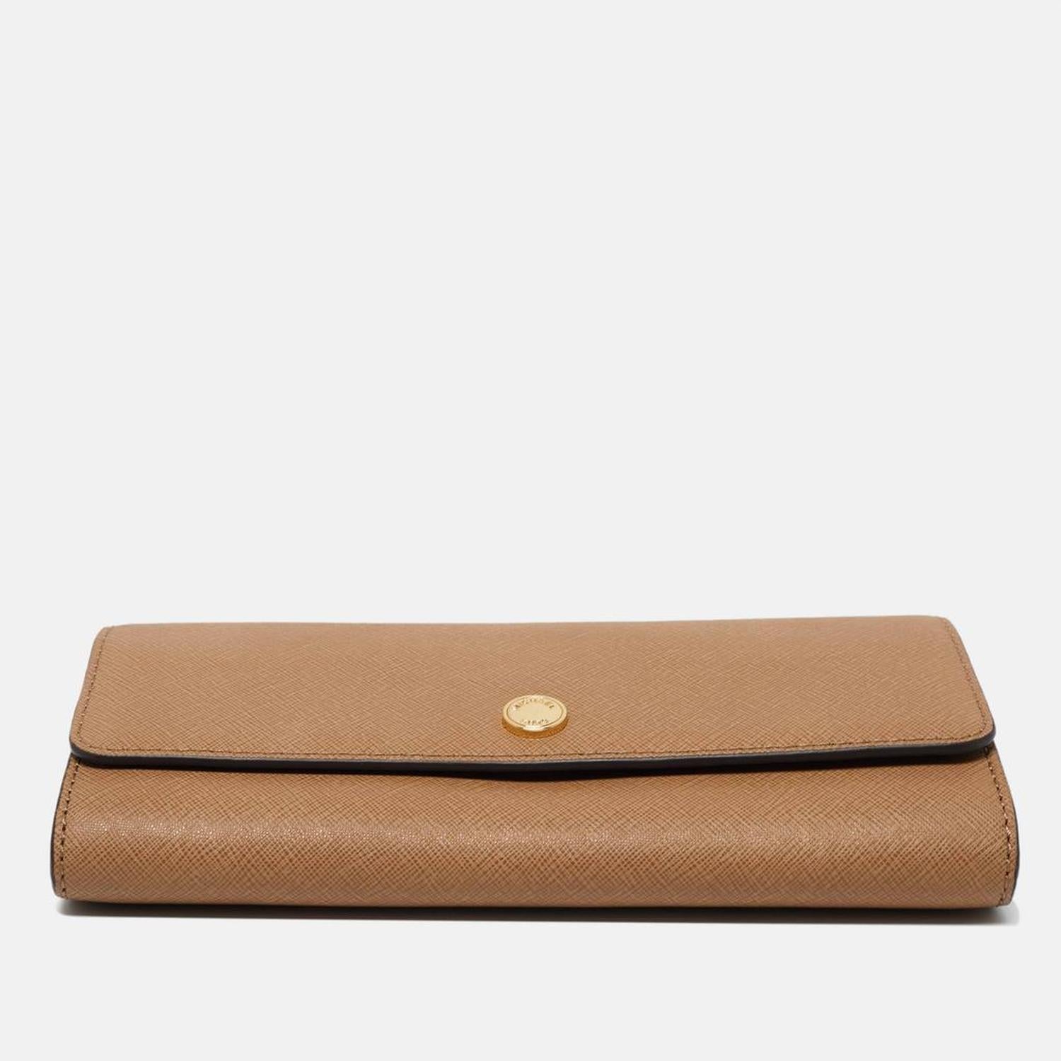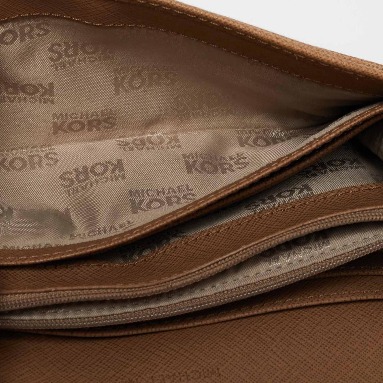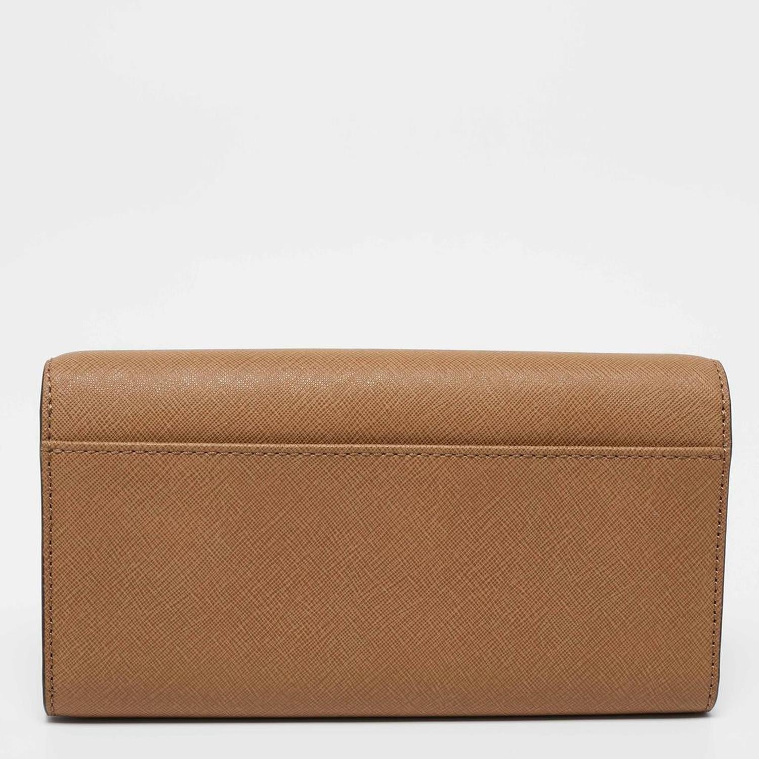 - Michael Kors brings to you the perfect everyday wallet with this lovely beige creation. It is crafted using Saffiano leather and gold tone hardware. The front flap opens to multiple slots to house your cards with ease.