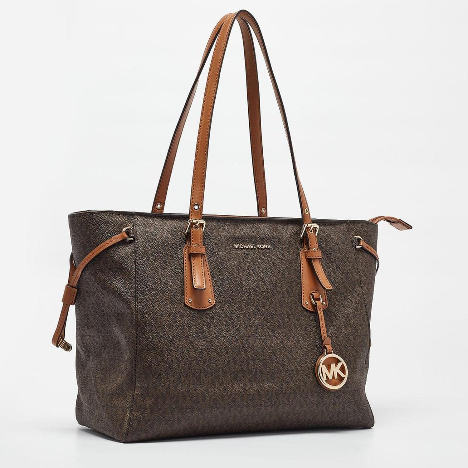 Michael Kors Brown Signature Coated Canvas And Leather Voyager Shopper Tote