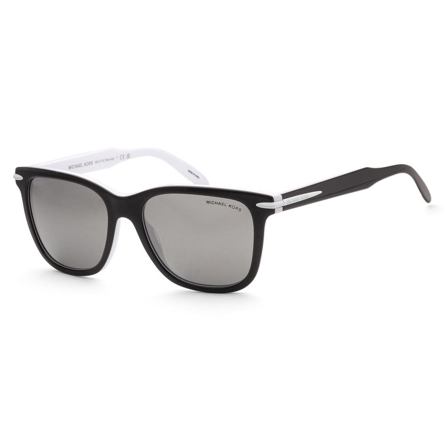 Dimensions - 54 mm x 17 mm x 145 mm. The frame is black acetate square shape. The lenses are gunmetal mirror non-polarized with 100% UV Protection. (MK2178-39206G)