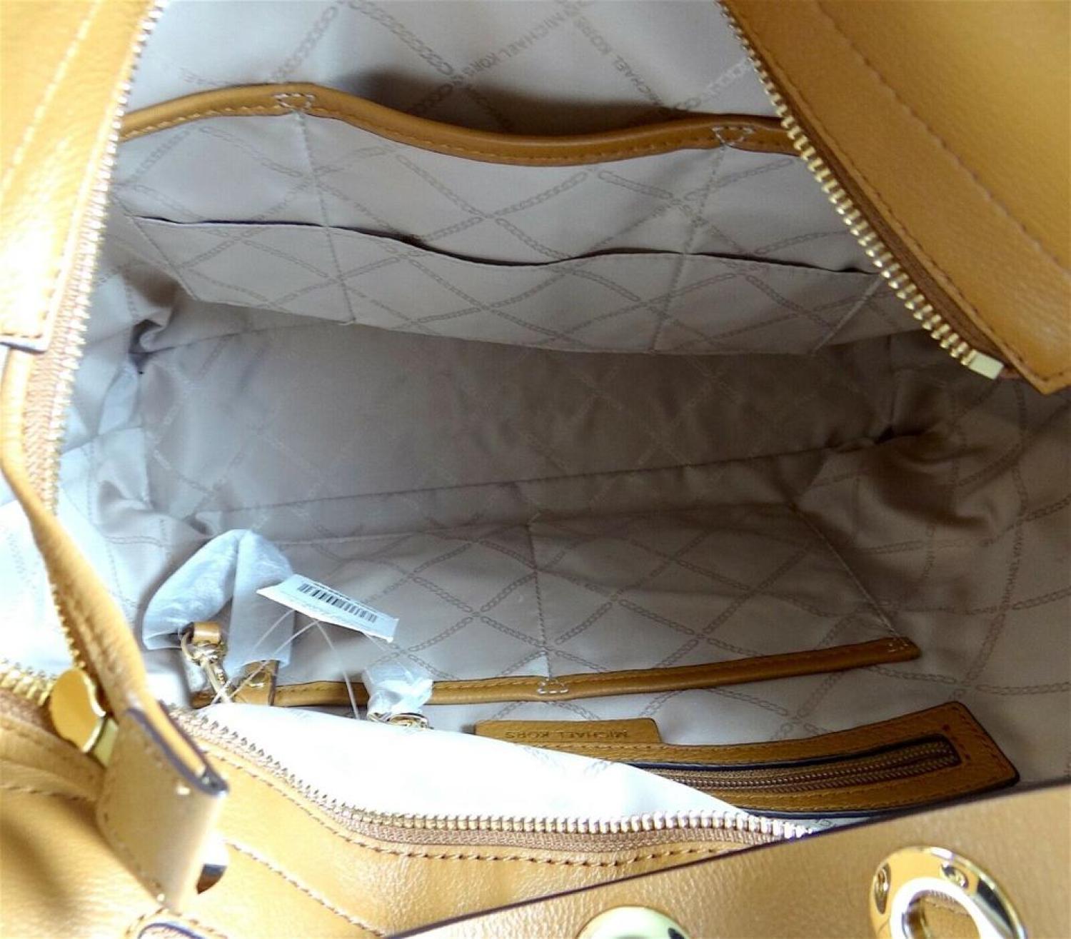 Made of Leather; Zip top closure with Tassel pull and MICHAEL KORS letter in front; Zip pocket inside; 06 Slid pockets; Key Fob. Logo jacquard lining; Shoulder strap with 8 inches drop; 45 inches Adjustable Leather & Chain shoulder strap with 19-21 inches drop. Measurements - Length 14.5 X Height 13 X Width 4 inches. Gold hardware. Comes with original tags.
