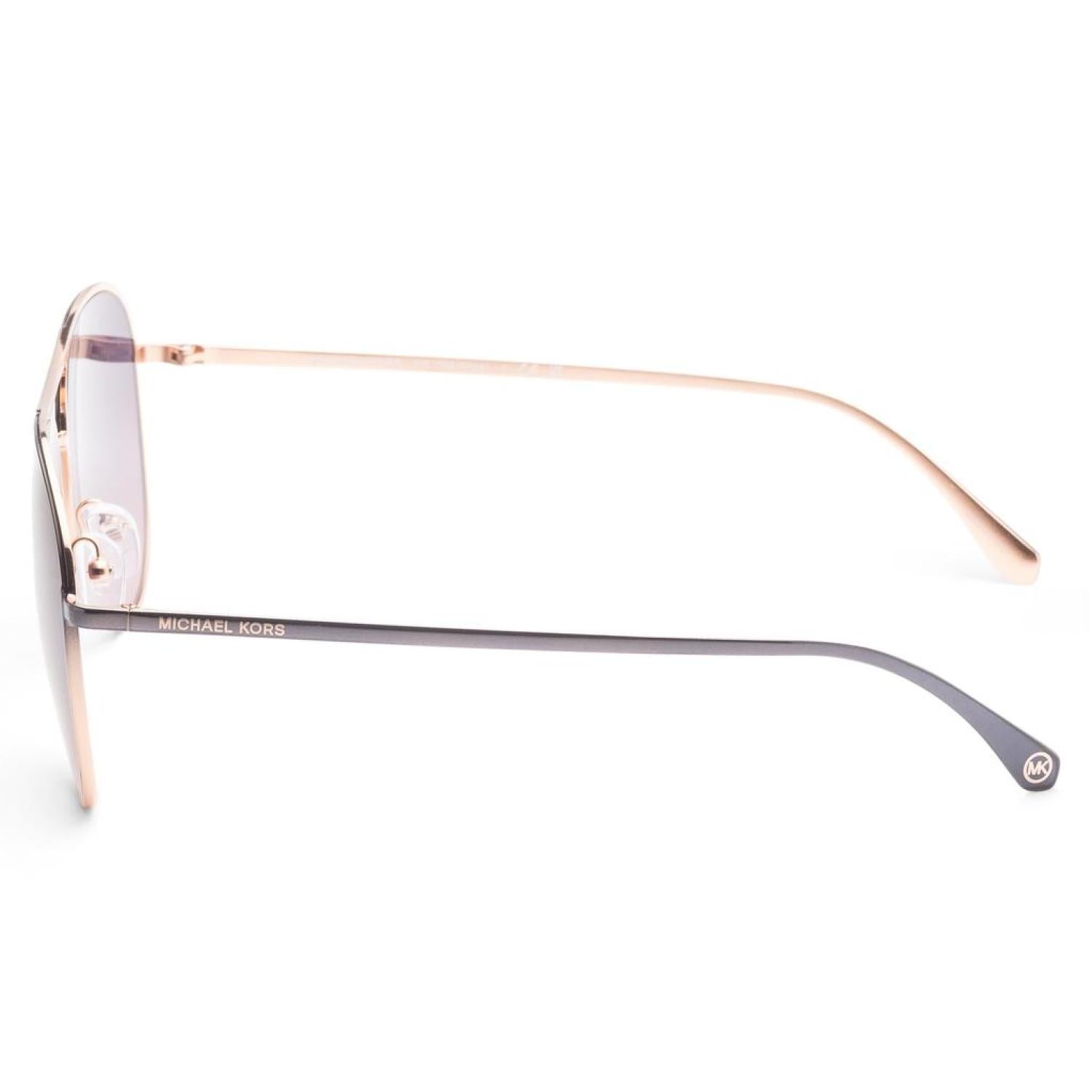 The Michael Kors women's Sunglasses measure at 59 mm lens width, 14 mm bridge width, and 140 mm arm length. The frame is aviator-shaped navy rose gold gradient metal. The lenses are non-polarized navy pink gradient. Made in China (MK1089-1334I6-59)