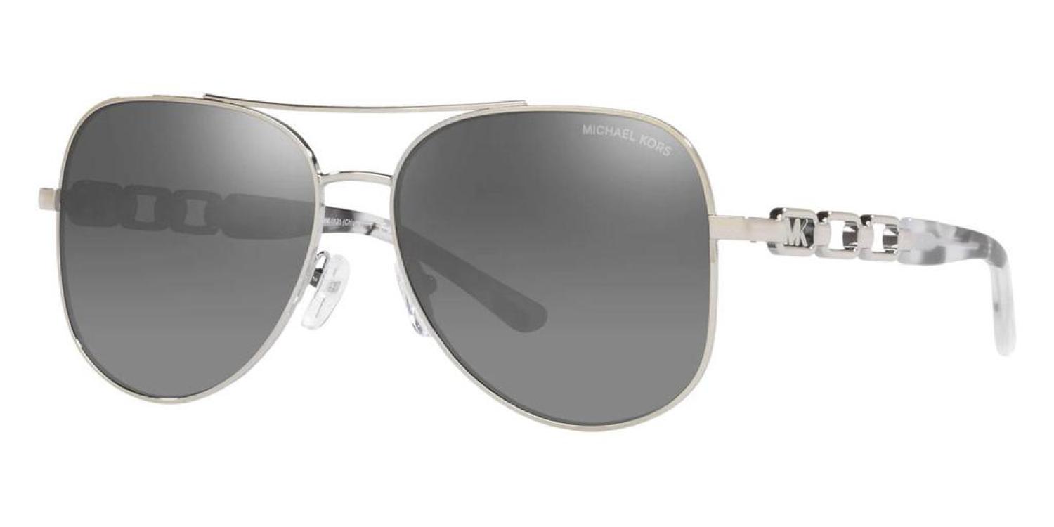 The Michael Kors women's Sunglasses measure at 58 mm lens width, 15 mm bridge width, and 140 mm arm length. The frame is aviator-shaped silver metal. The lenses are non-polarized silver grey gradient. Made in China (MK1121-115388)
