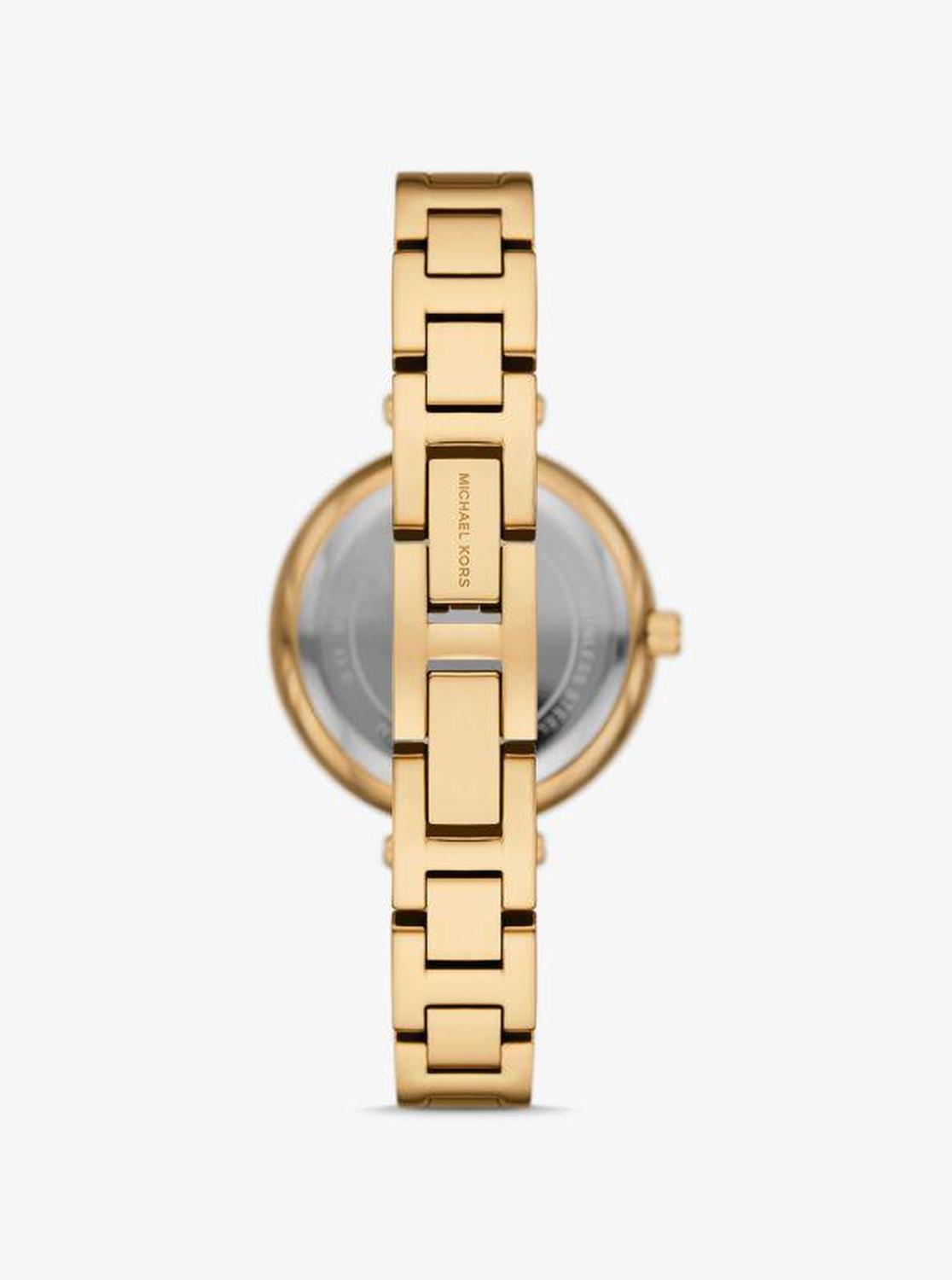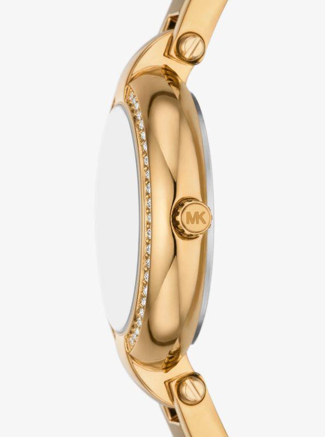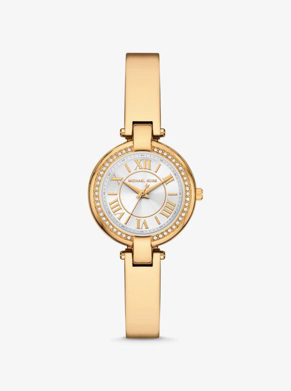 • The mini Laney watch is a masterclass in understated elegance. Updated with a bangle-inspired design, it features a circular bezel dotted with pavé and a mother-of-pearl face with classic Roman numeral markers. Made from gold-tone plated stainless steel, it’s designed to be worn for years to come.