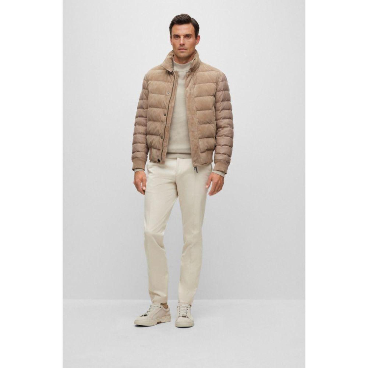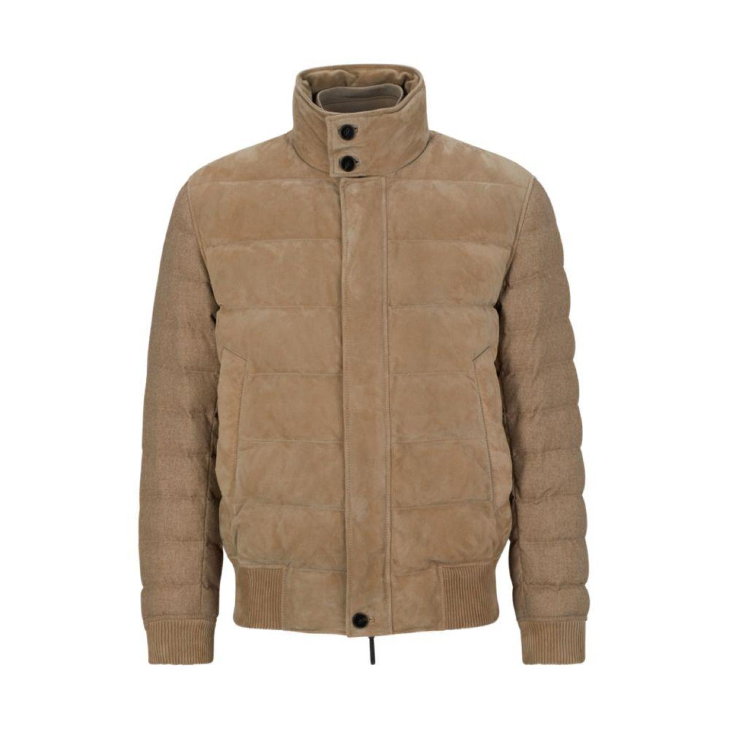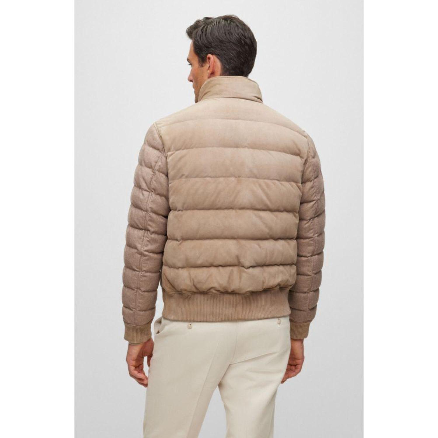 A mixed-material jacket in velour leather with melange sleeves by BOSS Menswear, filled with certified duck down and feather. We continuously look for more ways to produce and finish our products. A minimum of 60% of the leather used to make this product has been sourced from certified tanneries.