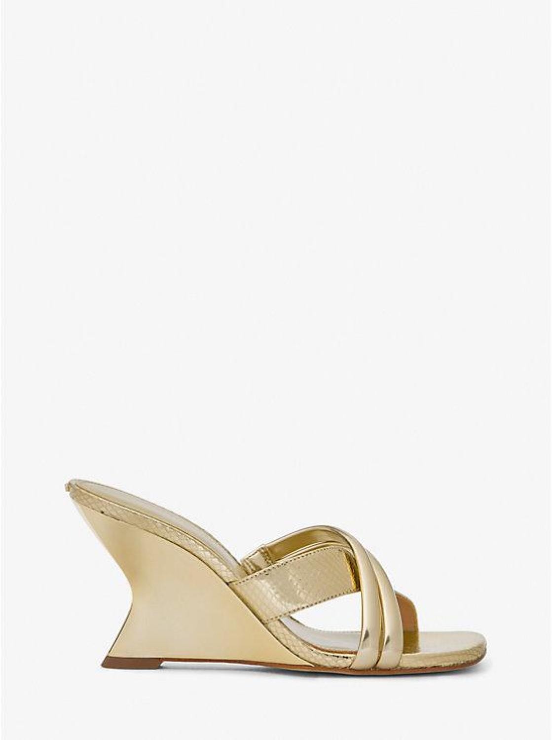 • For all-out glam this season, put in a call to the Nadina mule wedge. With metallic, snake-embossed leather straps set atop a sculptural heel, they bring a dose of sophistication to any look. The artful silhouette will enliven any look—pair them with dresses and denim alike.
