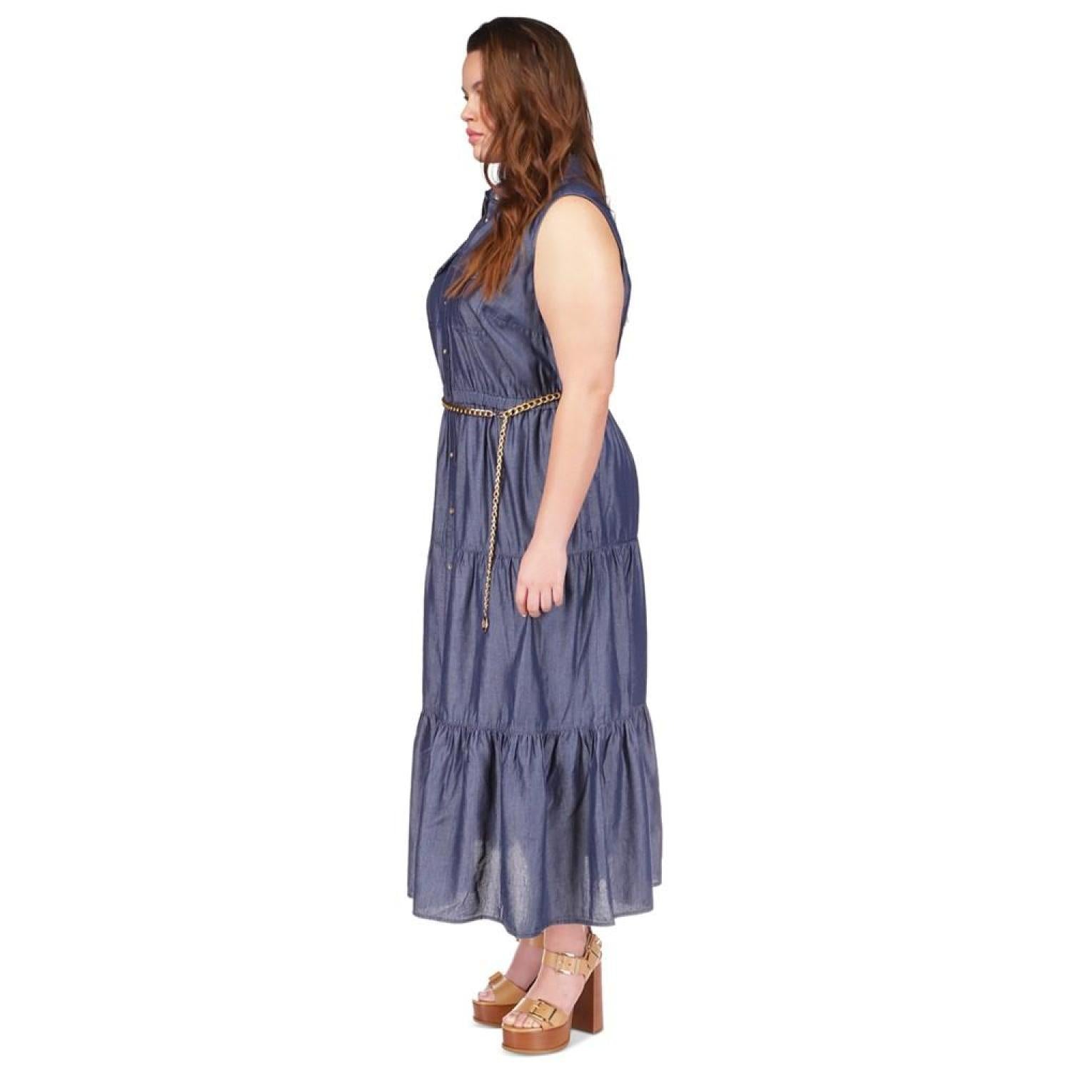 • Bright buttons and a chain belt bring signature shine to this plus size woven shirtdress from MICHAEL Michael Kors.