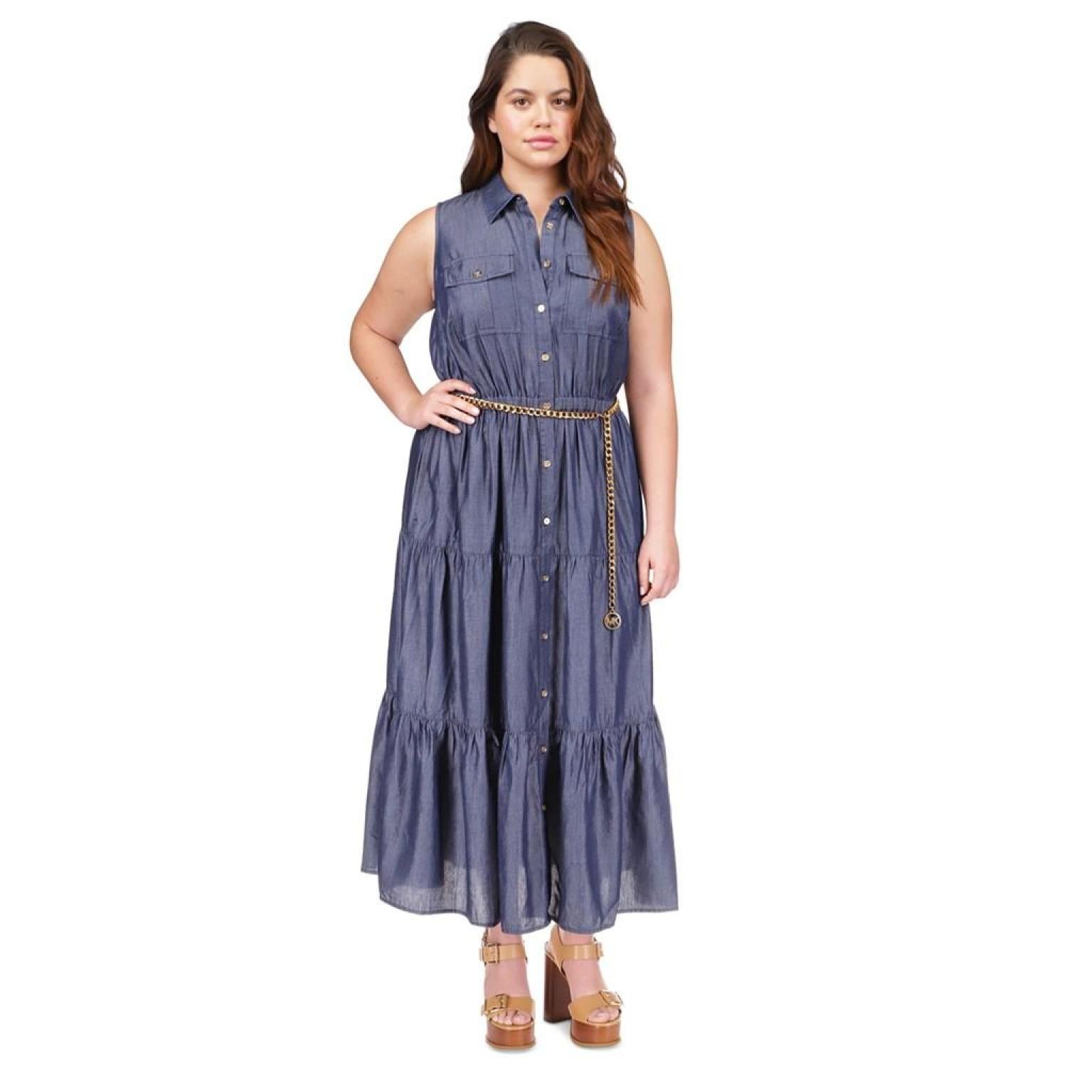 Bright buttons and a chain belt bring signature shine to this plus size woven shirtdress from MICHAEL Michael Kors.