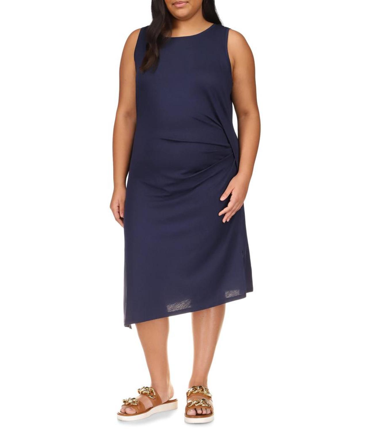 Designed with a figure-flattering side ruche detail, this Plus Size Solid Crew Neck Drape Dress from MICHAEL Michael Kors® will suit you from desk to dining.