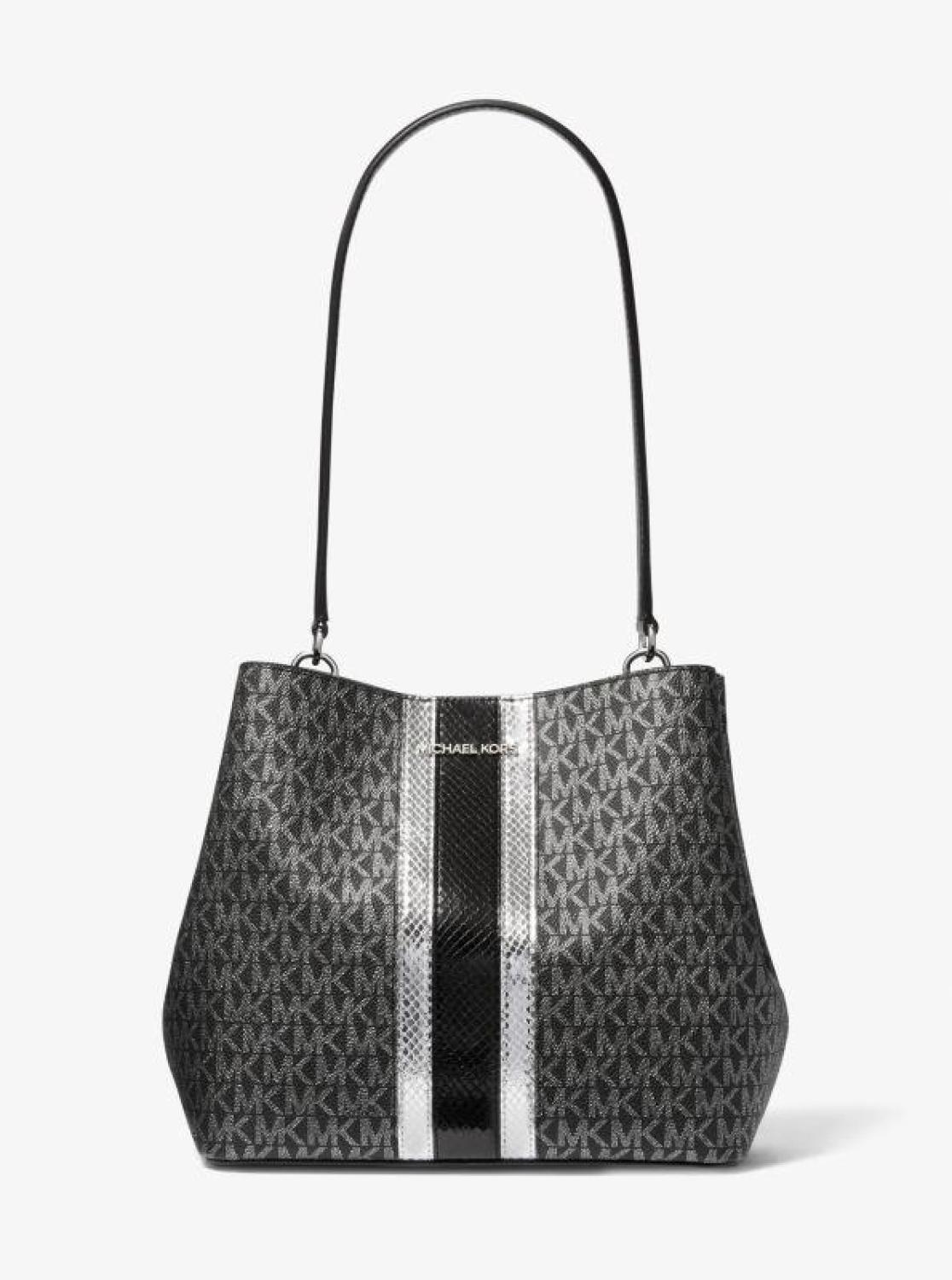 From its bucket-inspired shape to its Signature finish with a metallic snake-embossed stripe, the Pratt is a handbag that will stand the test of time. A coated canvas exterior promises lasting wear, while on the inside, a spacious interior with a median zip pocket ensures easy organizing. Slip the long, slender straps over your shoulder for hands-free wear. • Shoulder bag • Logo-print canvas/metallic snake embossed • 69% coated canvas/17% polyester/13% cotton/1% polyurethane • Trim: 60% polyurethane/20% cotton/20% polyester • Silver-tone hardware • 10.5”W X 8.75”H X 4.75”D • Handle drop: 11” • Interior details: center zip pocket • Lining: 100% polyester • Snap fastening • Dust bag not included • Imported • Shoulder bag • Logo-print canvas/metallic snake embossed • 69% coated canvas/17% polyester/13% cotton/1% polyurethane • Trim: 60% polyurethane/20% cotton/20% polyester • Silver-tone hardware • 10.5”W X 8.75”H X 4.75”D • Handle drop: 11” • Interior details: center zip pocket • Lining: 100% polyester • Snap fastening • Dust bag not included • Imported