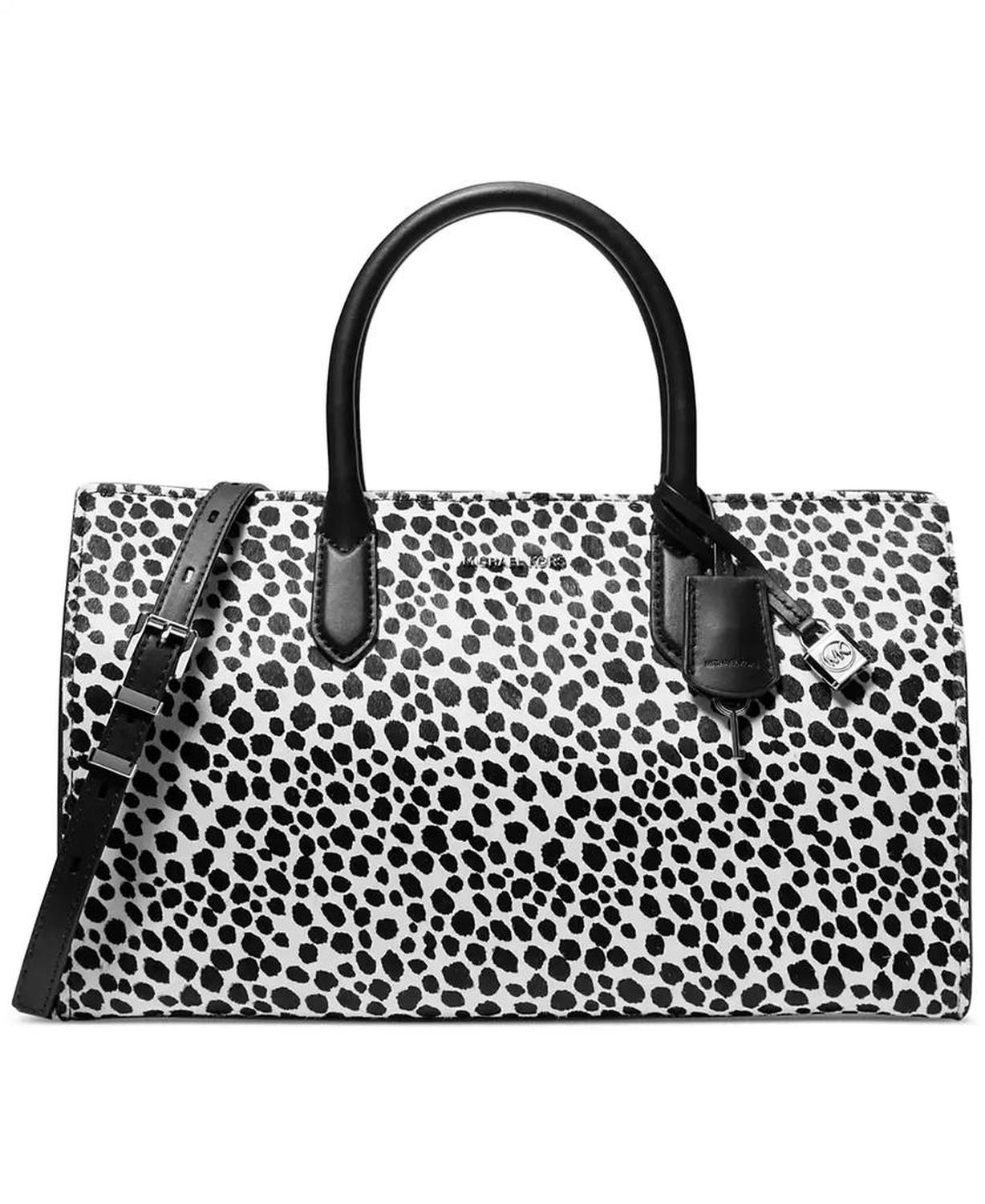 Featuring classic black and white printed calf hair, this satchel by MICHAEL Michael Kors is a chic way to take on busy days.