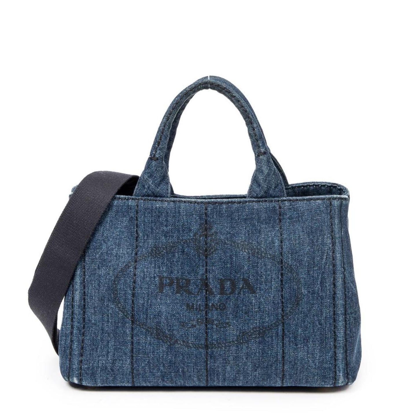 Prada Handbag in Blue Denim Canapa Canvas and Gold hardware. Dimensions - 27*18*13cm. Serial number - B2439G. Inclusions - Straps,Card, dustbag.