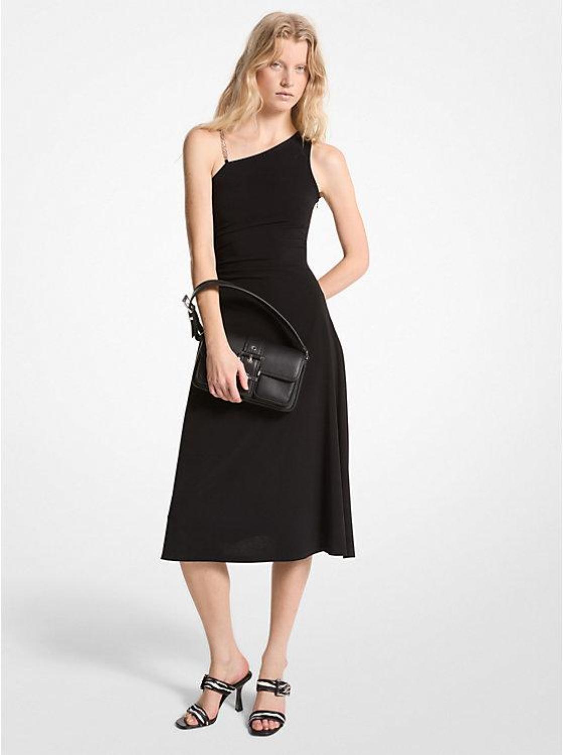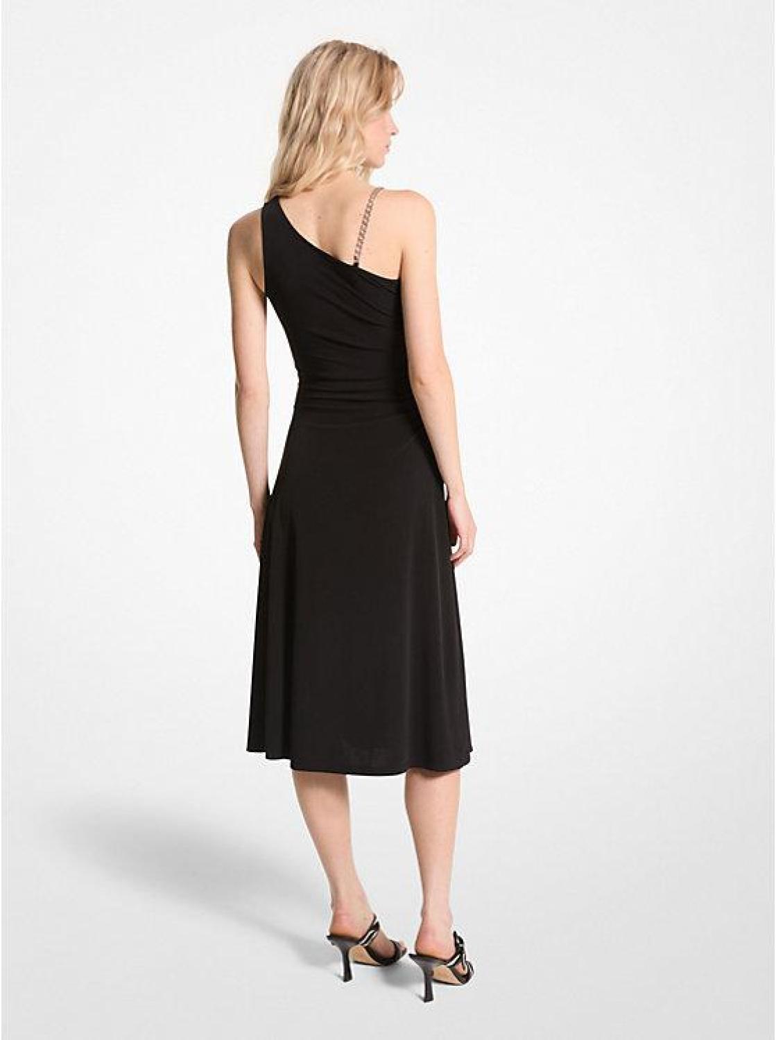 Adorned with a dainty chain-link strap for a touch of shine, this asymmetrical dress is a modern take on the classic LBD. Crafted from stretch matte-jersey, it’s designed with a nipped waist and subtle ruching that descends to a mid-length flared skirt. Keep the contemporary neckline in focus with a slicked back bun and minimal accessories.