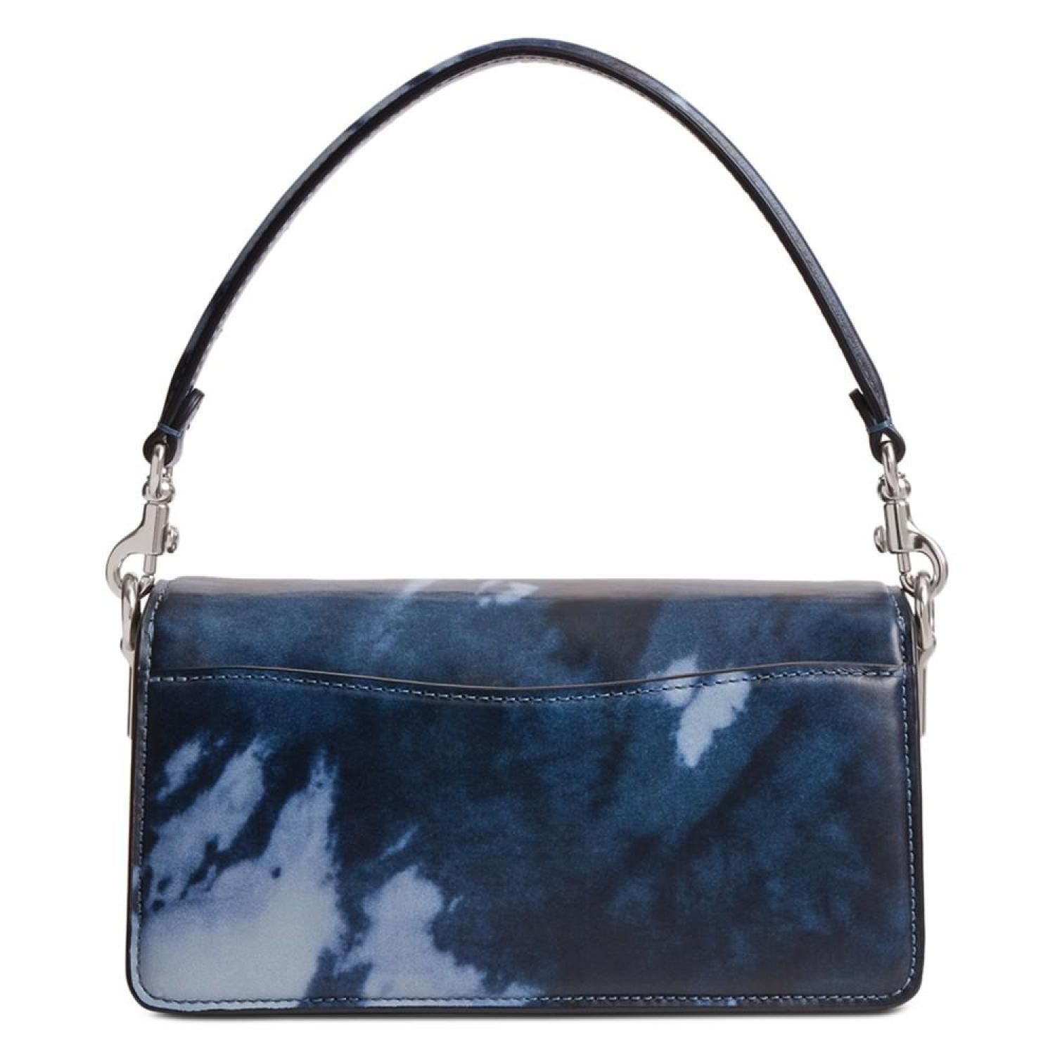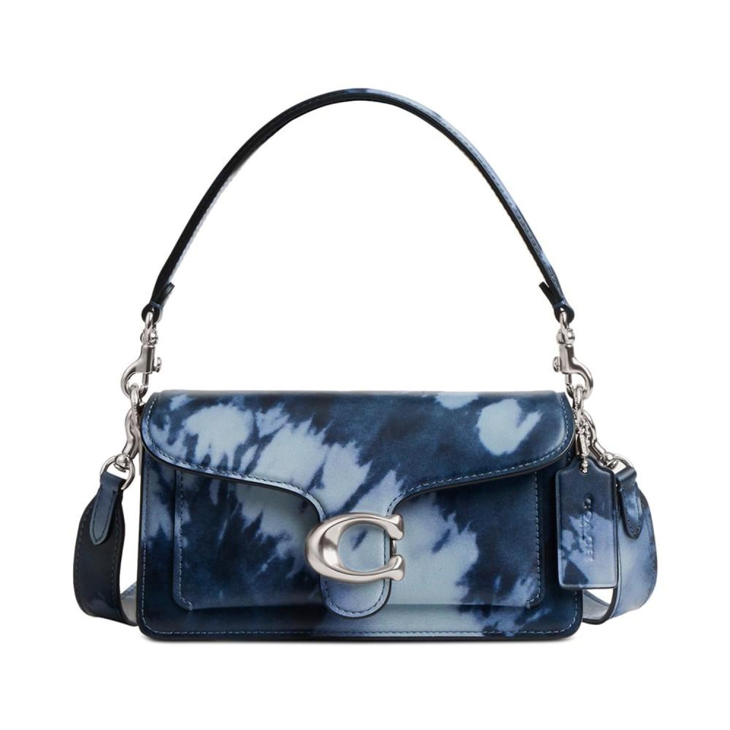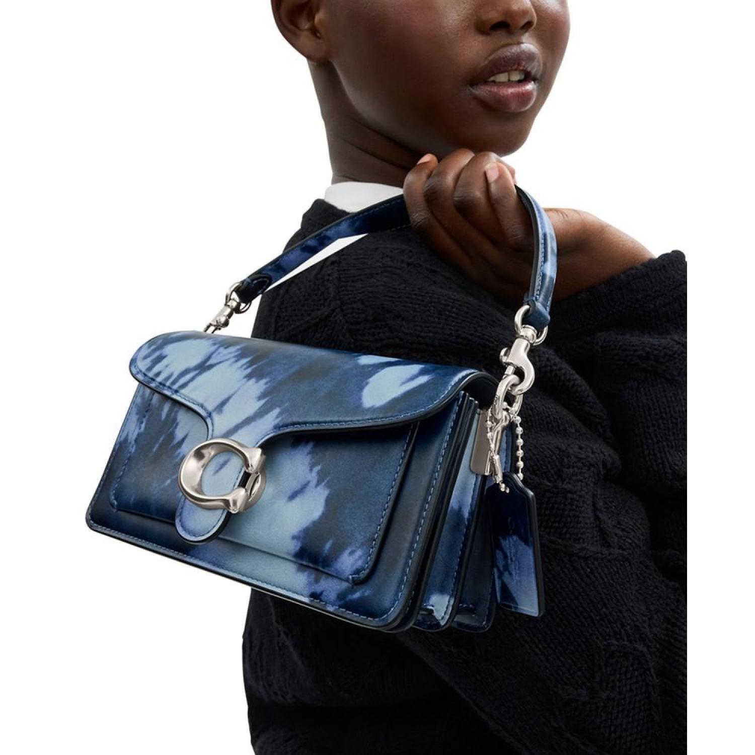 Super groovy with digitally printed tie-dye on smooth leather, this version of the Tabby by COACH is perfect for summer soirees. Mini sized bag; 7-3/4"W x 4-1/4"H x 2-3/4"D (width is measured across the bottom of handbag); 1.21 lbs. approx. weight Silhouette is based off 5'9" model 5-1/2" L removable handle; 21-1/2" L adjustable, removable strap Snap closure Silver-tone hardware & logo; interior zip & slip pockets Leather Spot clean Imported