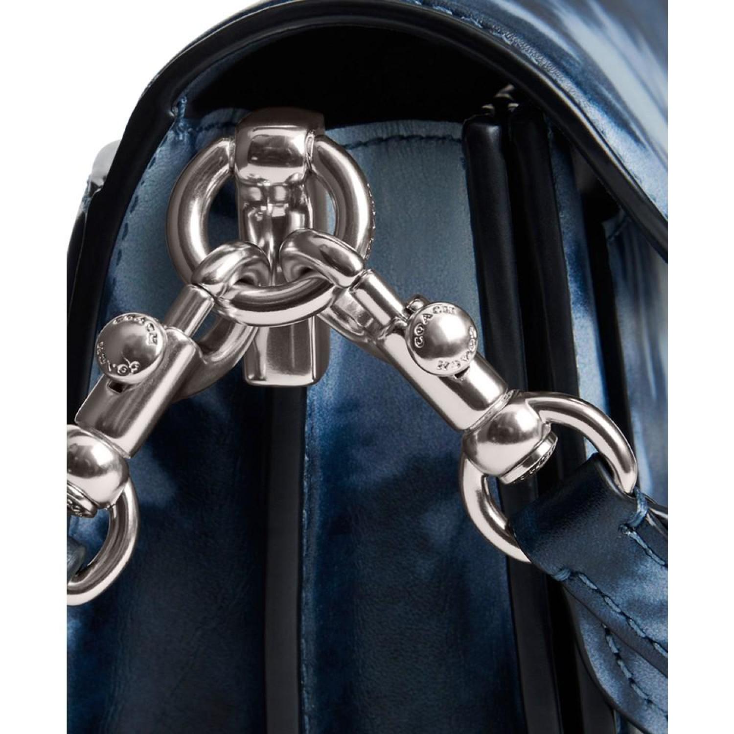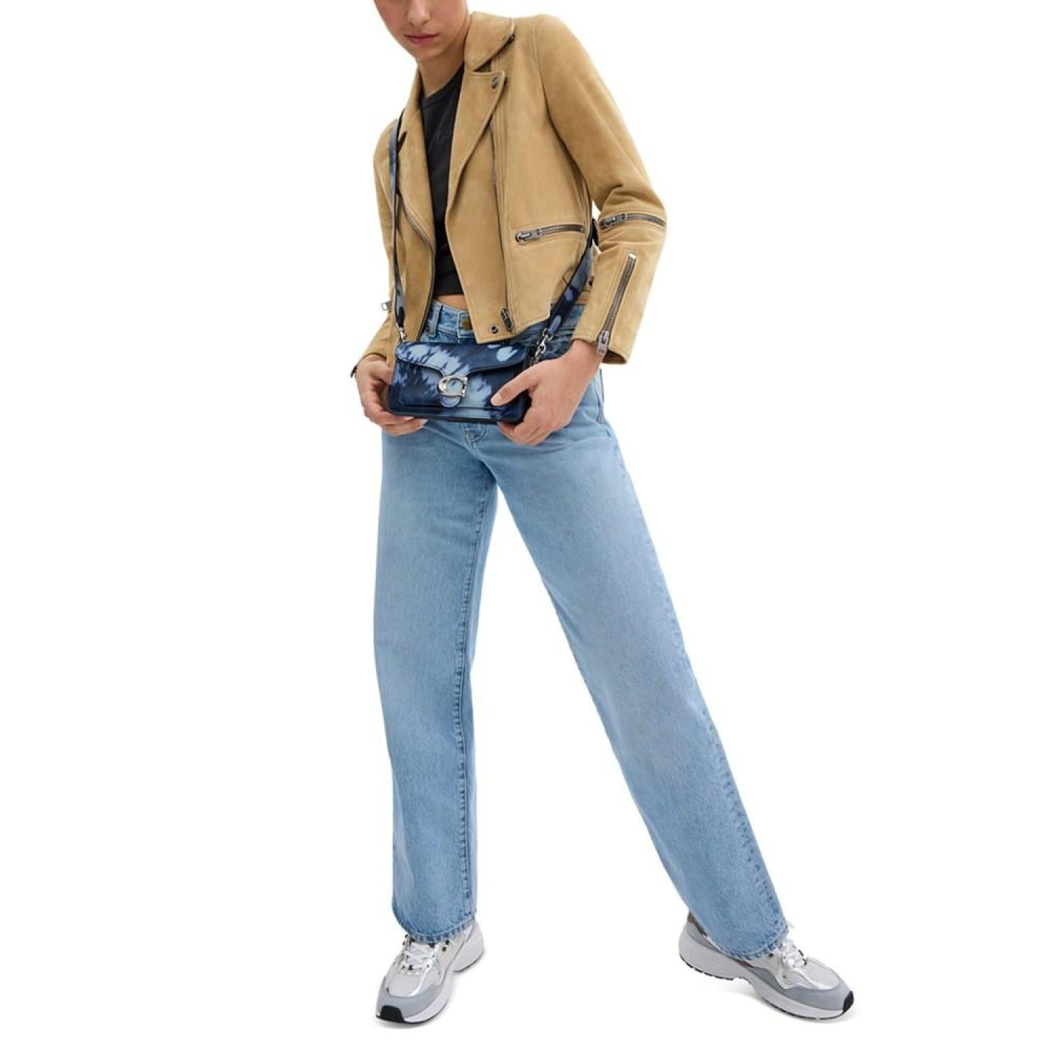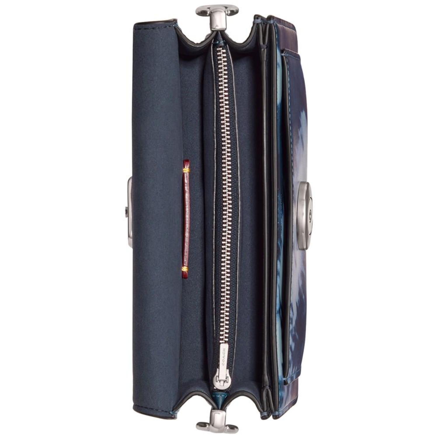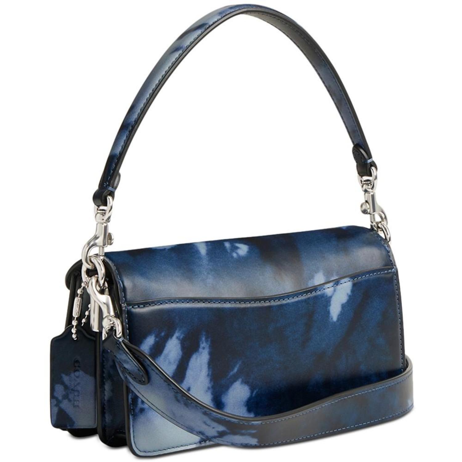 Super groovy with digitally printed tie-dye on smooth leather, this version of the Tabby by COACH is perfect for summer soirees. Mini sized bag; 7-3/4"W x 4-1/4"H x 2-3/4"D (width is measured across the bottom of handbag); 1.21 lbs. approx. weight Silhouette is based off 5'9" model 5-1/2" L removable handle; 21-1/2" L adjustable, removable strap Snap closure Silver-tone hardware & logo; interior zip & slip pockets Leather Spot clean Imported