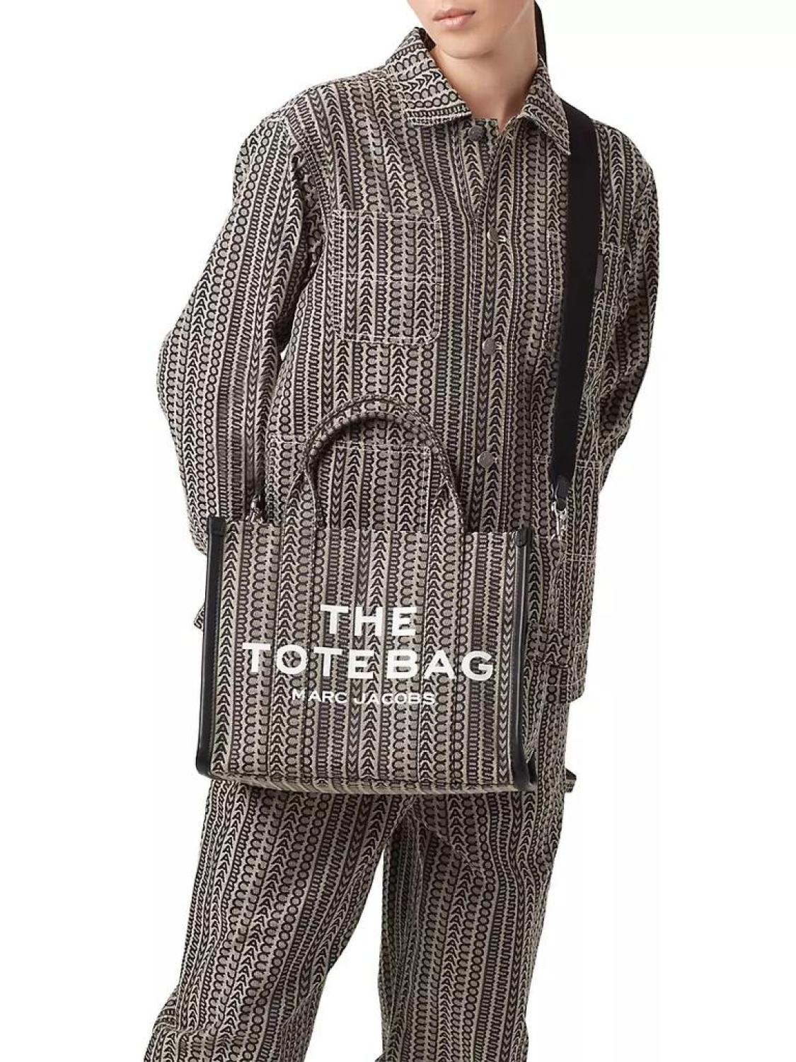 Highlighted with a signature bold logo, the Medium Tote from Marc Jacobs is crafted of monogram canvas and trimmed with smooth leather. This piece is accompanied by two handles and a webbing crossbody strap.Two top handlesSide handleRemovable adjustable strapZip-top closureInterior slip pockets64% cotton/36% polyesterImportedSIZE13"W x 10.5"H x 6"D