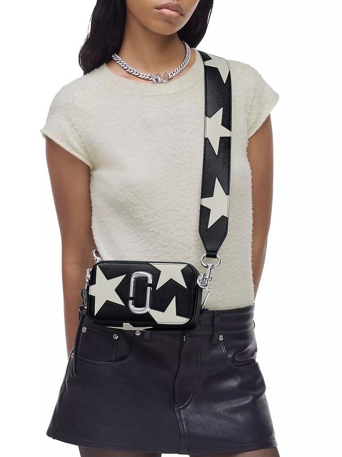 • Marc Jacobs's The Snapshot is a compact accessory crafted from coated leather. This bag's star patchwork design is complemented by a removable and adjustable leather strap, and dual top zippers for easy access.