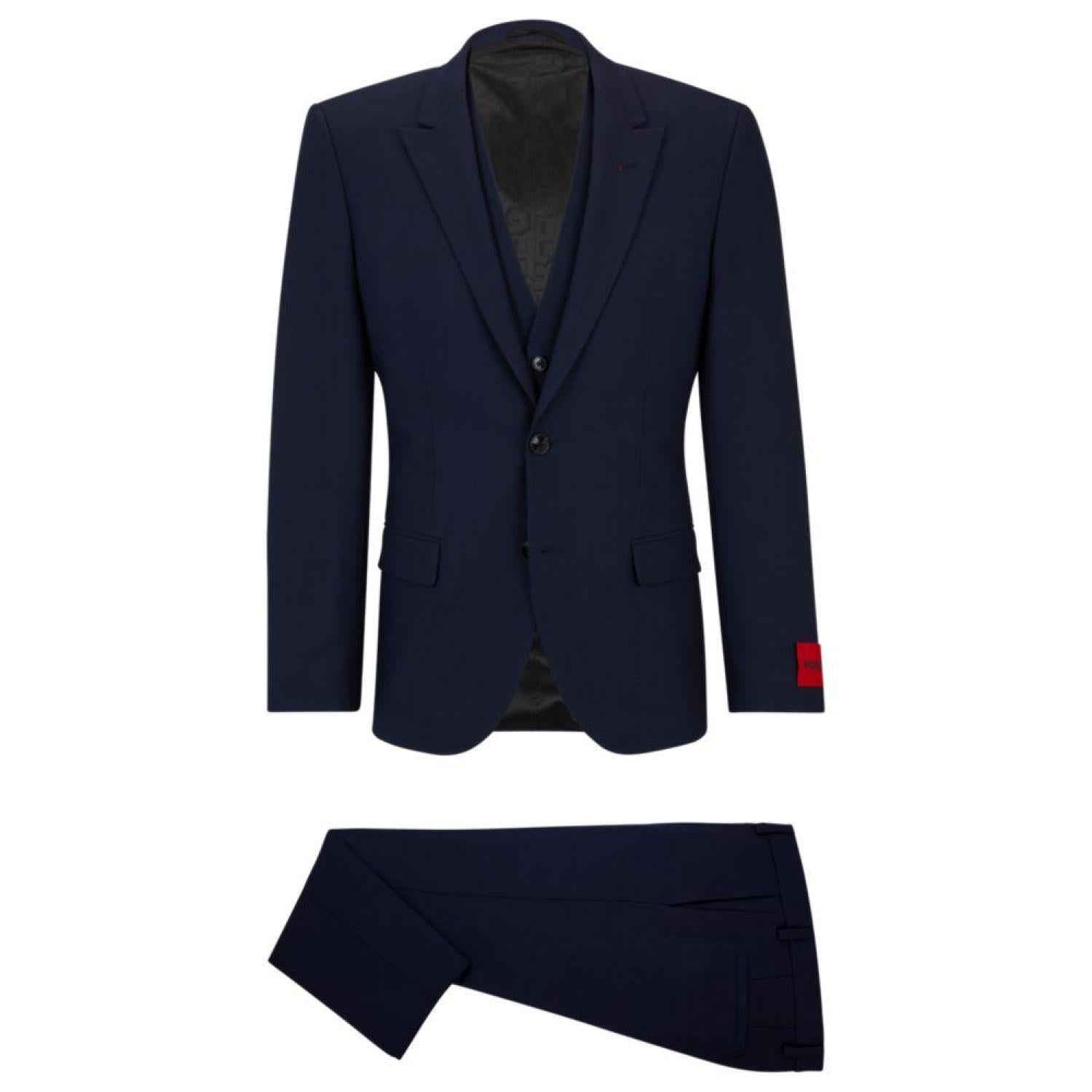 A three-piece suit by HUGO Menswear, tailored to a defined fit in a wool blend with super-flex performance and full lining.