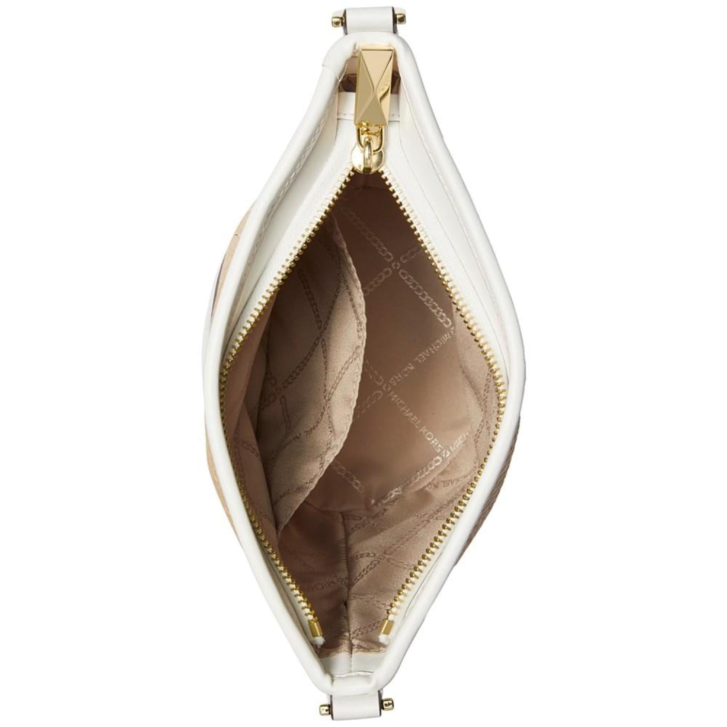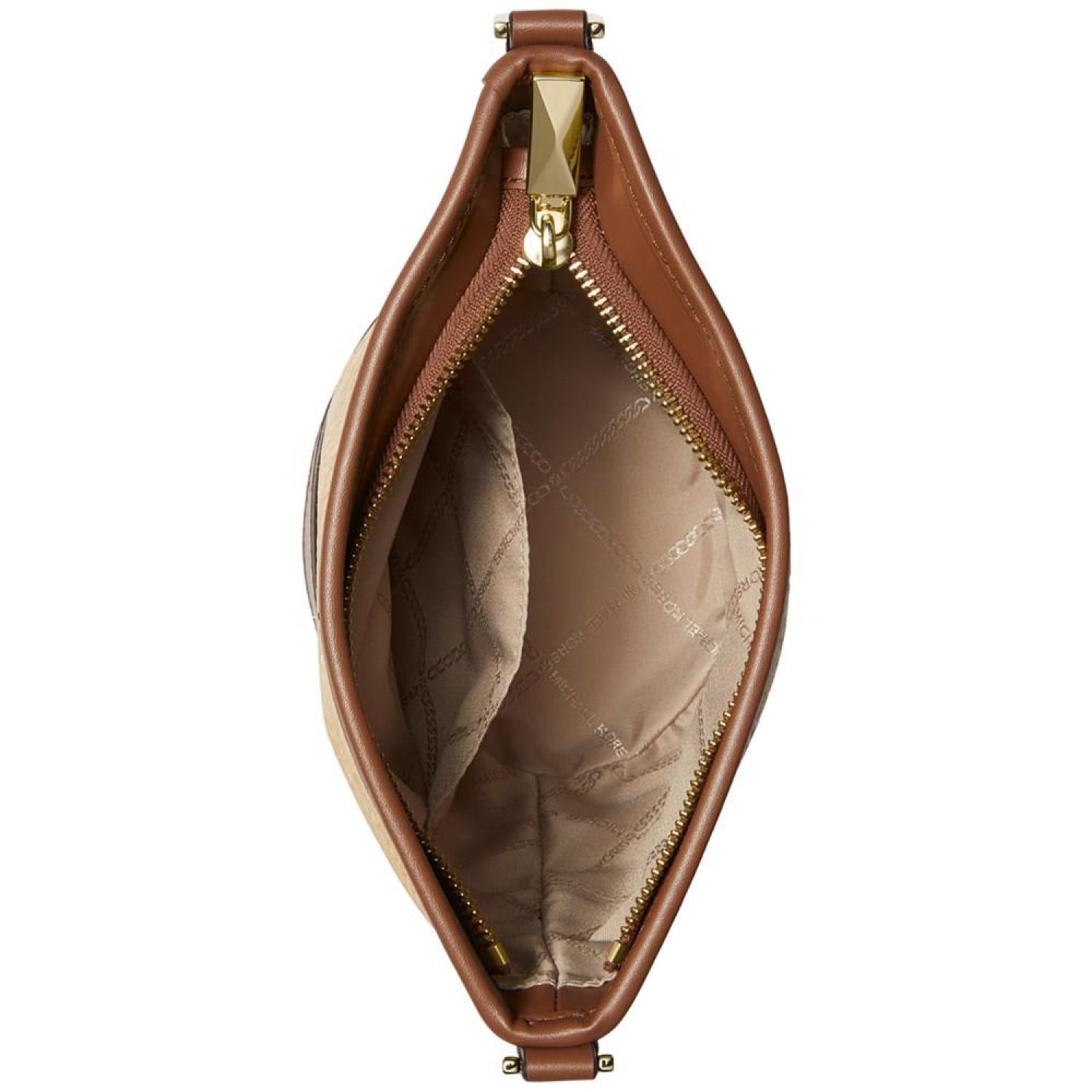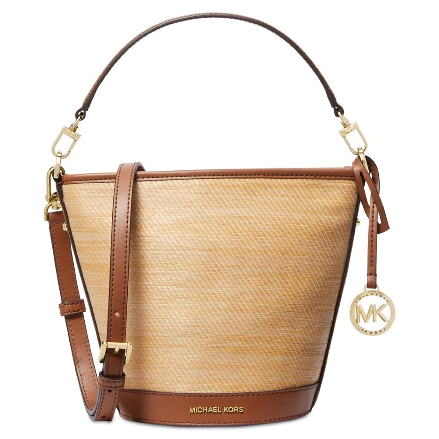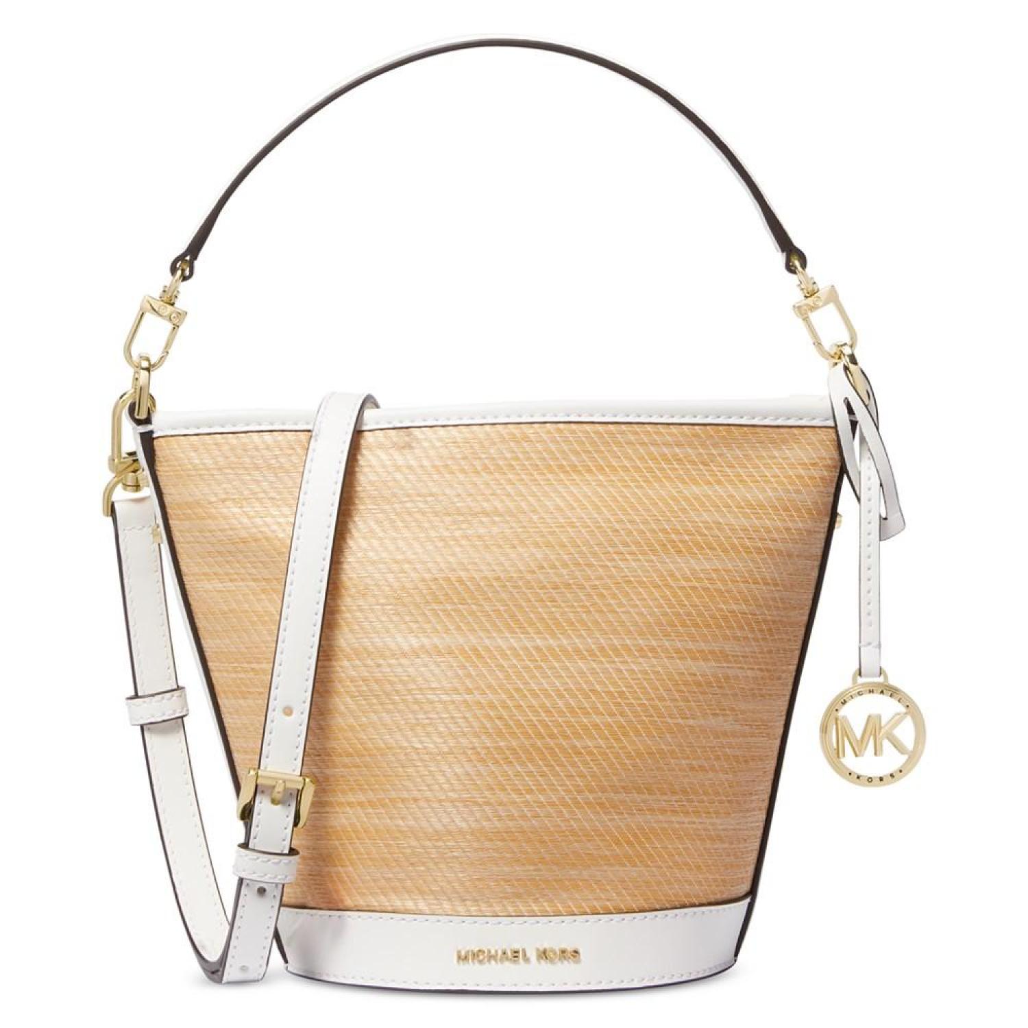Crafted with a textured, woven feel, this bucket bag by MICHAEL Michael Kors is a chic accessory accented with gold-tone hardware and charms. Small sized bag; 8-3/4"W x 7-3/4"H x 5"D (width is measured across the bottom of handbag) Silhouette is based off 5'9" model 4-1/2"L handle; 24-1/2"L adjustable strap Zippered closure Gold-tone exterior hardware, logo charm & interior slip pocket Polyethylene, polyester; trim: polyurethane, cotton, polyester Spot clean Imported