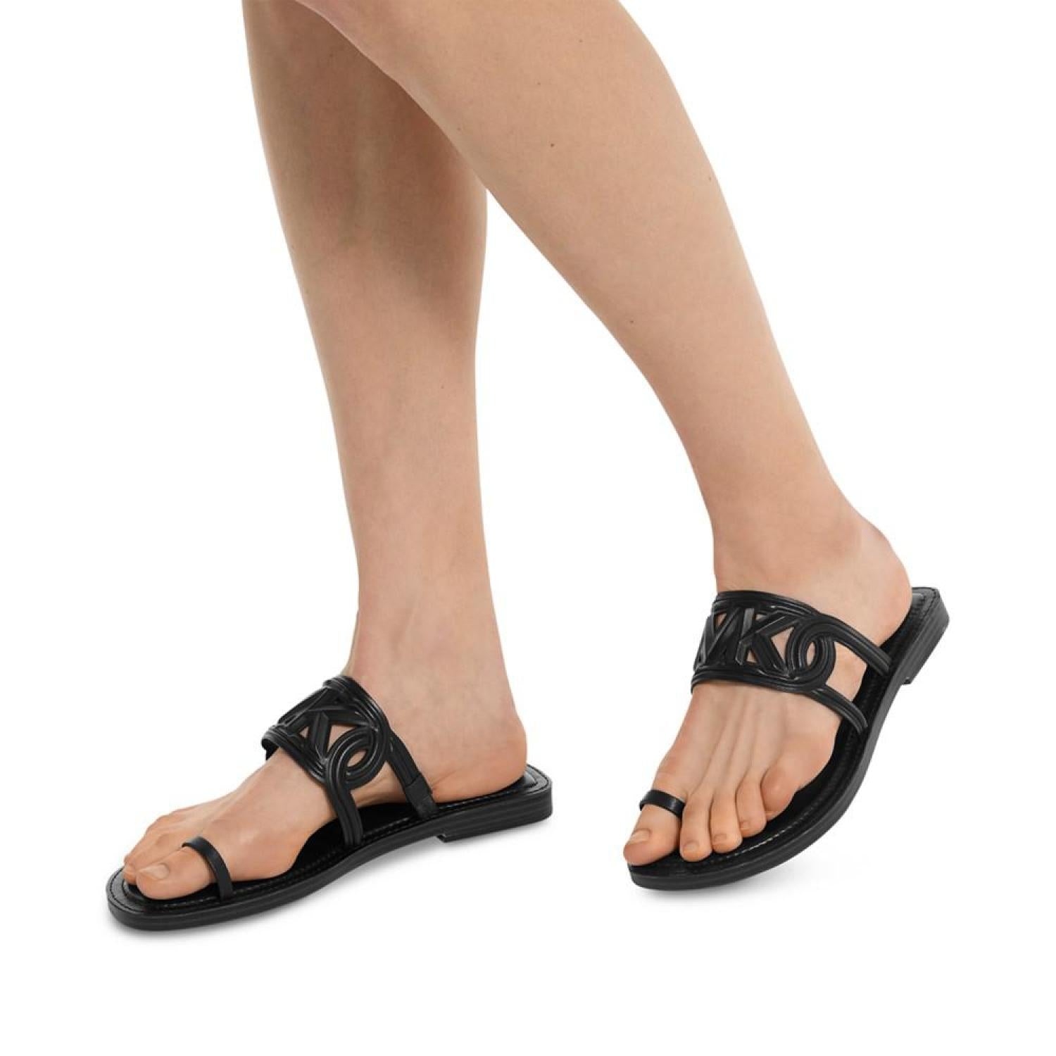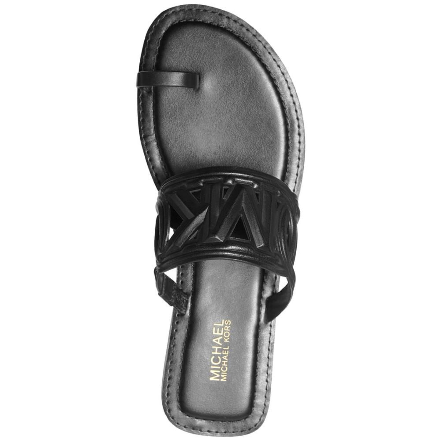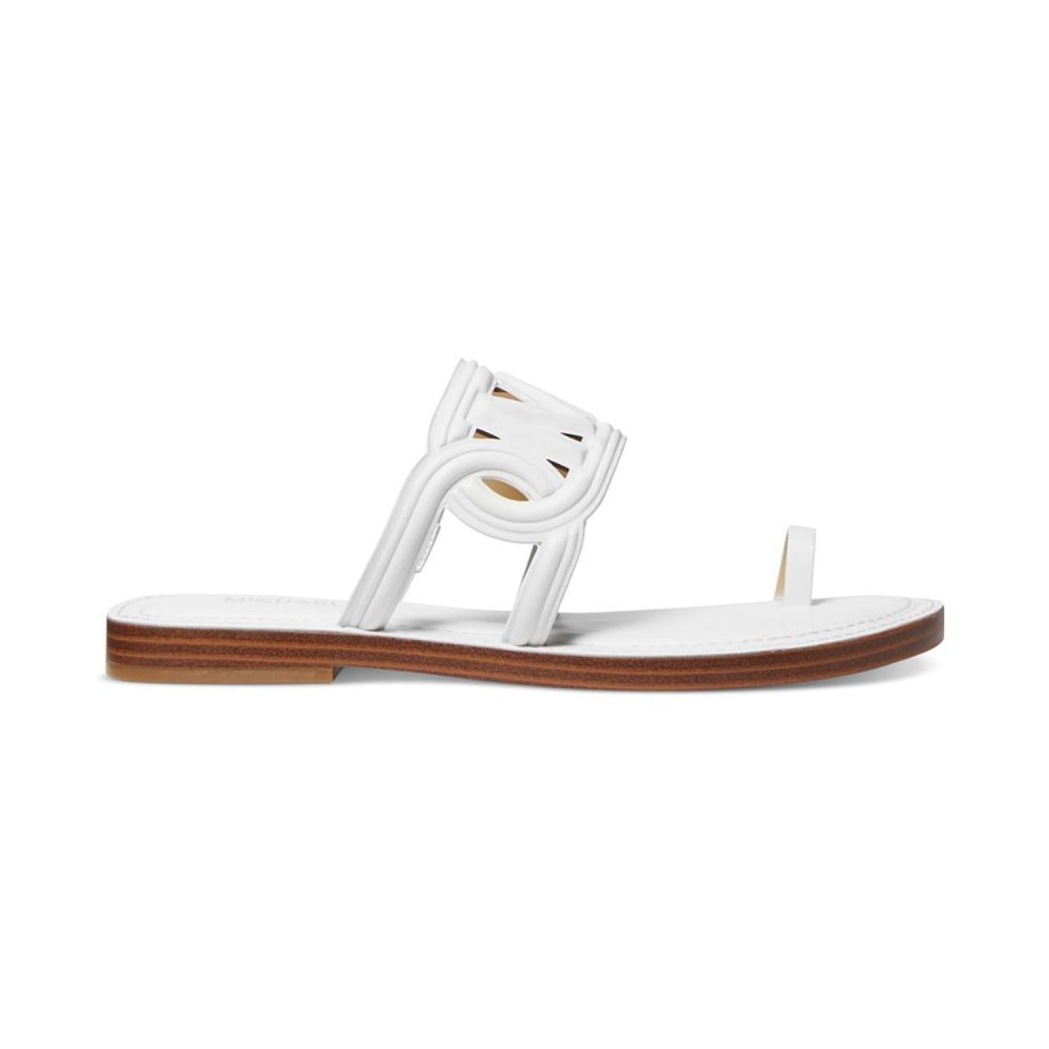 • A catchy cutout logo design and slim toe loop top off the flat-out fabulous look of these Alma slip-on sandals from MICHAEL Michael Kors.