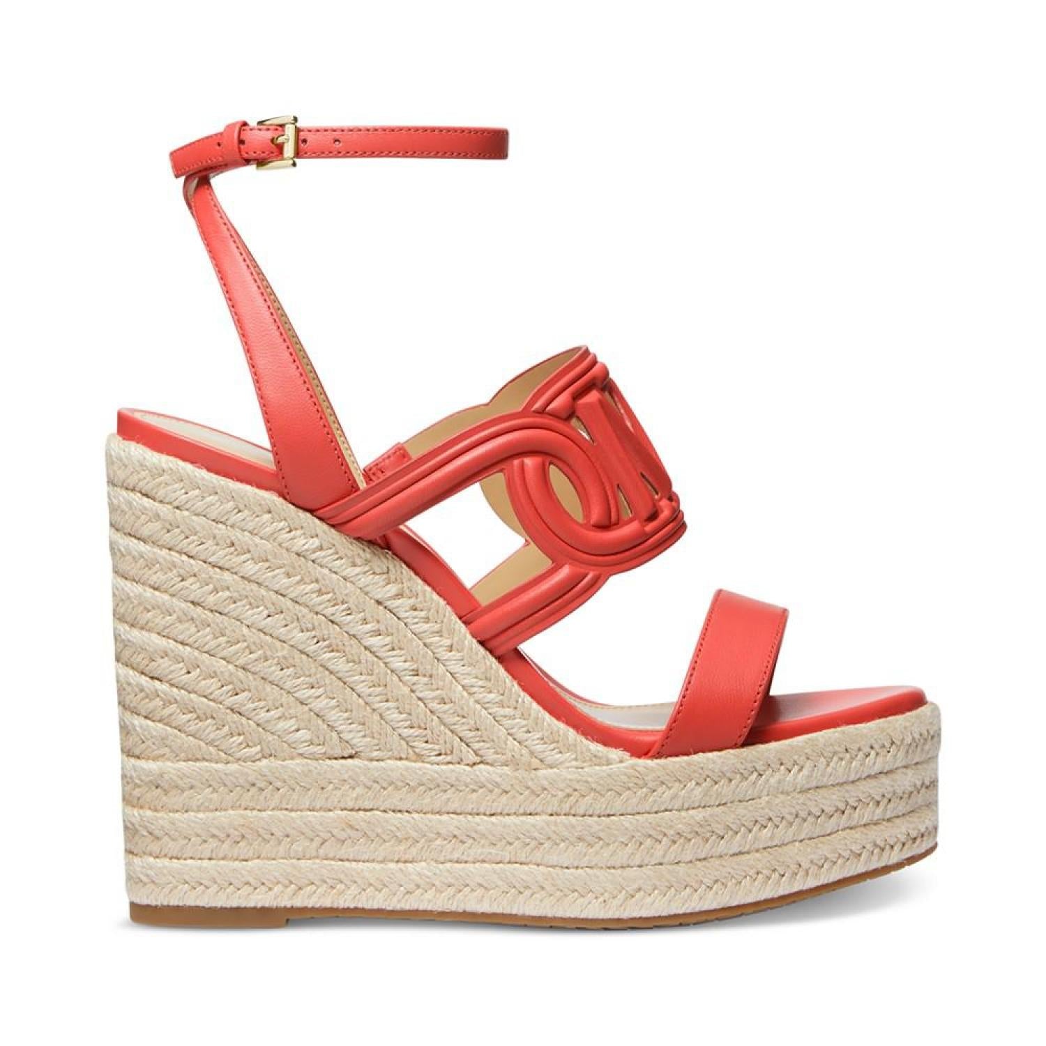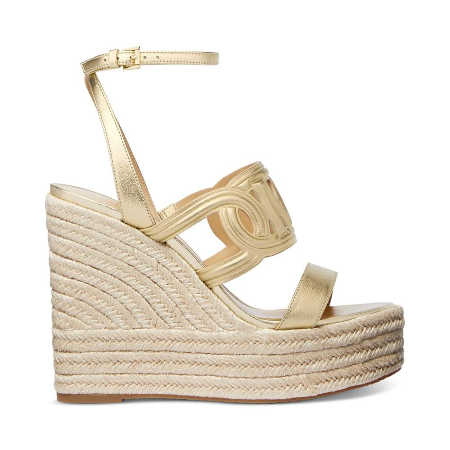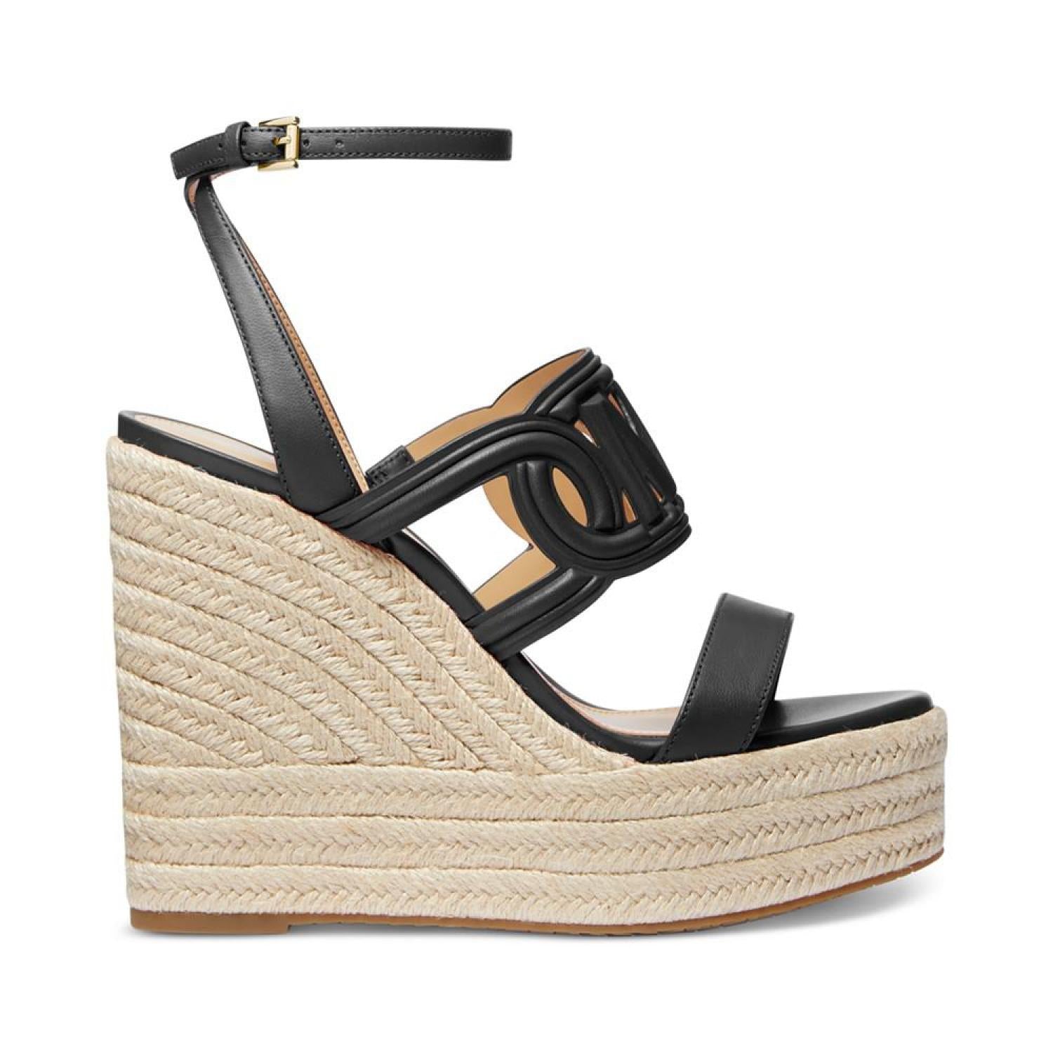 • Cut out for signature style at the strap and covered with jute at the lofty platforms, the Alma sandals step out in style from MICHAEL Michael Kors.