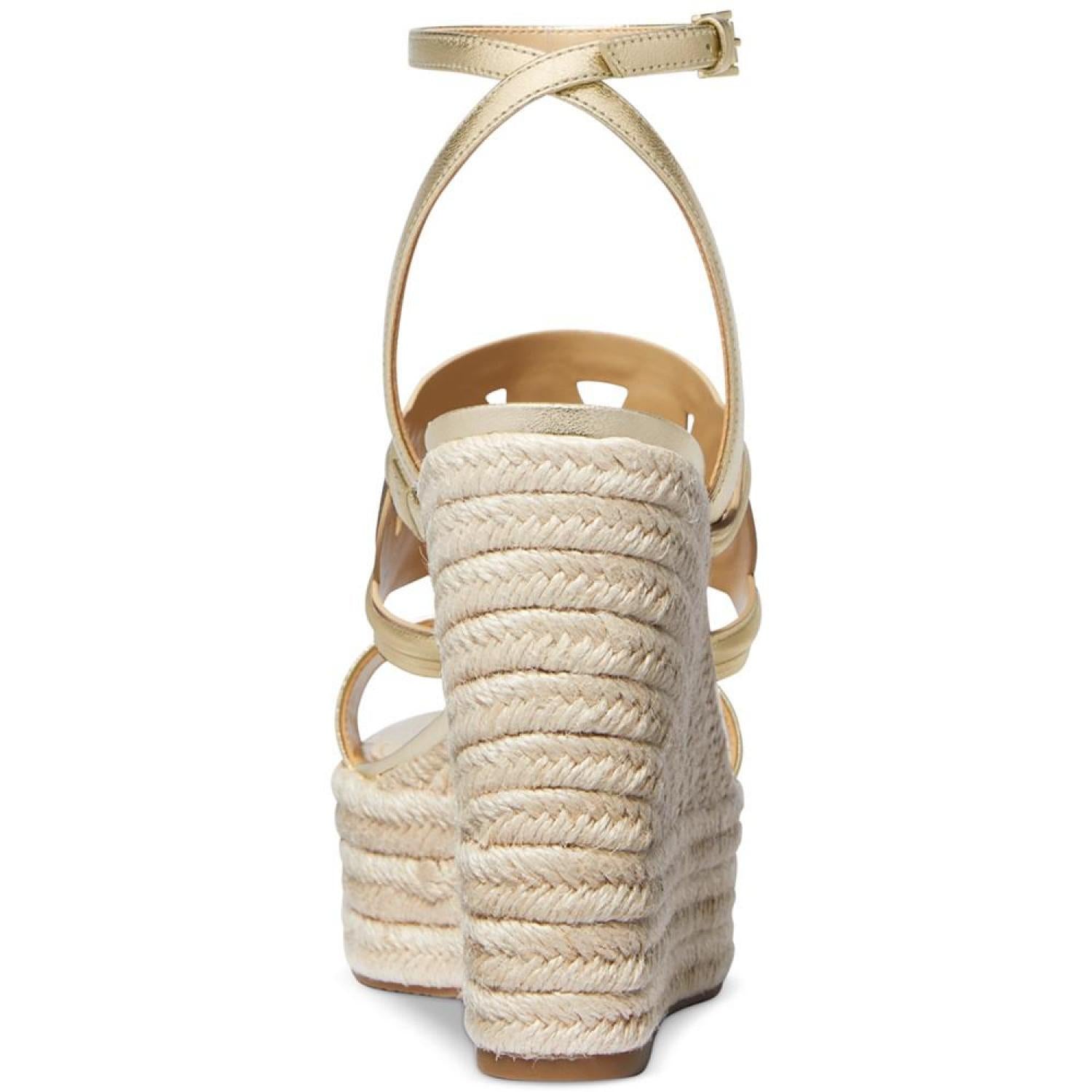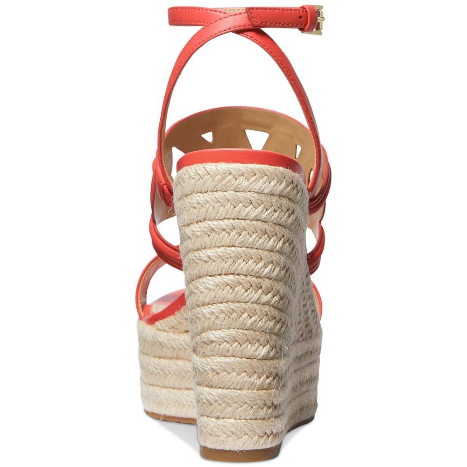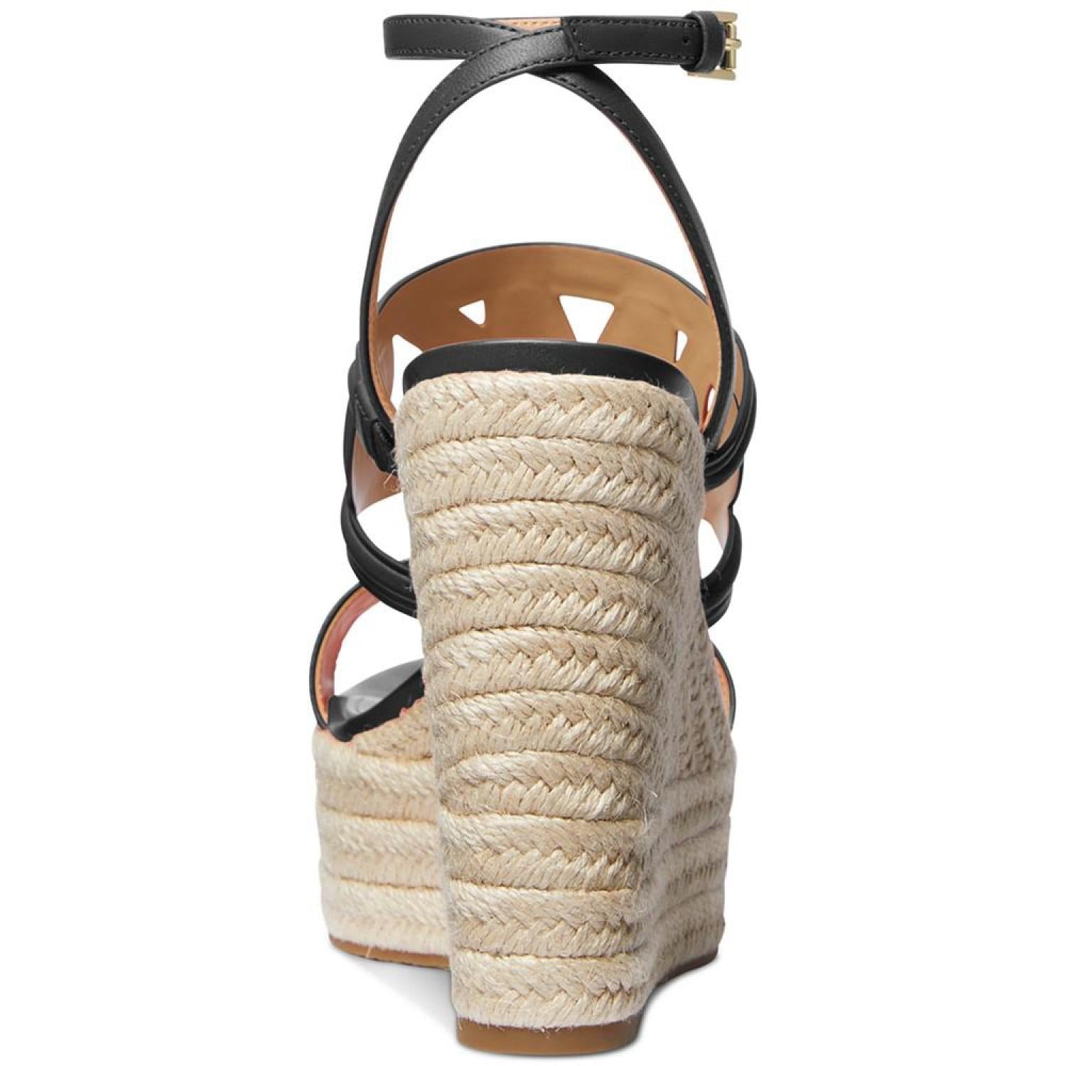 • Cut out for signature style at the strap and covered with jute at the lofty platforms, the Alma sandals step out in style from MICHAEL Michael Kors.