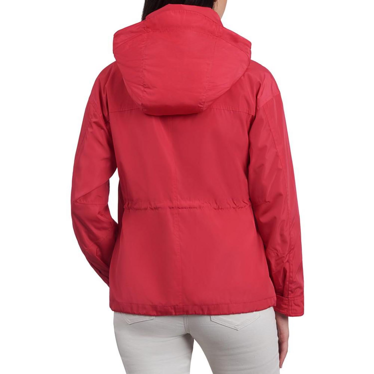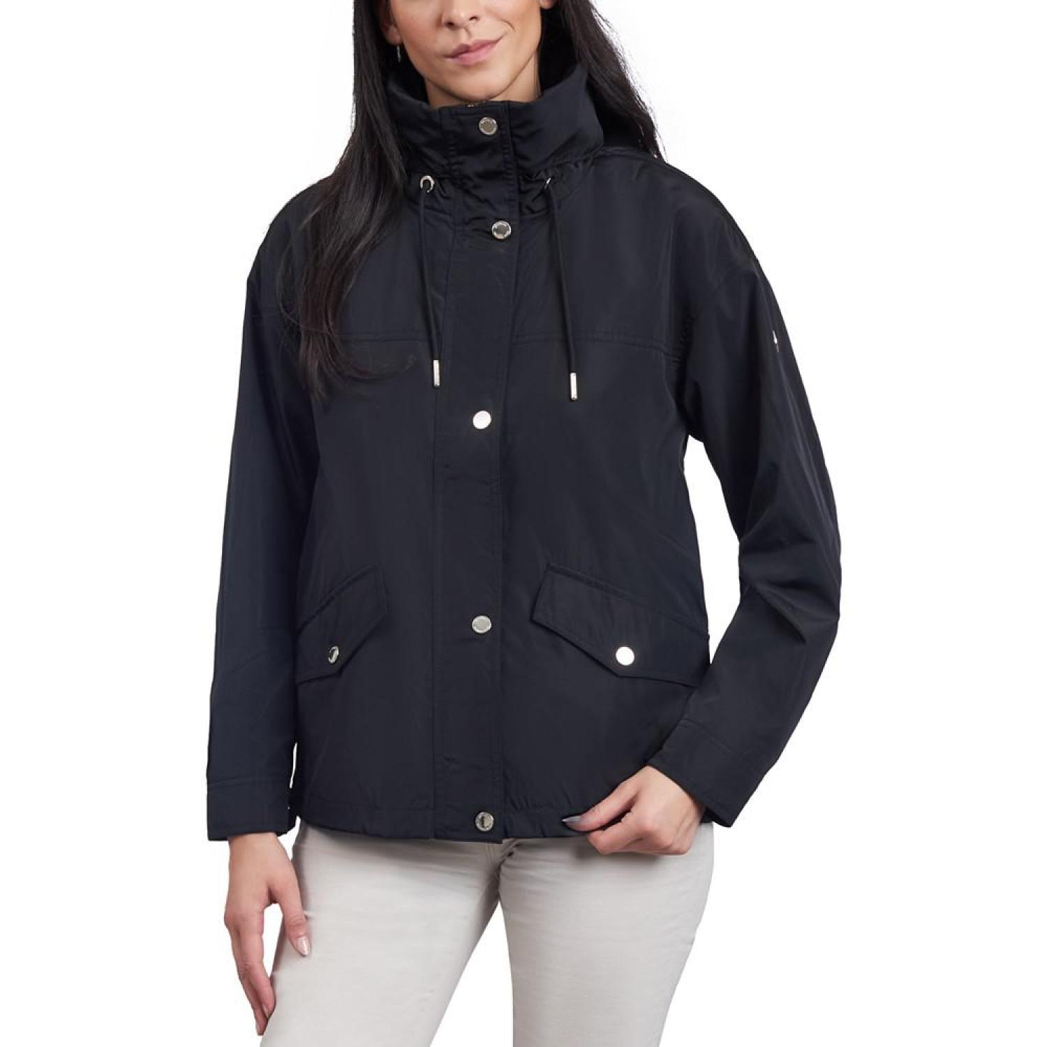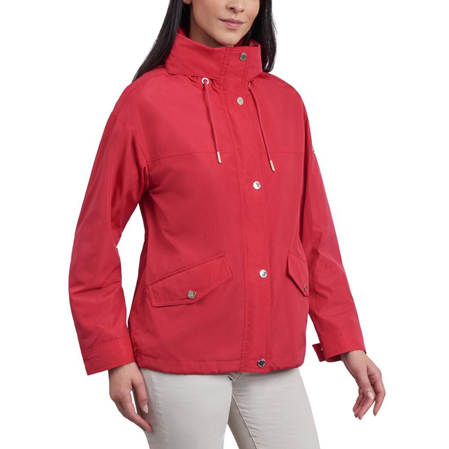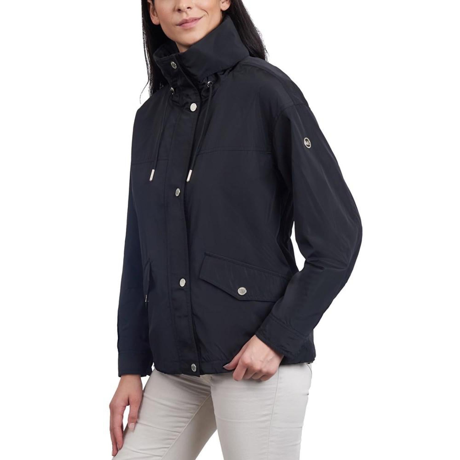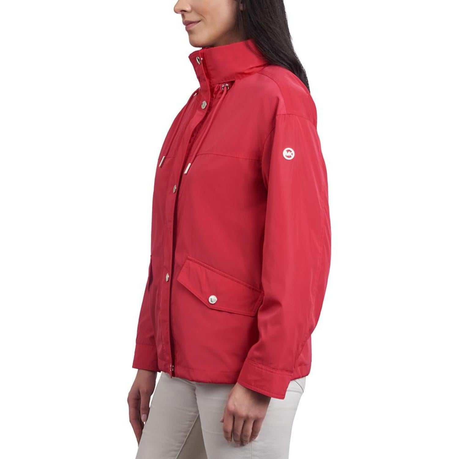 A raincoat with at twist, this stylish pick from MICHAEL Michael Kors features a bomber-style look with a cinched waistline. Approx. model height is 5'7" and she is wearing a size M Approx. 26" long from center back to hem Stand collar with hidden drawstring hood; front zipper closure with snap overlay Cinched at waist Two snap pockets at front Water resistant Lined Shell & lining: polyester Machine wash Imported