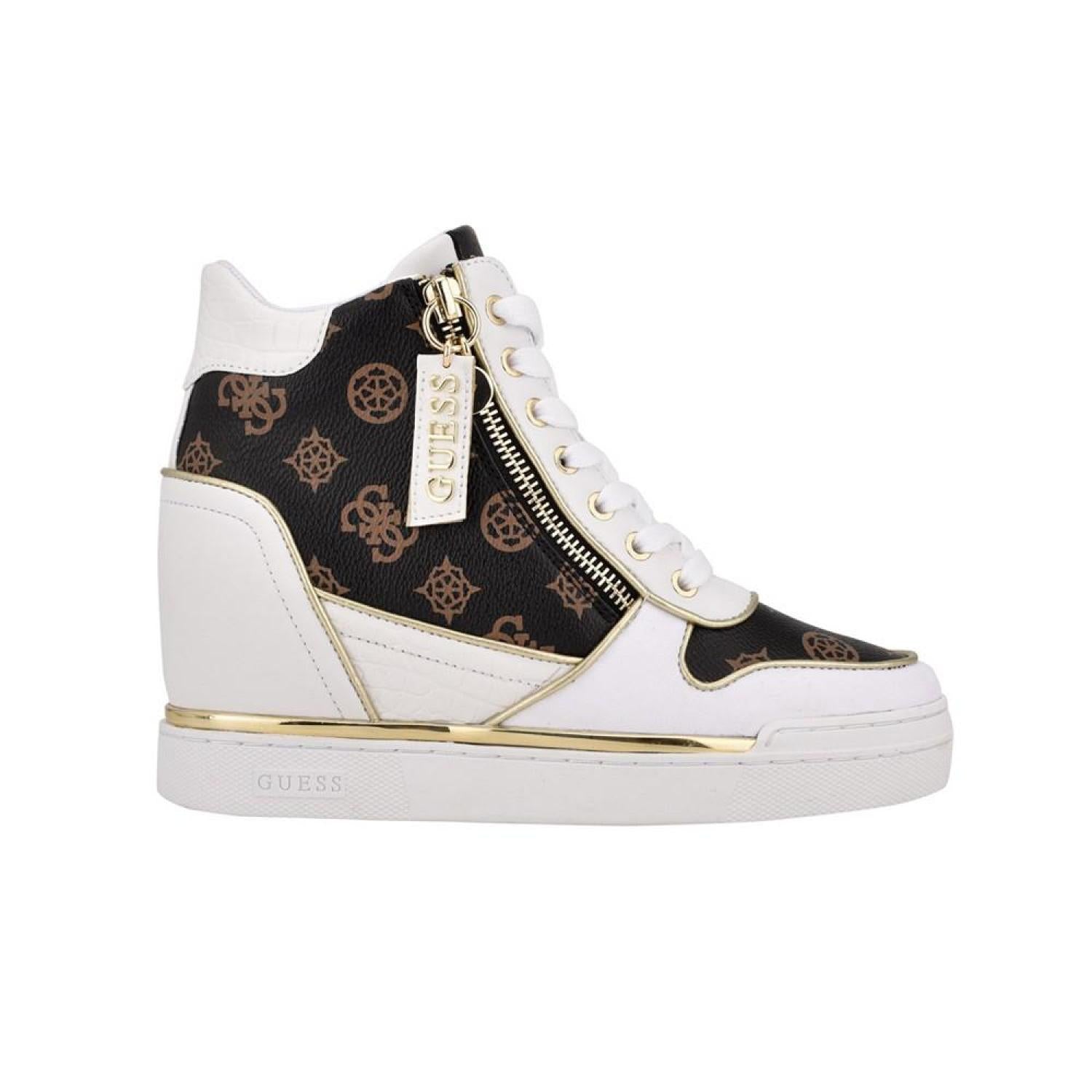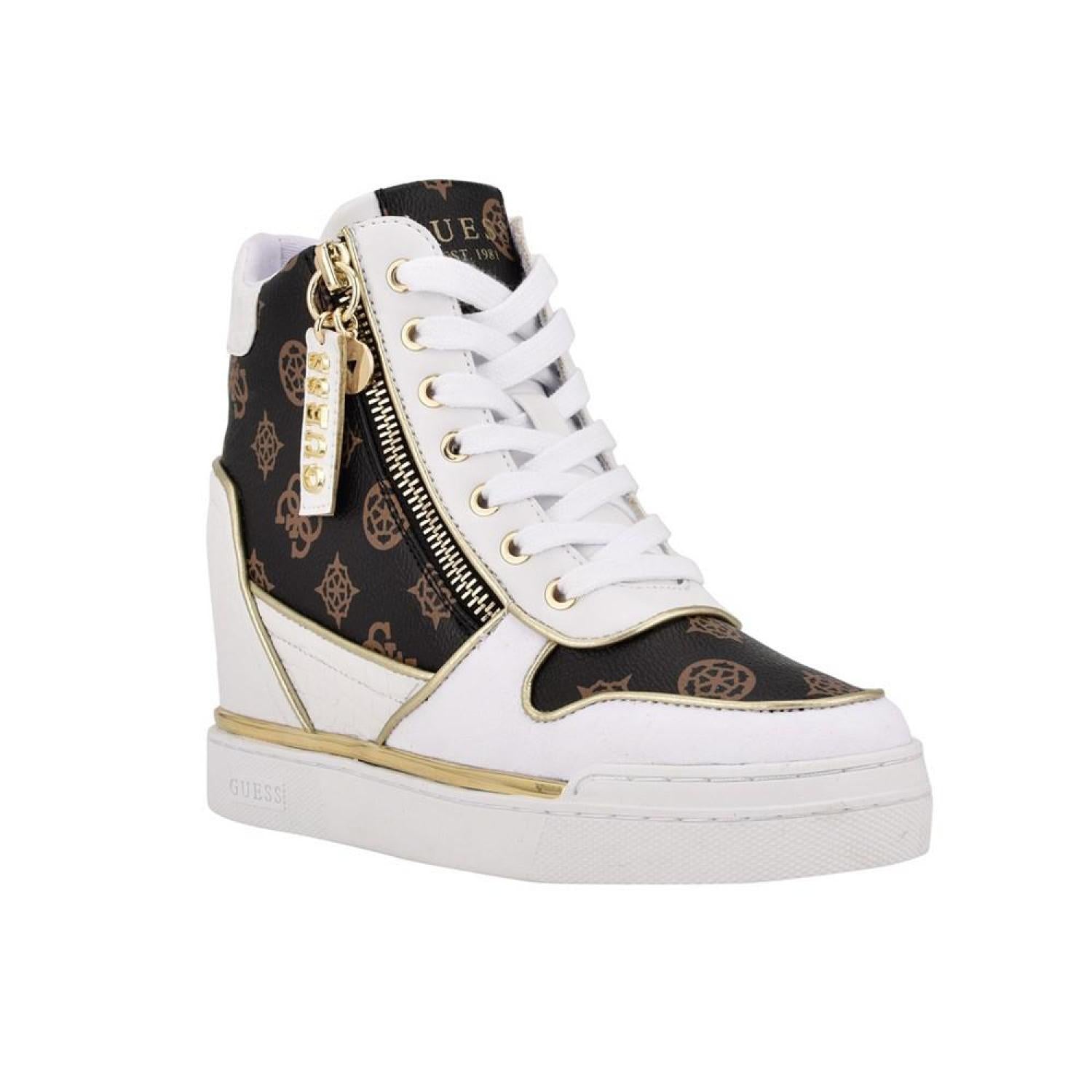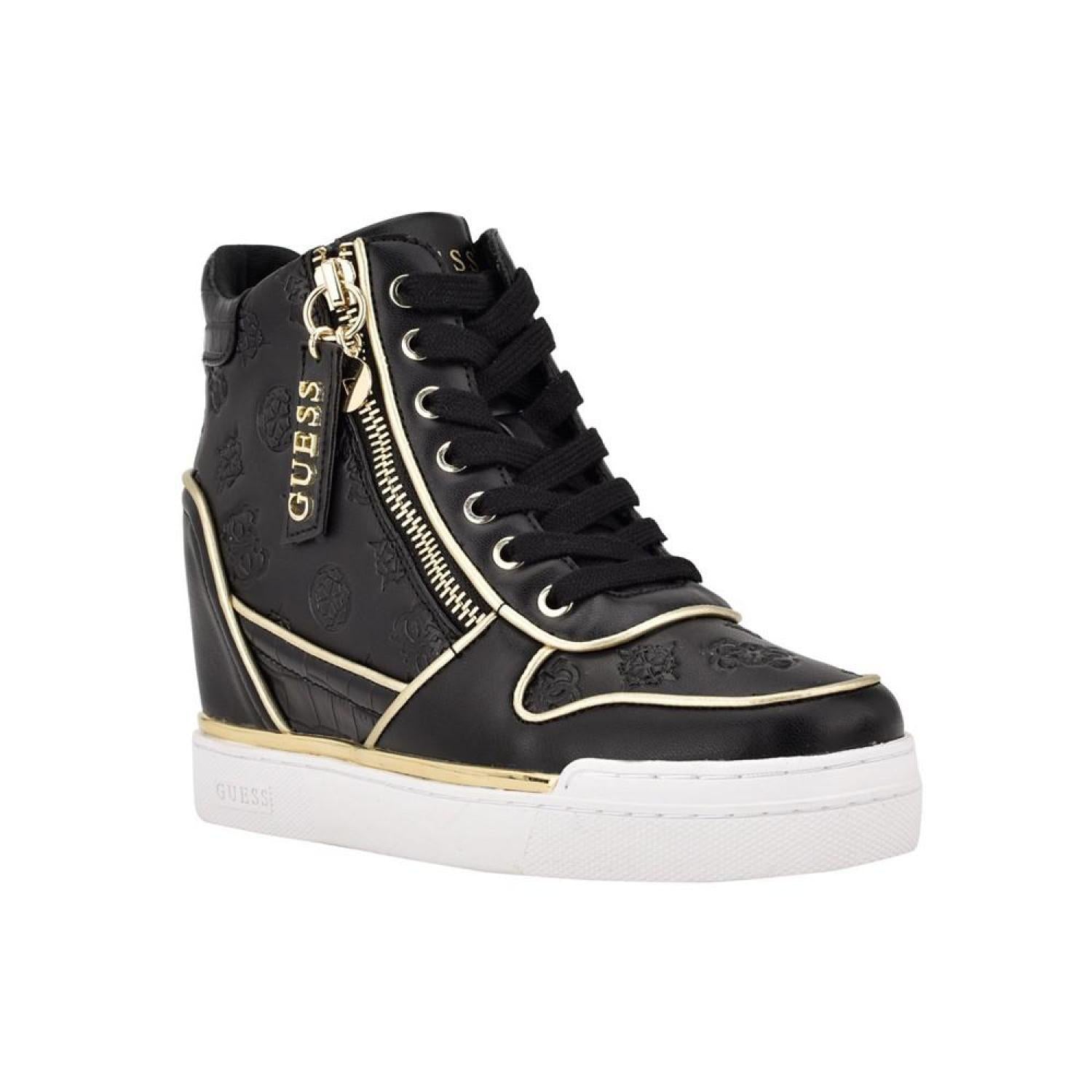 • The Fiora fashion sneaker from GUESS features a wedge construction with a decorative zipper and logo trim.