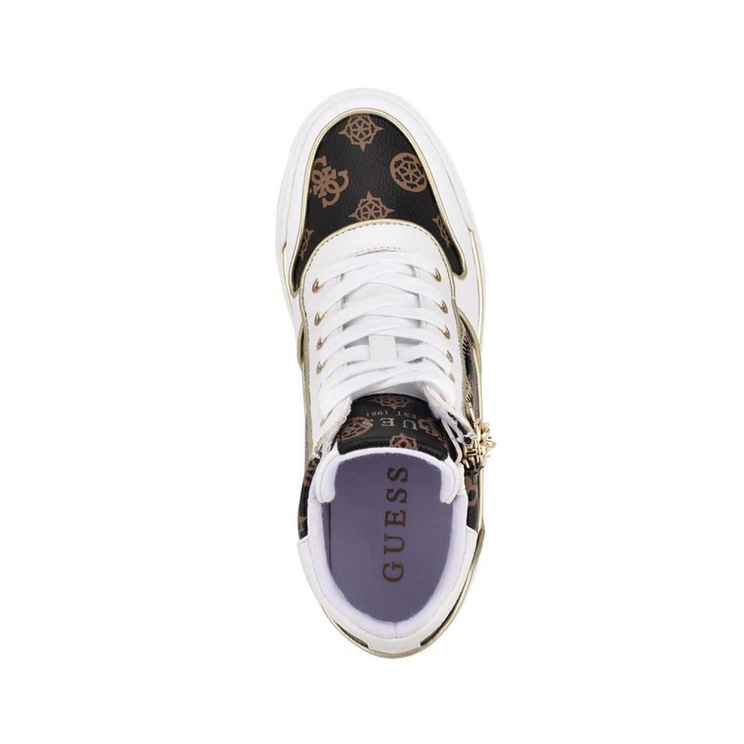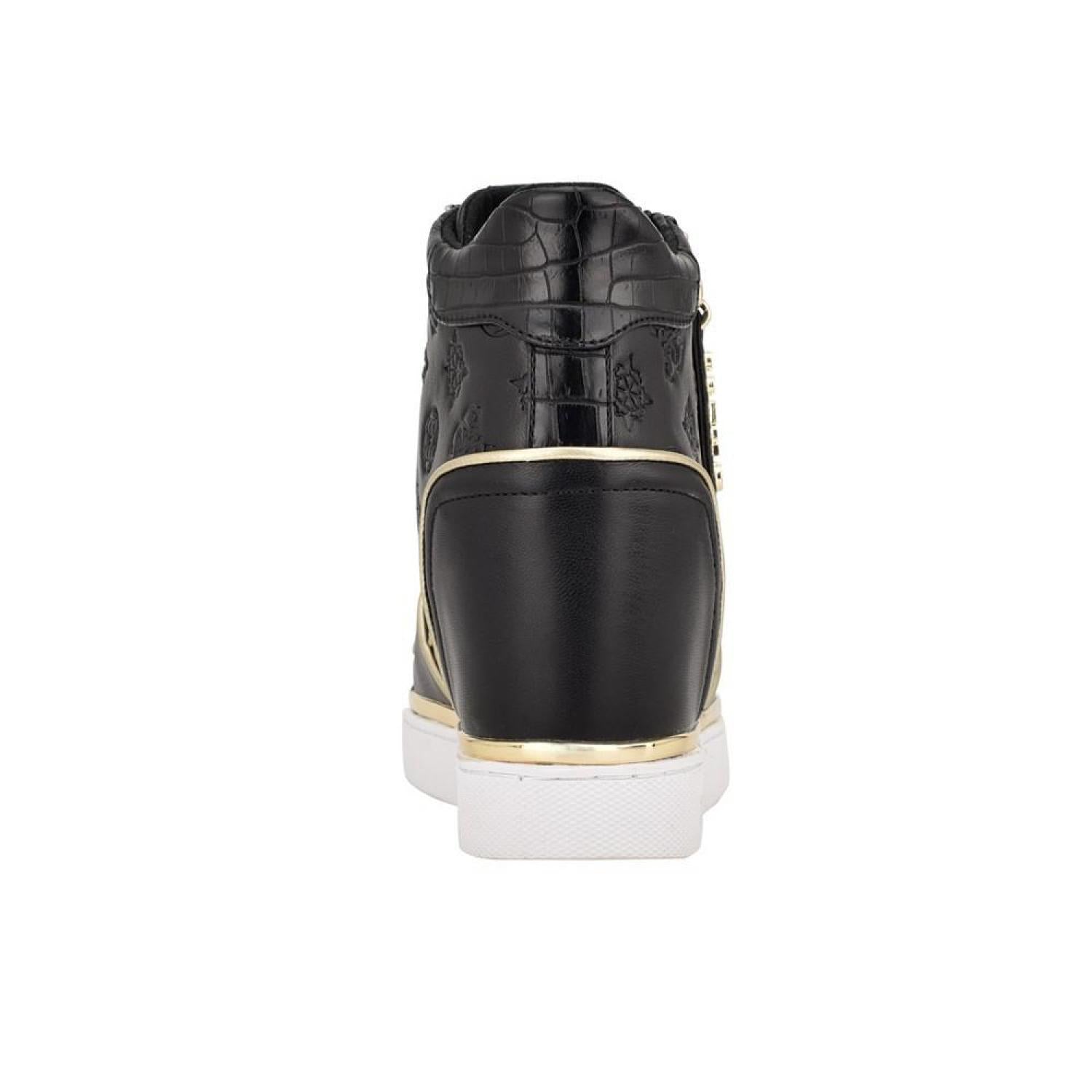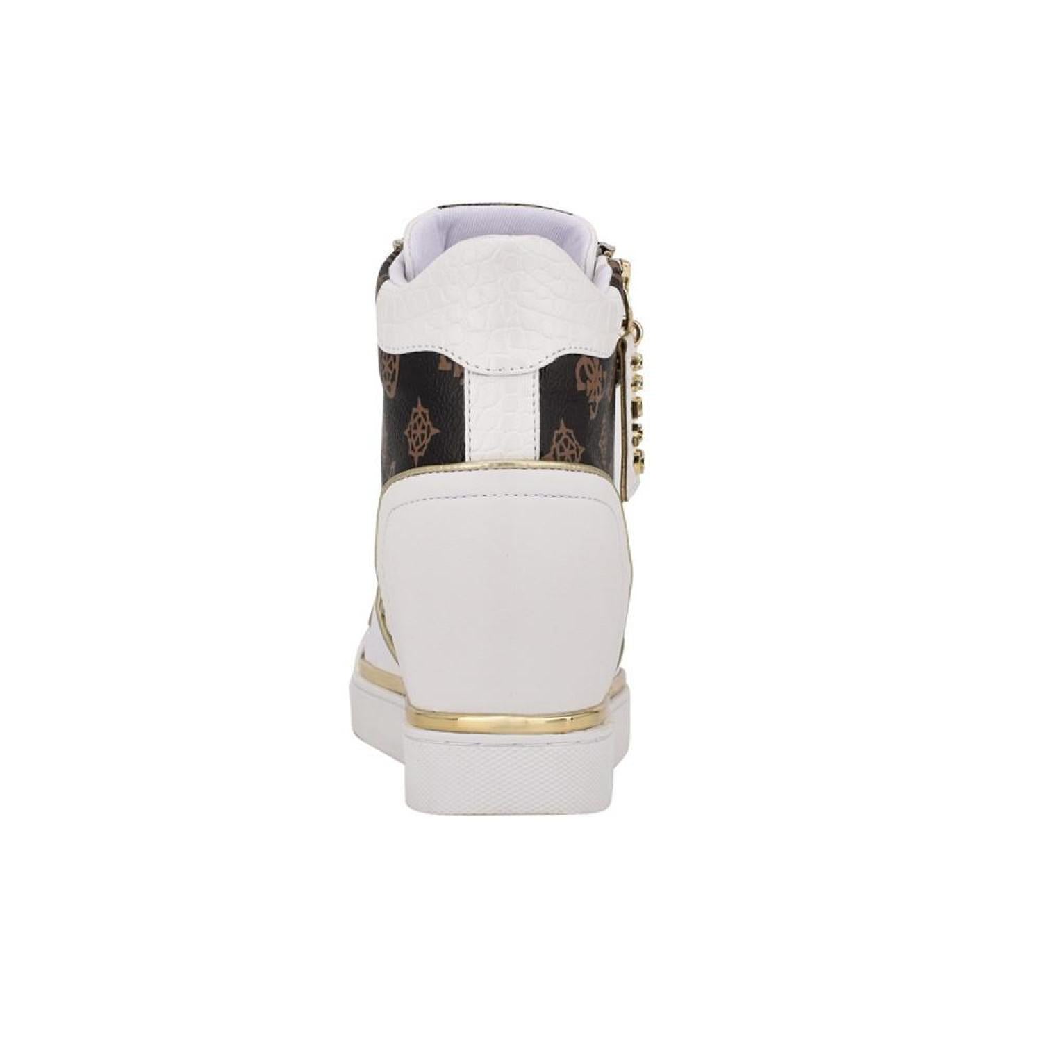 • The Fiora fashion sneaker from GUESS features a wedge construction with a decorative zipper and logo trim.