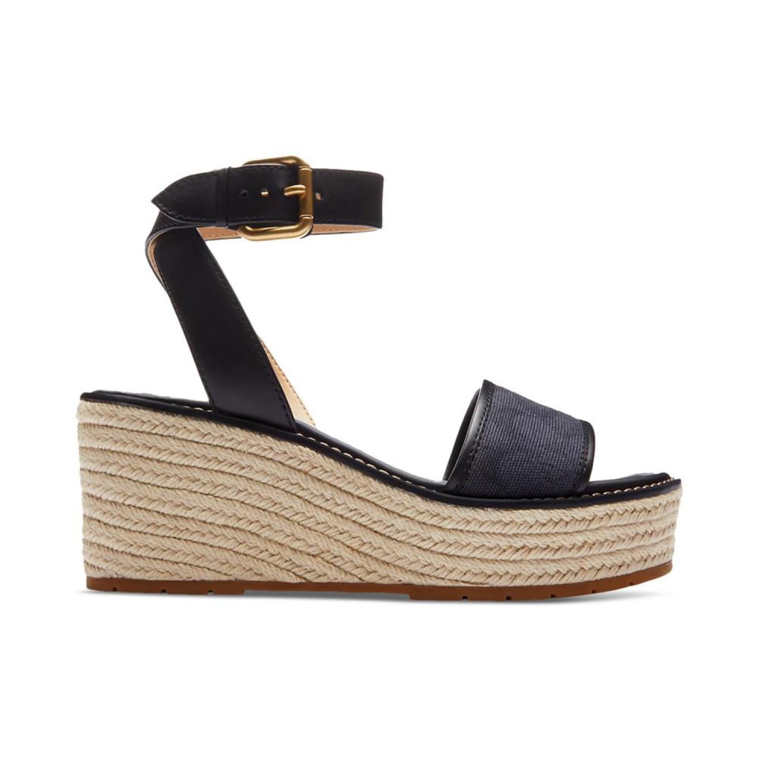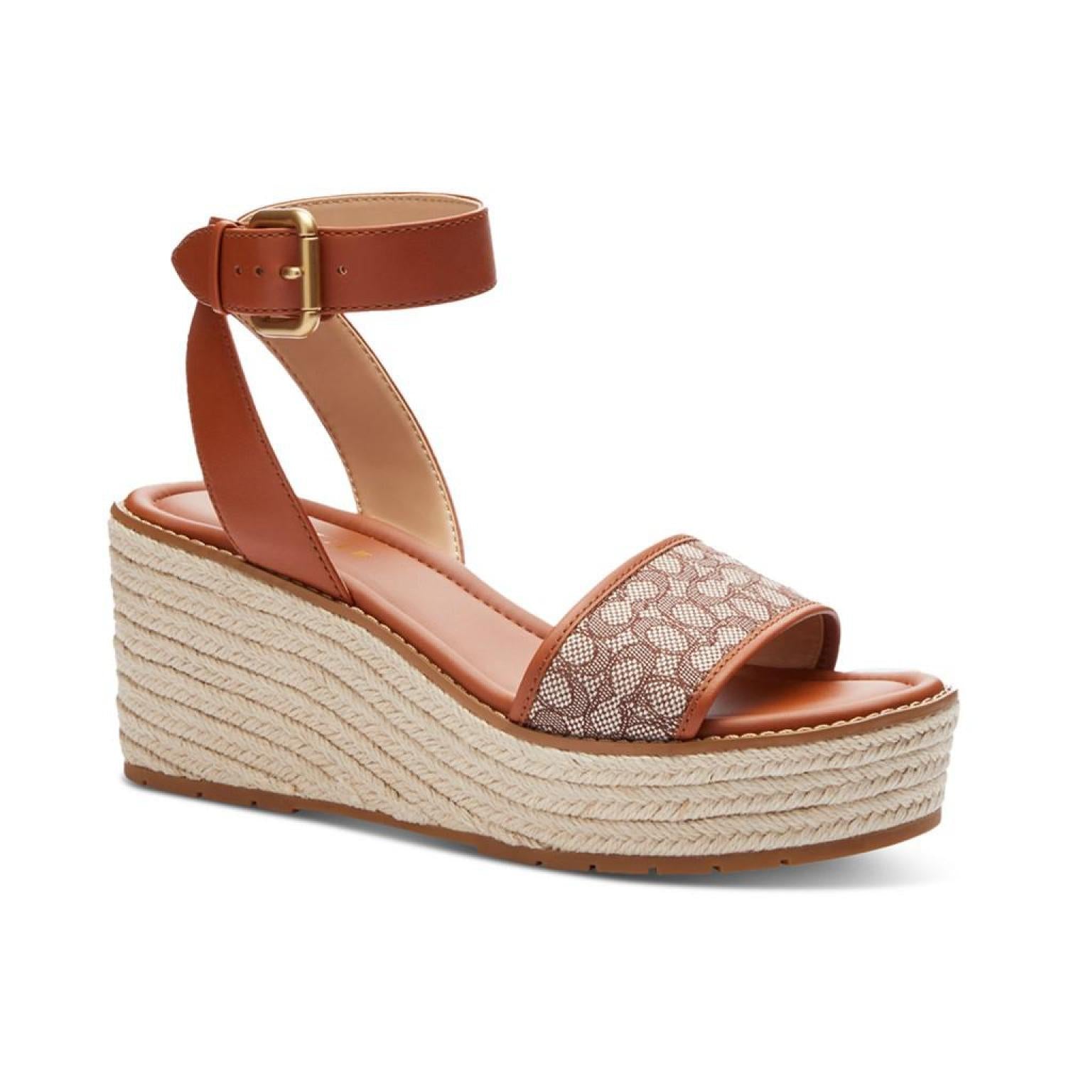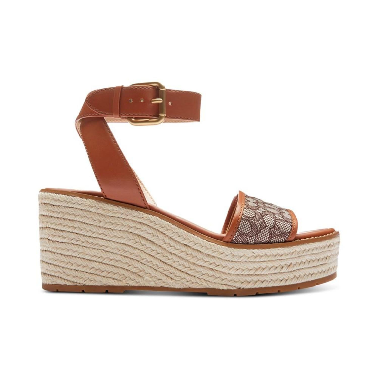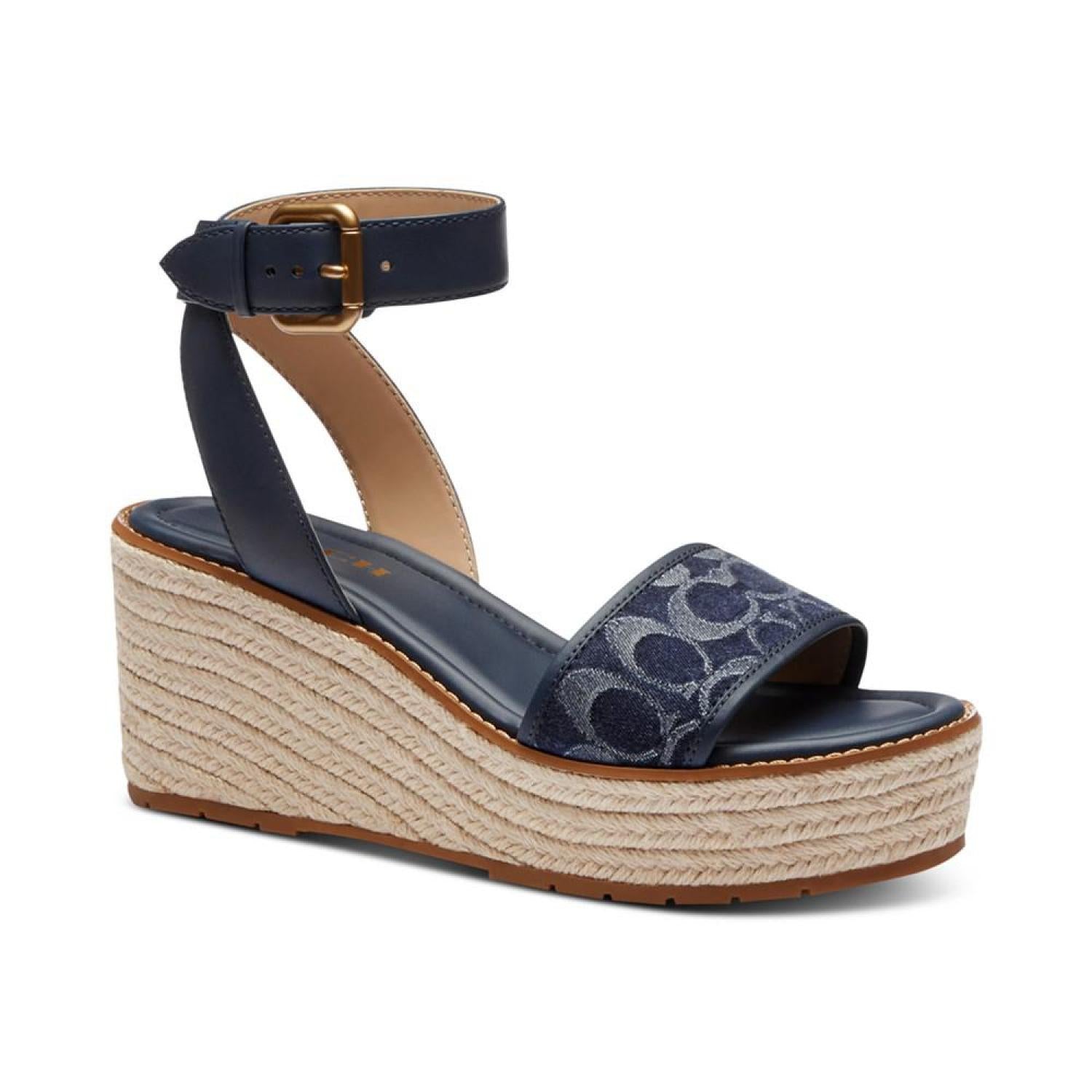 Stylishly C-worthy with signature COACH fabric at the vamp, the Katerine wedge sandals feature braided espadrille platforms. Wedge heel: 2"; platform: 1-1/4" Round toe Adjustable buckle closure Rubber outsole Signature vamp band Crisscross detail at back ankle-strap Braid-covered wedge Runs true to size; order your normal size Upper: jacquard fabric, leather; or denim, leather; lining: manmade Spot clean Imported