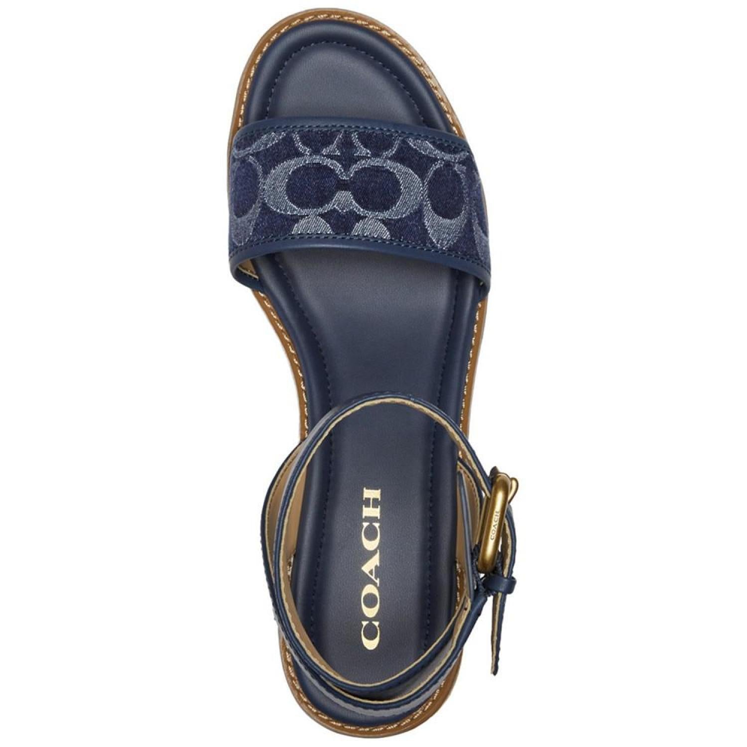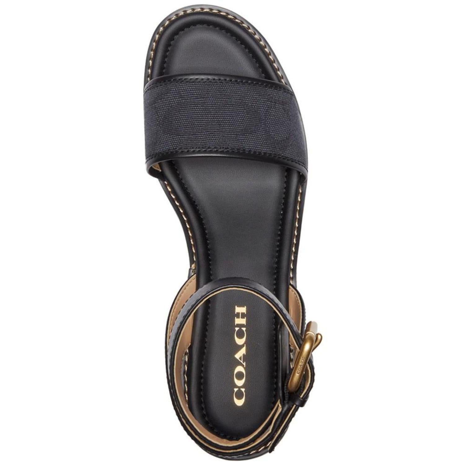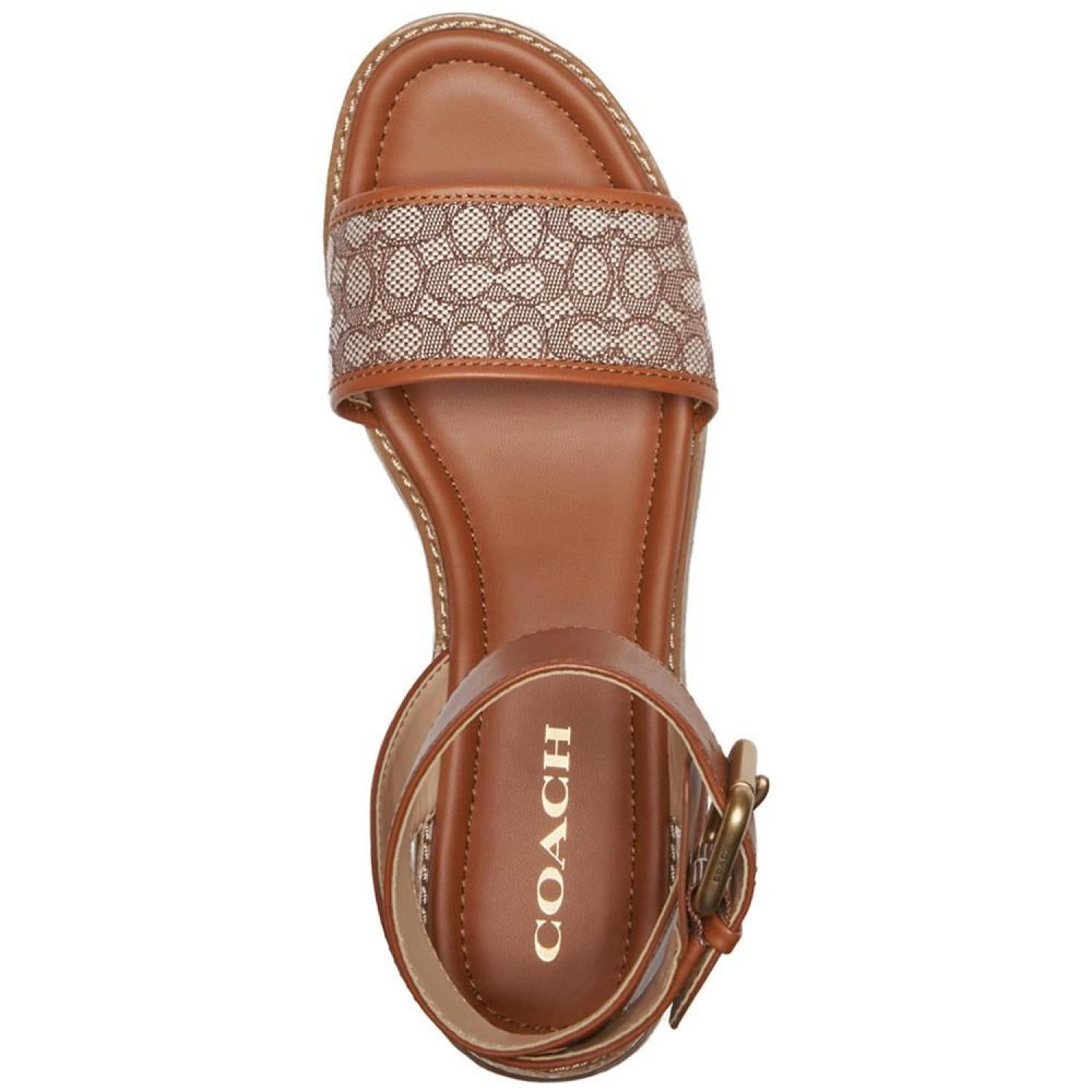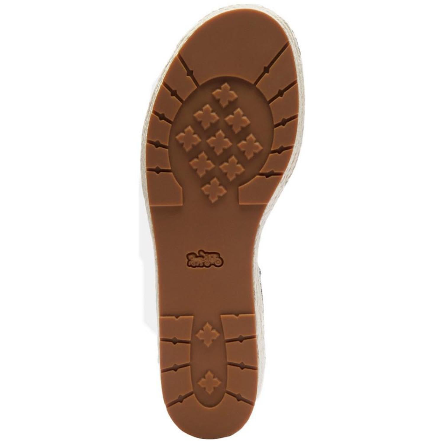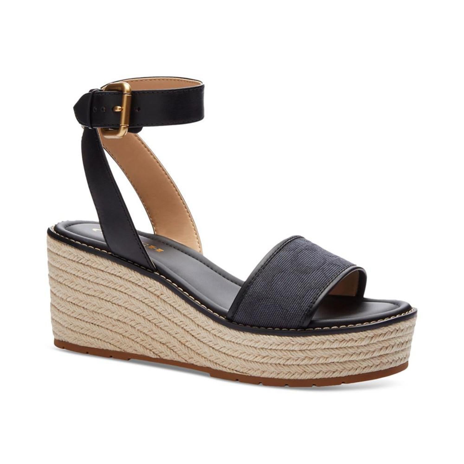 Stylishly C-worthy with signature COACH fabric at the vamp, the Katerine wedge sandals feature braided espadrille platforms. Wedge heel: 2"; platform: 1-1/4" Round toe Adjustable buckle closure Rubber outsole Signature vamp band Crisscross detail at back ankle-strap Braid-covered wedge Runs true to size; order your normal size Upper: jacquard fabric, leather; or denim, leather; lining: manmade Spot clean Imported