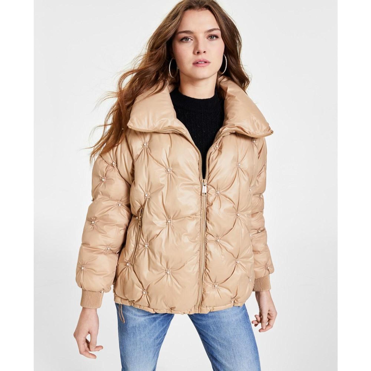GUESS keeps you warm in comfort and style with this zip-front puffer jacket, featuring studded embellishments throughout.