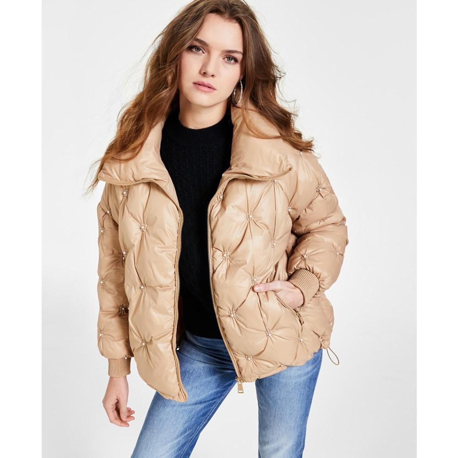 • GUESS keeps you warm in comfort and style with this zip-front puffer jacket, featuring studded embellishments throughout.