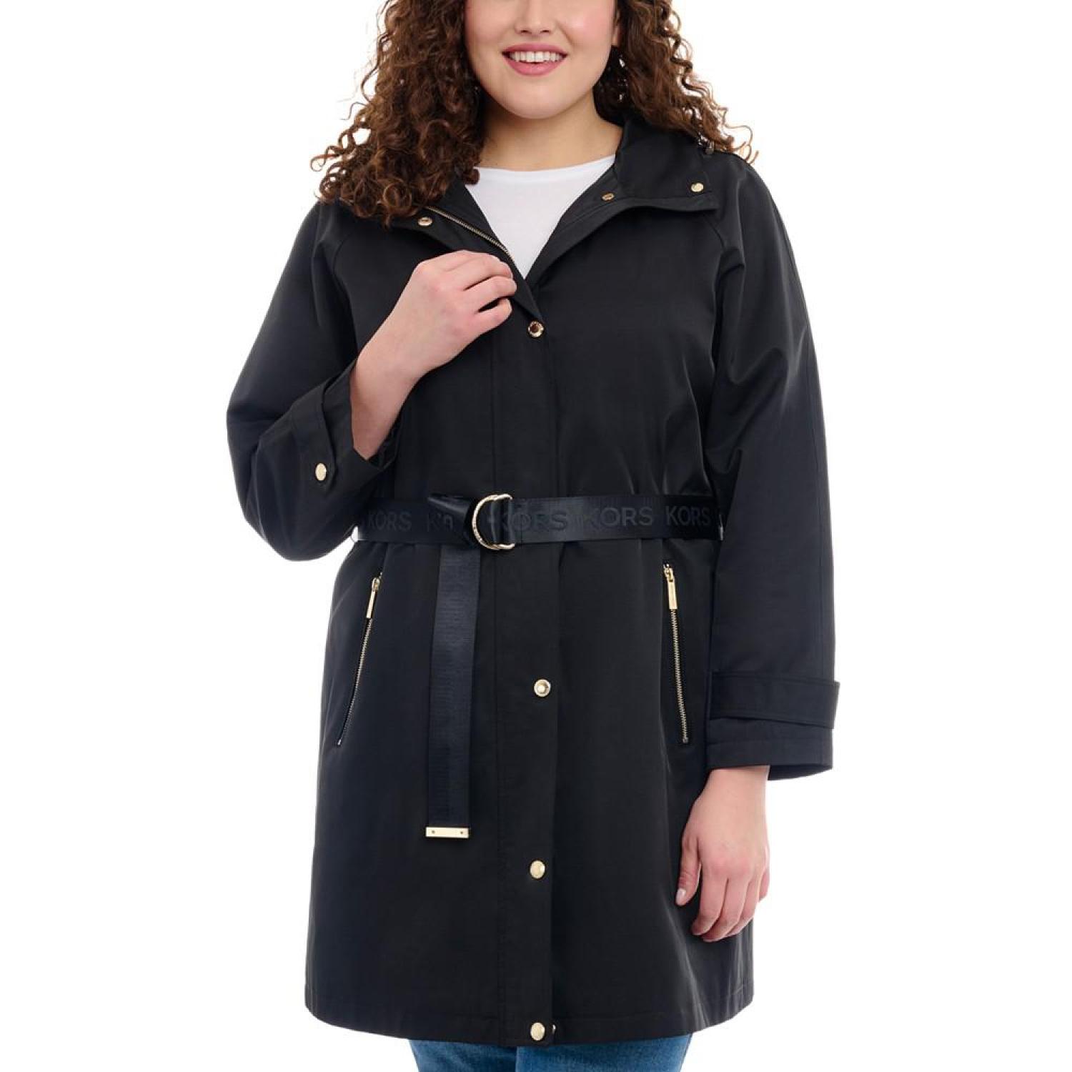 A chic logo belt with D-ring hardware defines the waistline of this hooded plus size trench coat from MICHAEL Michael Kors.