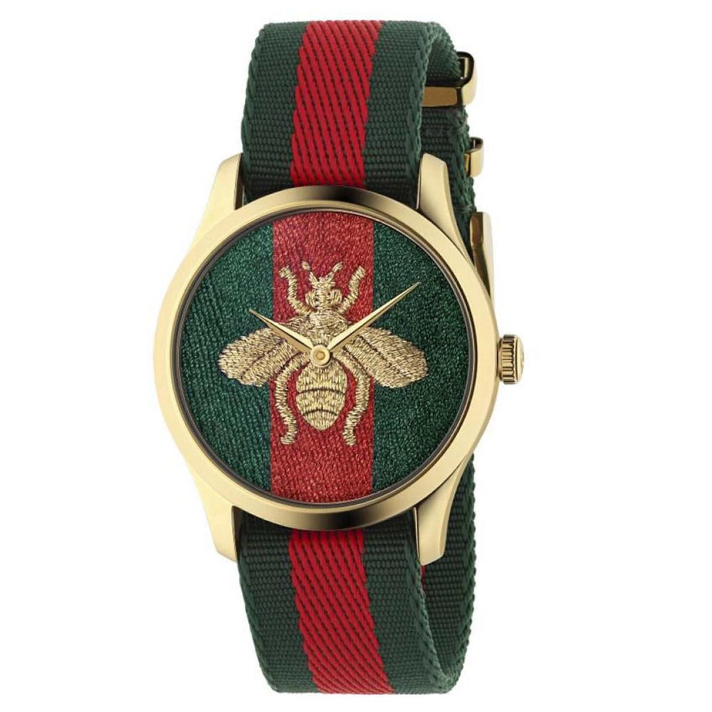 • A true style icon, this Swiss G-Timeless timepiece is rich in Gucci house codes, from the red and green striped strap to the iconic Bee. Style #YA126487B