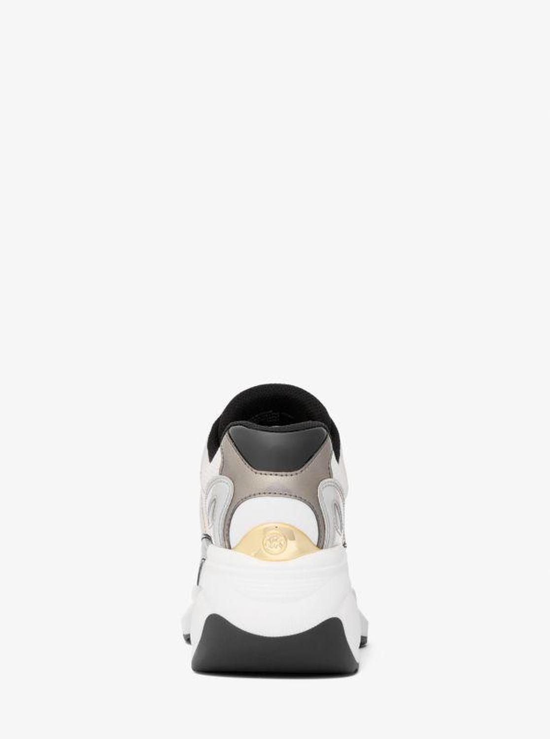 • The Zuma trainer goes for bold. Defined by exaggerated rubber soles, they feature an eye-catching mix of color-blocked metallic and mesh panels. For an unexpected pairing, wear them with an oversized blazer and pant set.